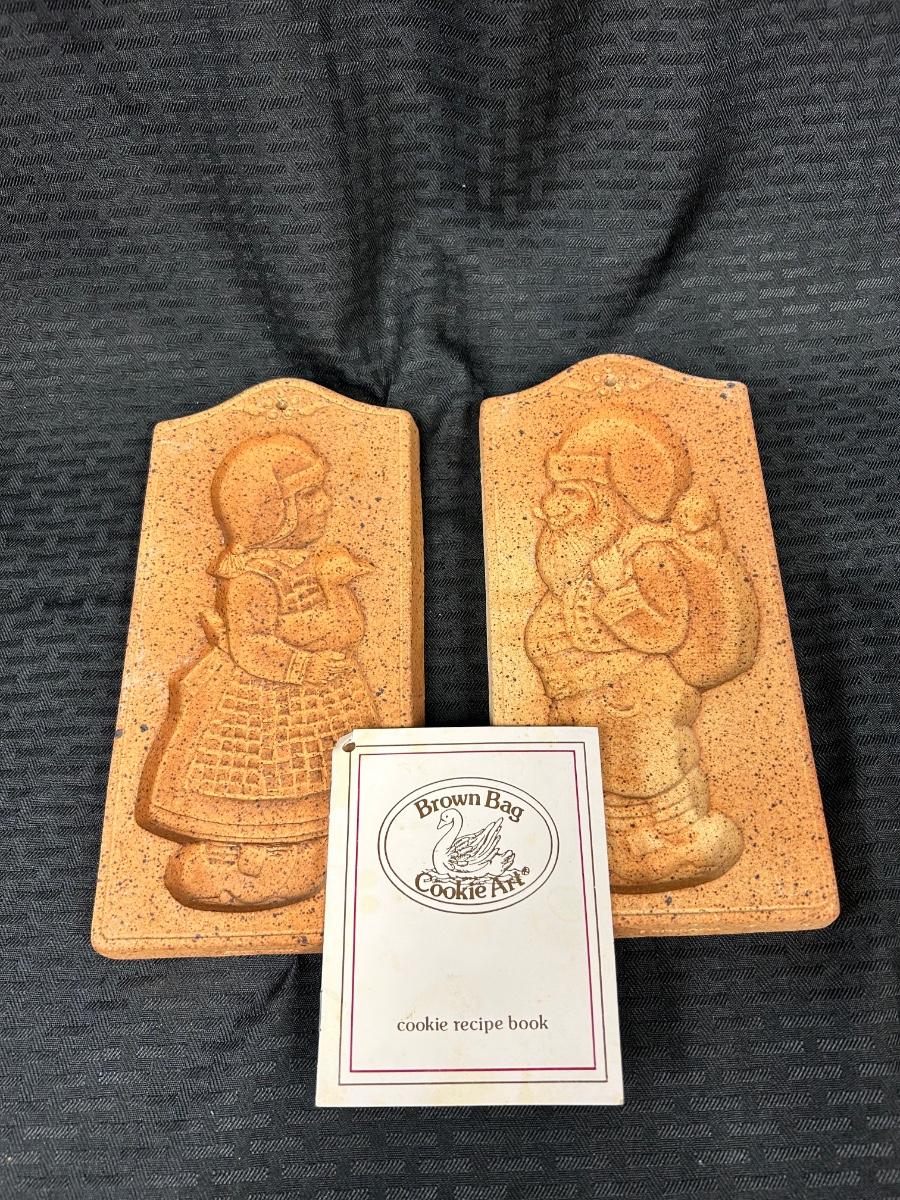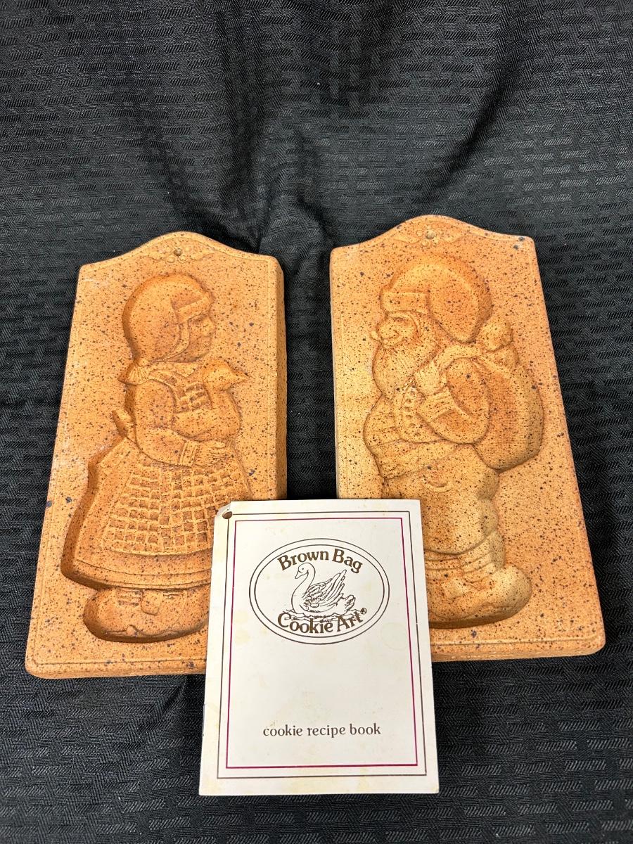 Pair of Brown Bag Cookie Art Stoneware Dessert Molds Denmark. In good condition, come with instruction paper.