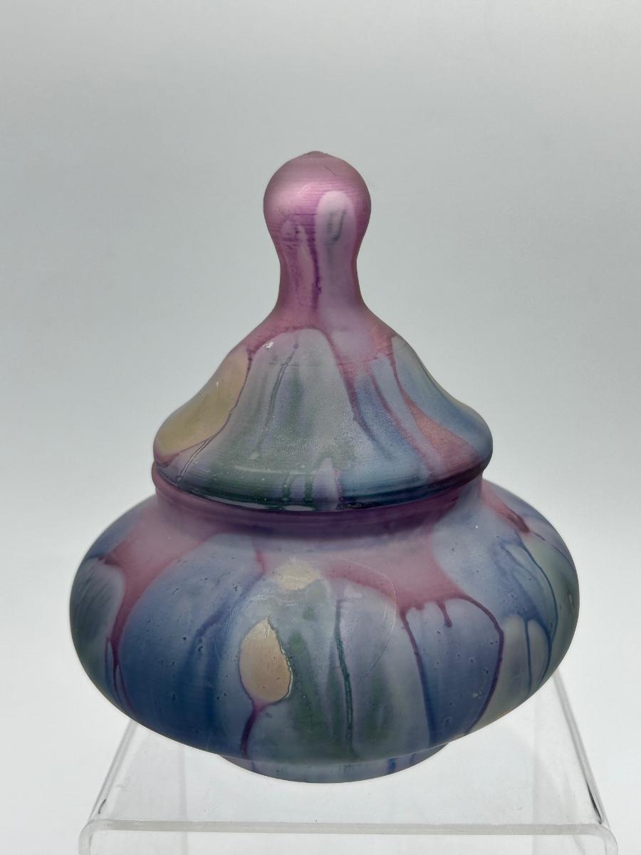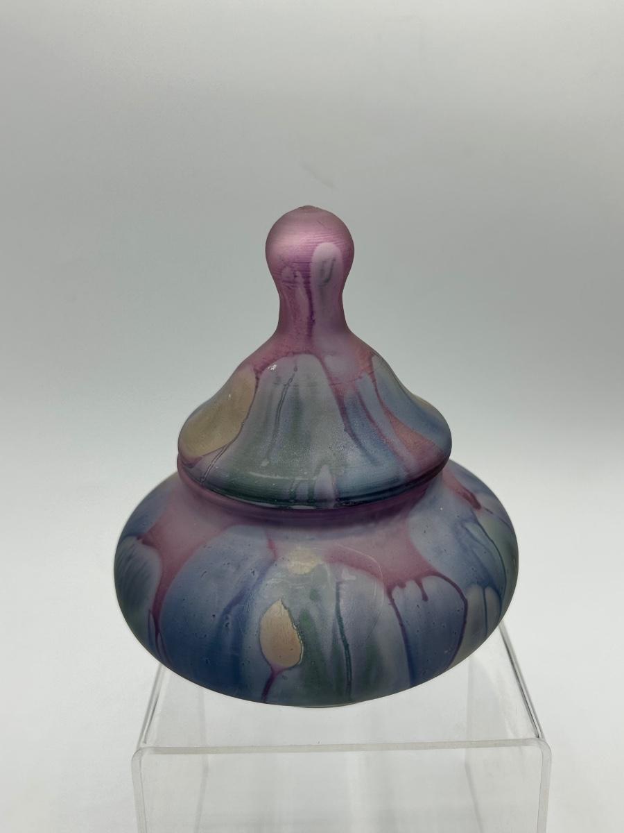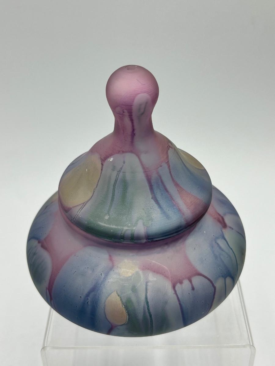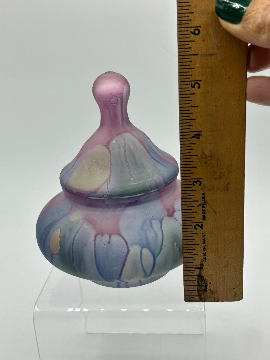 Retro Abstract Color Drip Apothecary Lidded Jar Trinket Dish Rueven Hand Painted Nouveau Art Glass Company