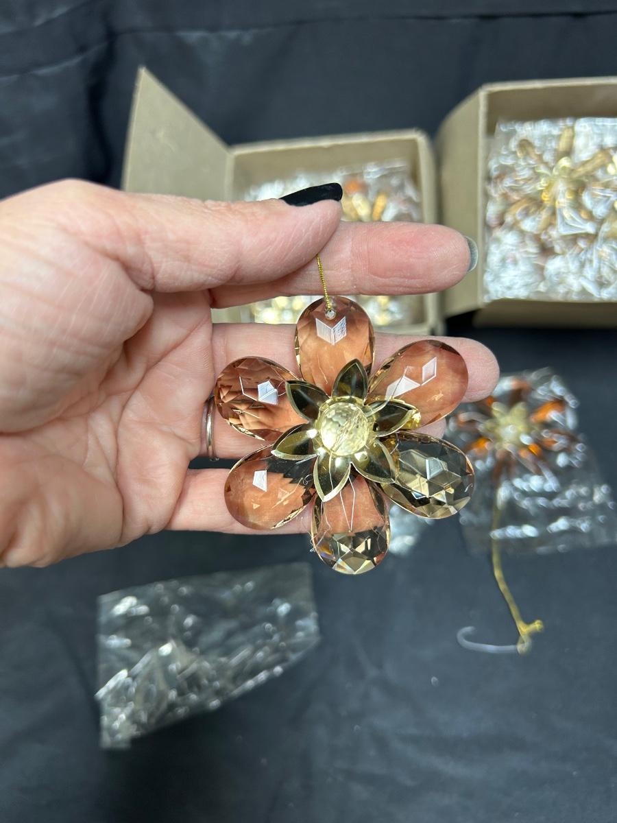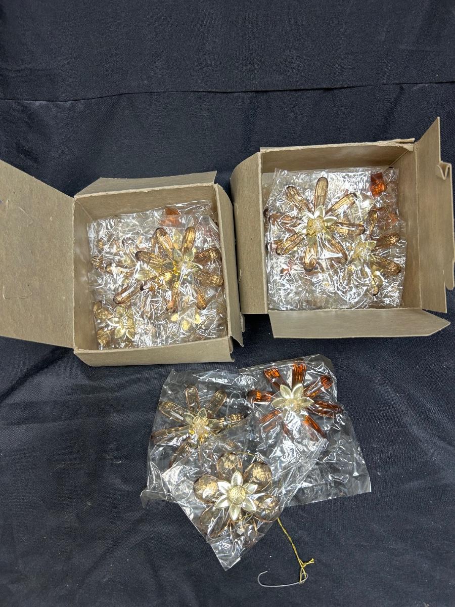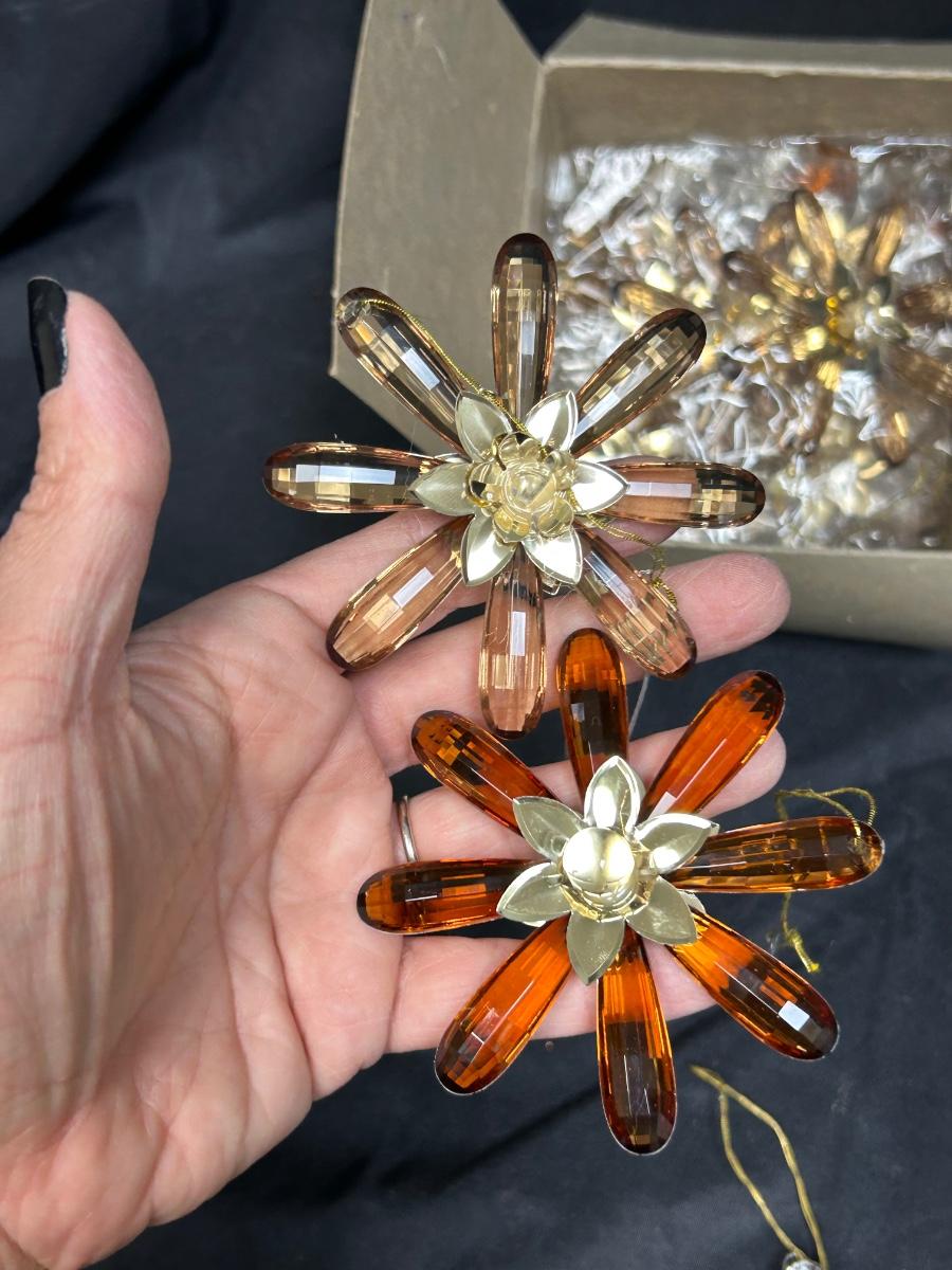 Vintage Plastic Prism Faceted Bead Flower Ornaments Amber Gold. In good condition. They look to be unused, individually wrapped in plastic bag. Two colors with multiple variations. About 2 dozen total in two boxes.