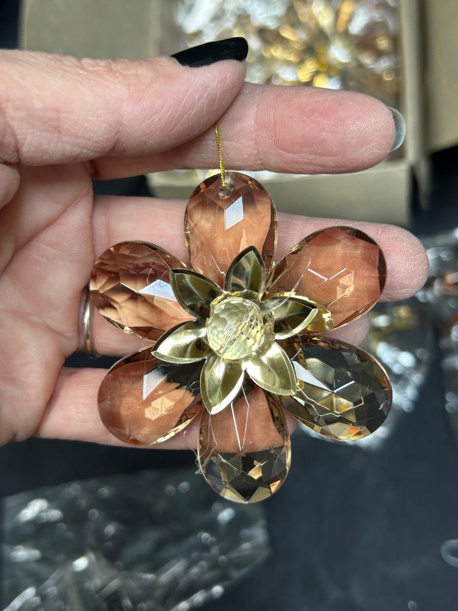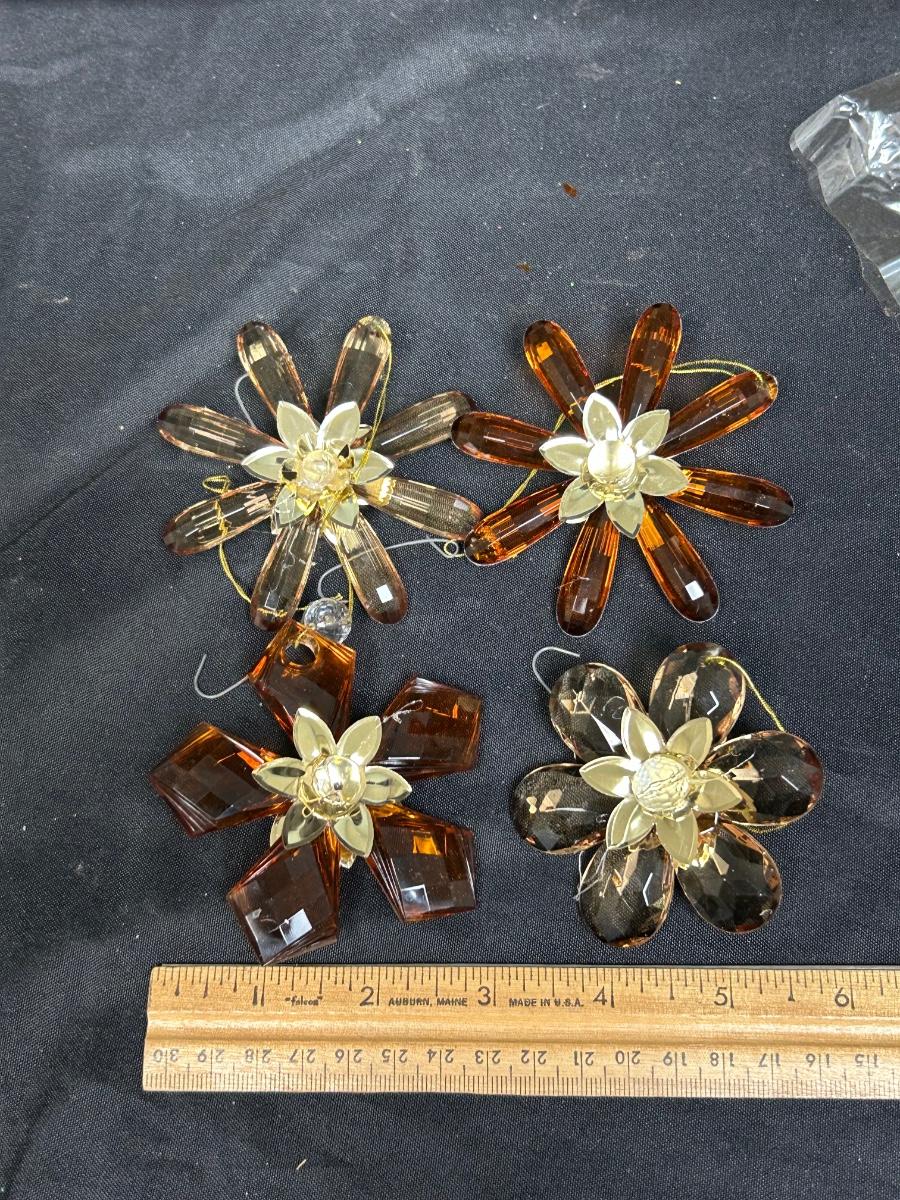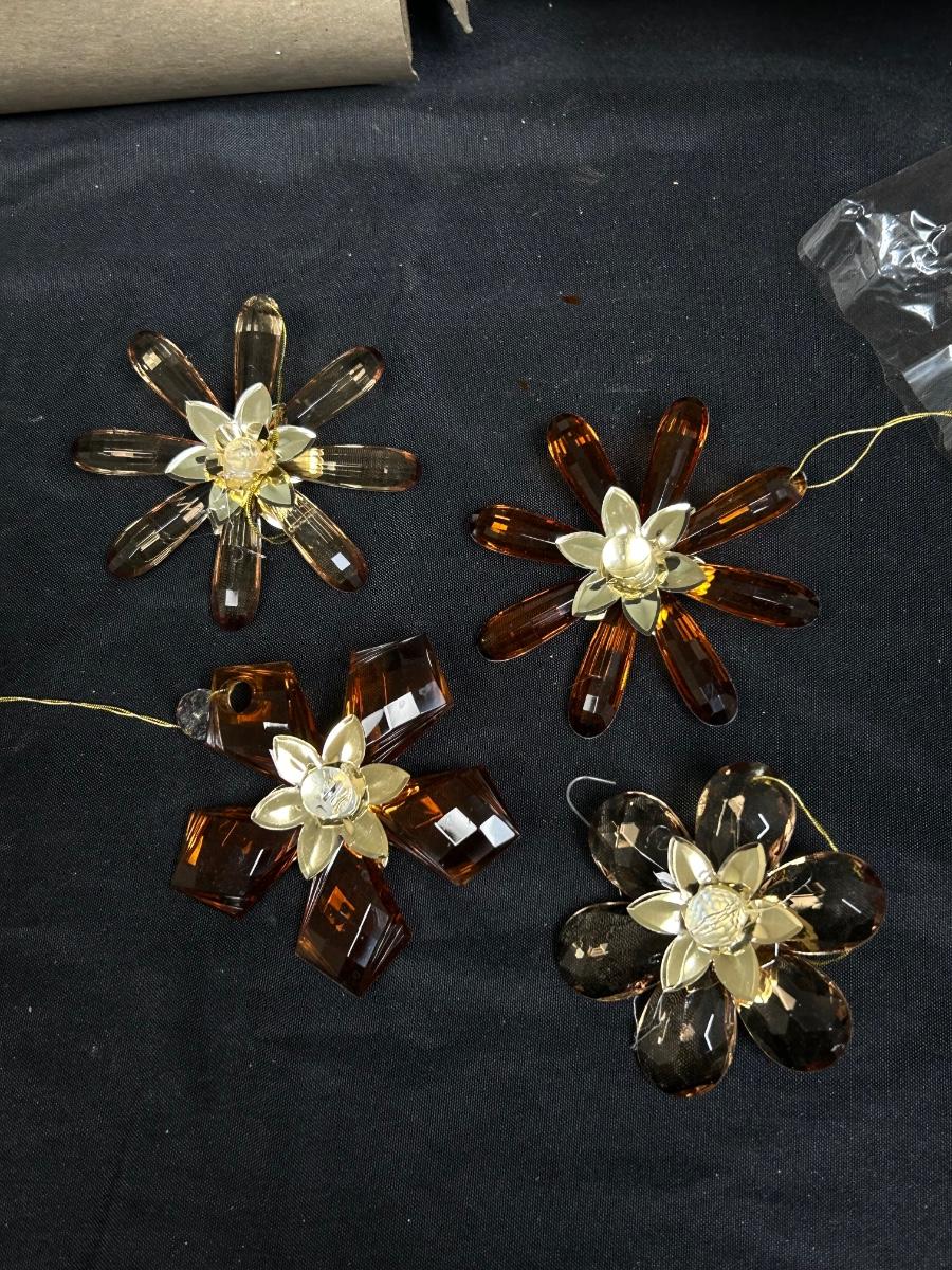 Vintage Plastic Prism Faceted Bead Flower Ornaments Amber Gold. In good condition. They look to be unused, individually wrapped in plastic bag. Two colors with multiple variations. About 2 dozen total in two boxes.