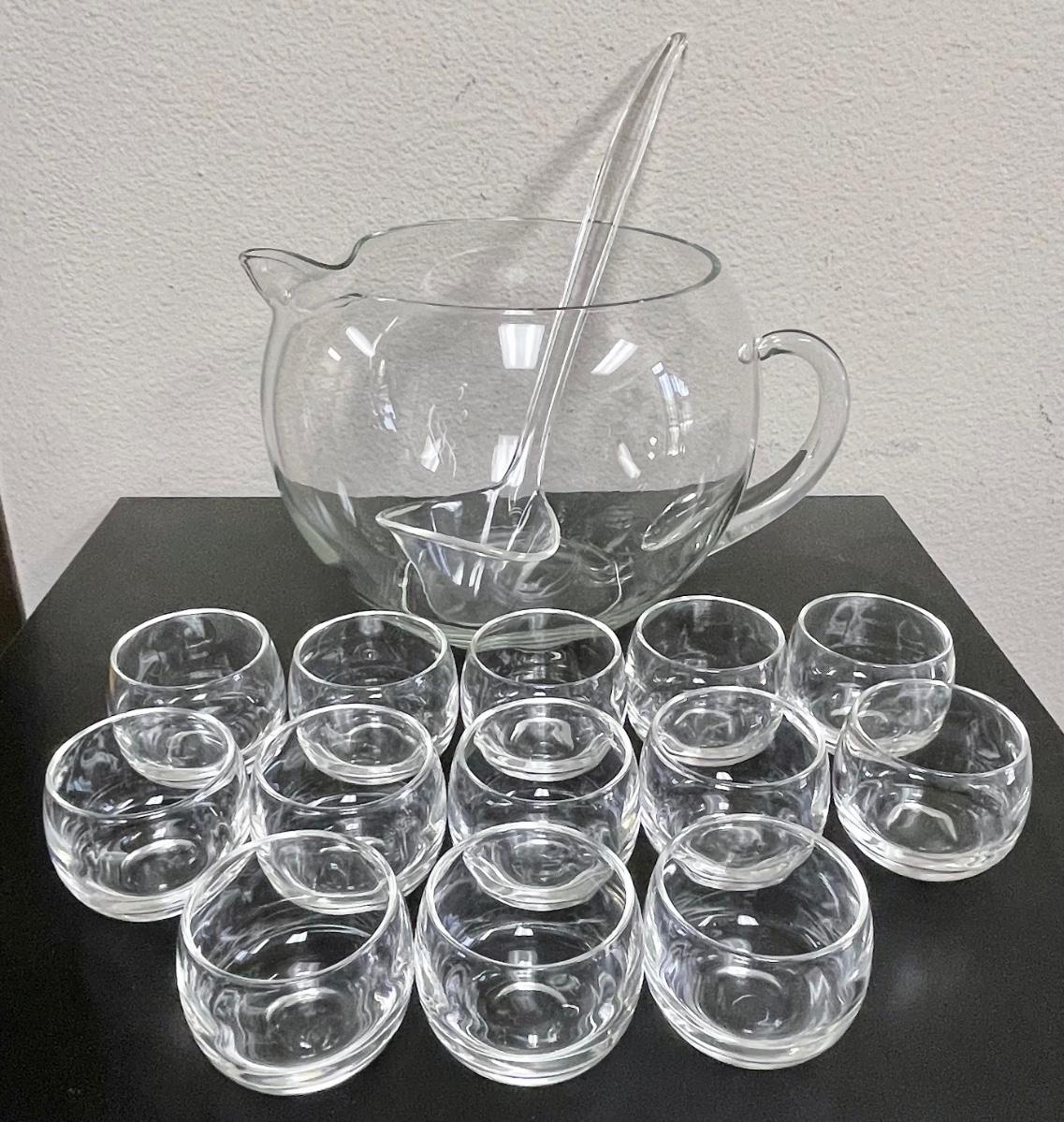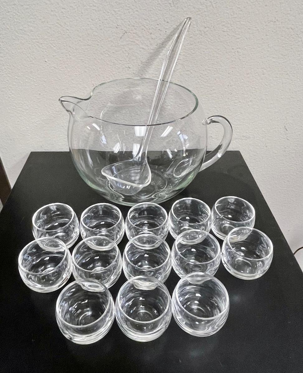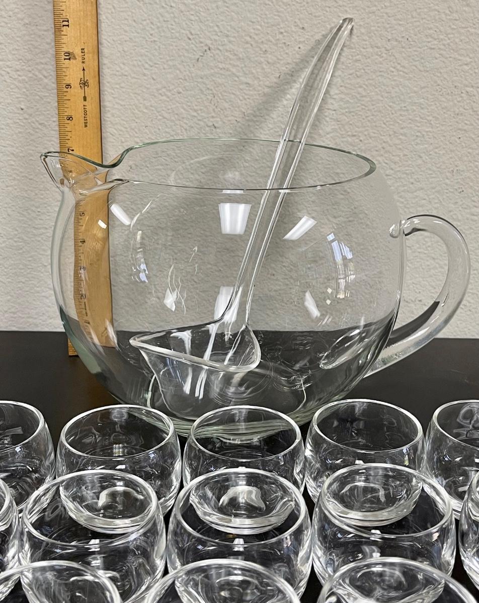 Mid-Century Clear Blown-Glass Punch Bowl with Bubble Shaped Punch cups and clear plastic ladle