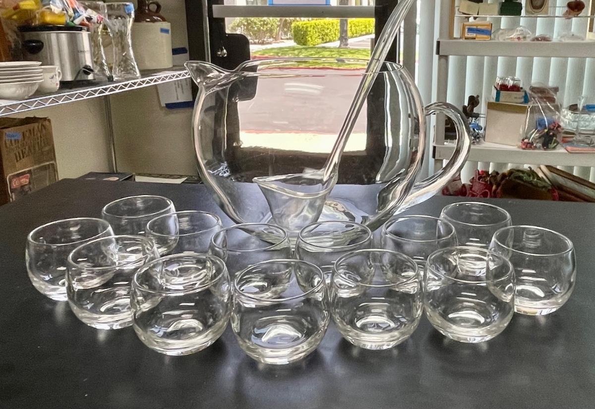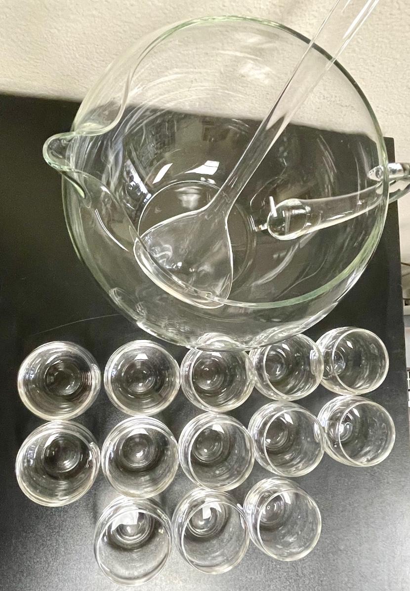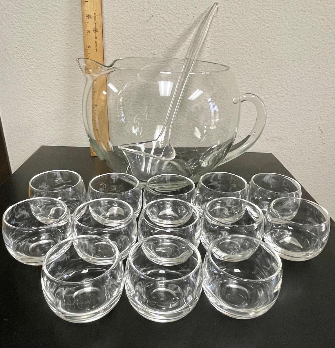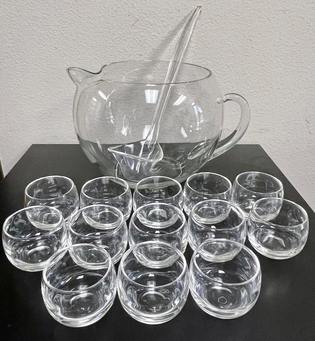 Mid-Century Clear Blown-Glass Punch Bowl with Bubble Shaped Punch cups and clear plastic ladle