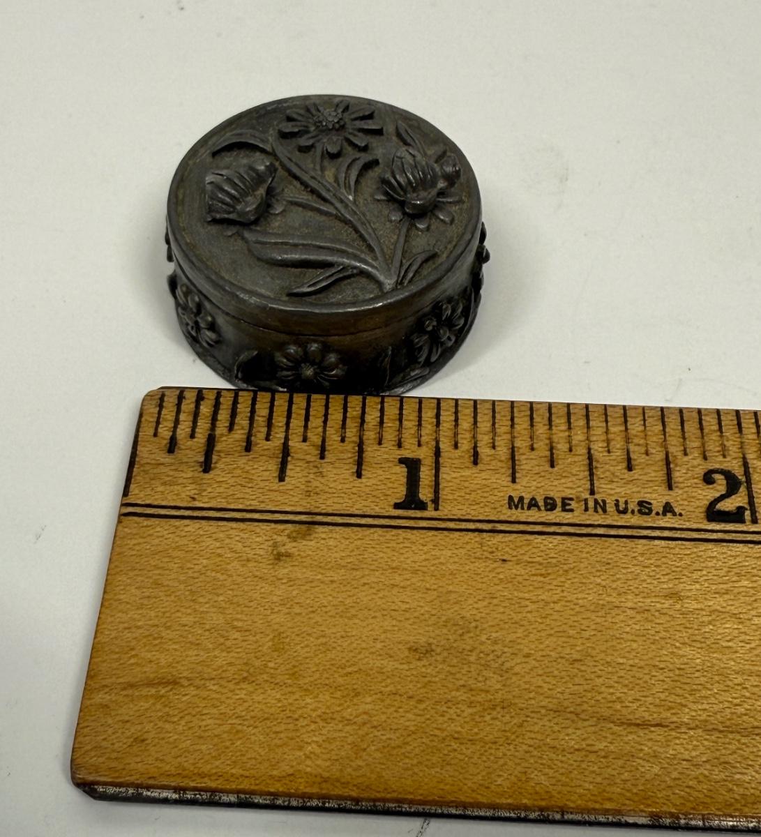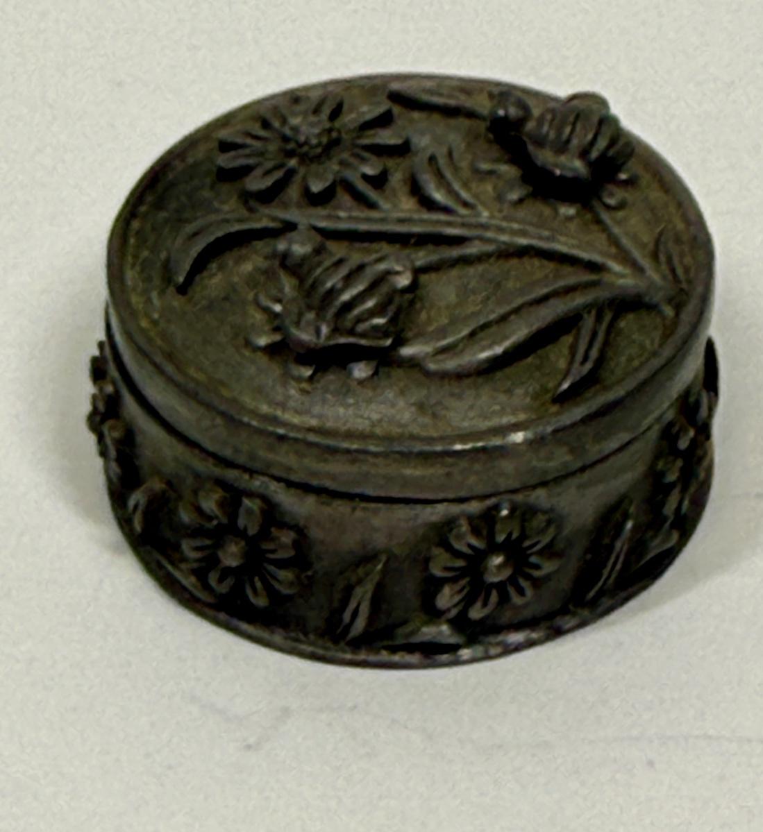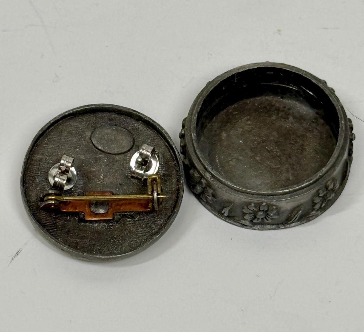 Torino Round Pewter Trinket Box with earrings or brooch from top piece