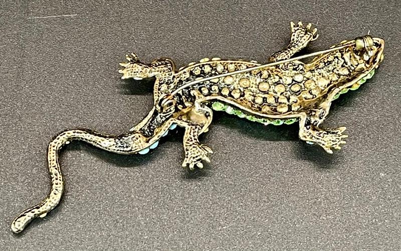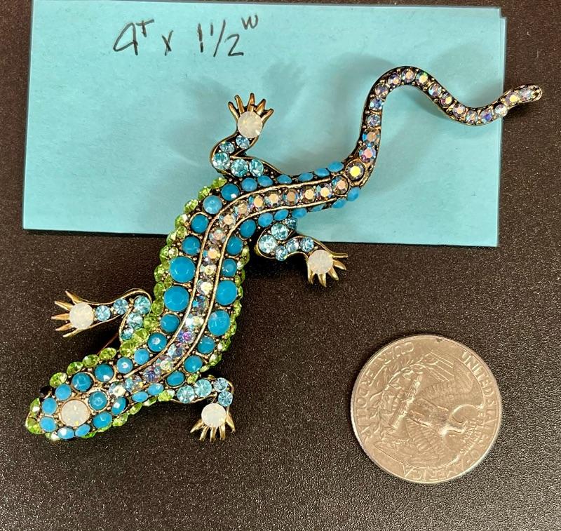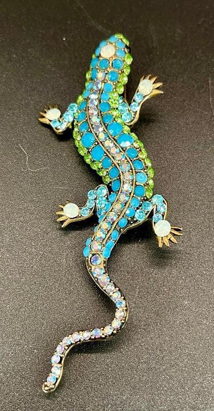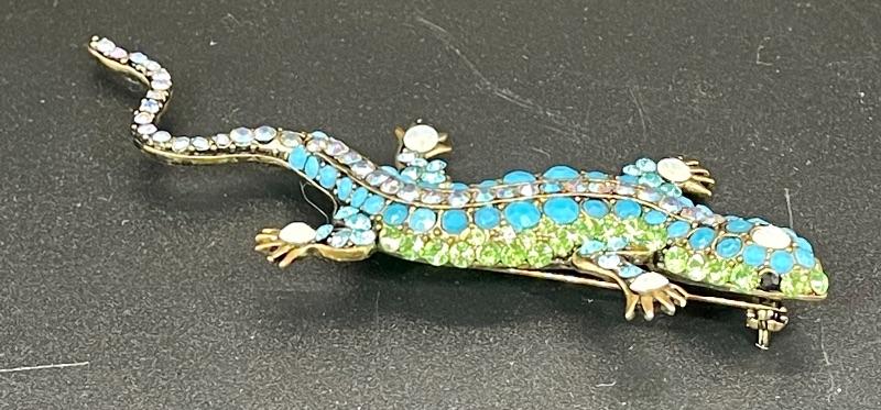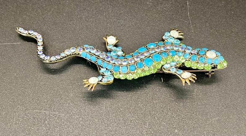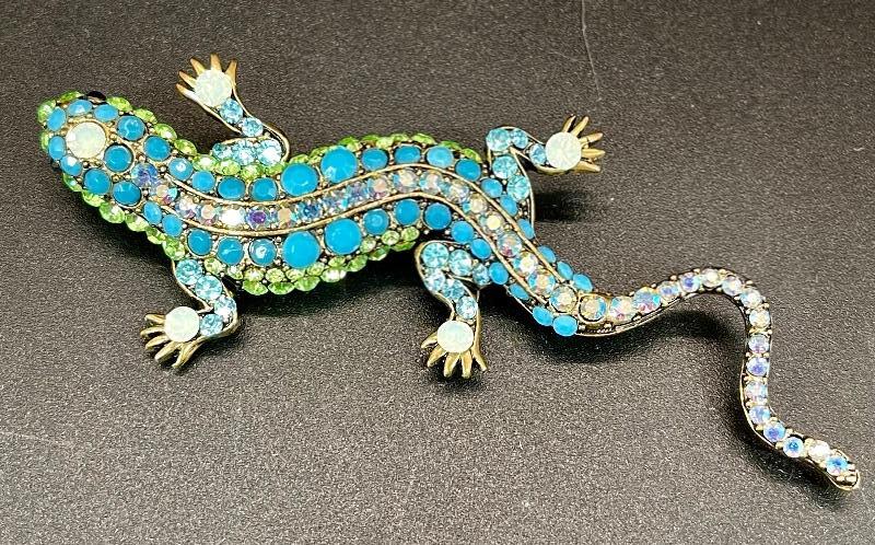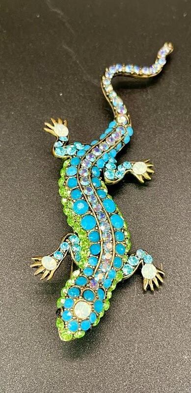 Colorful lizard brooch. Done in turquoise blue and lime green rhinestones. Gold tone setting. Unsigned. About 4" size.