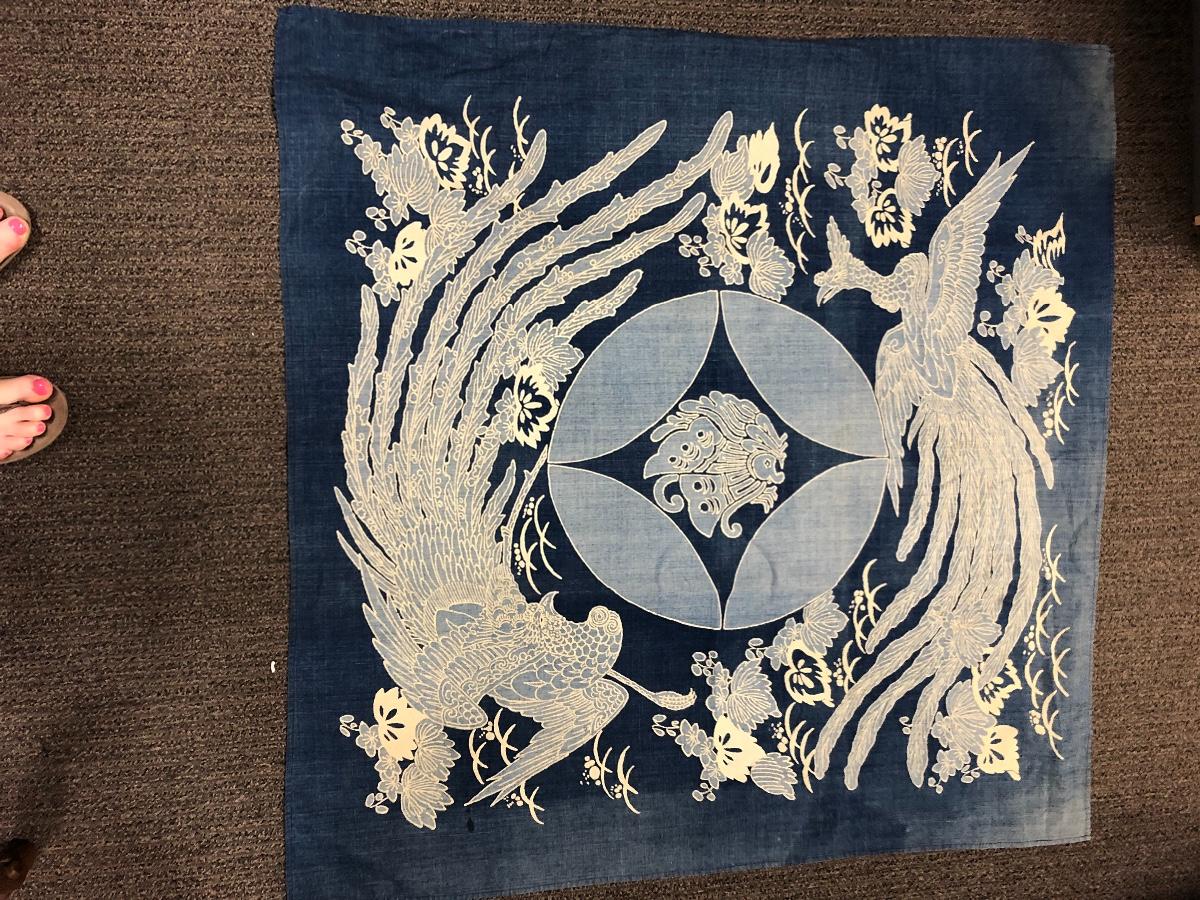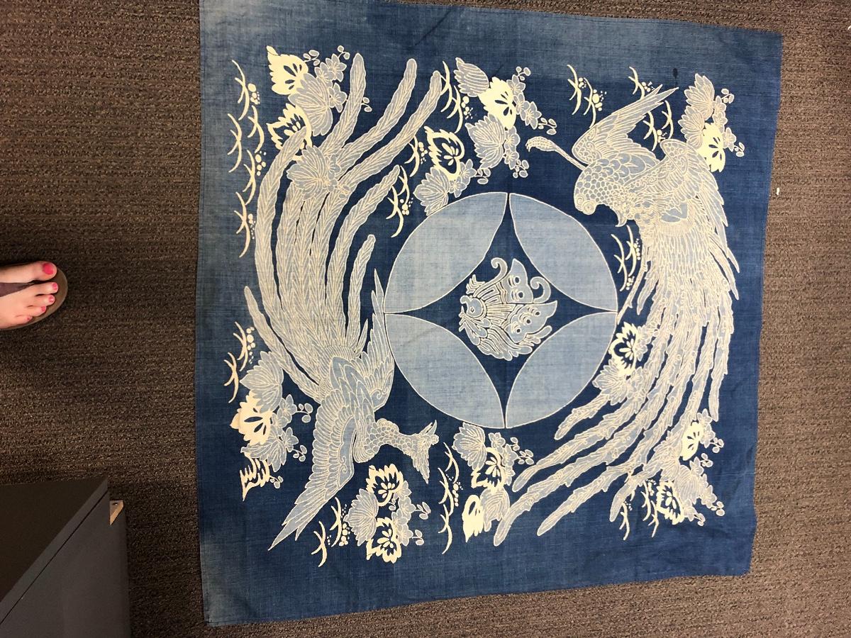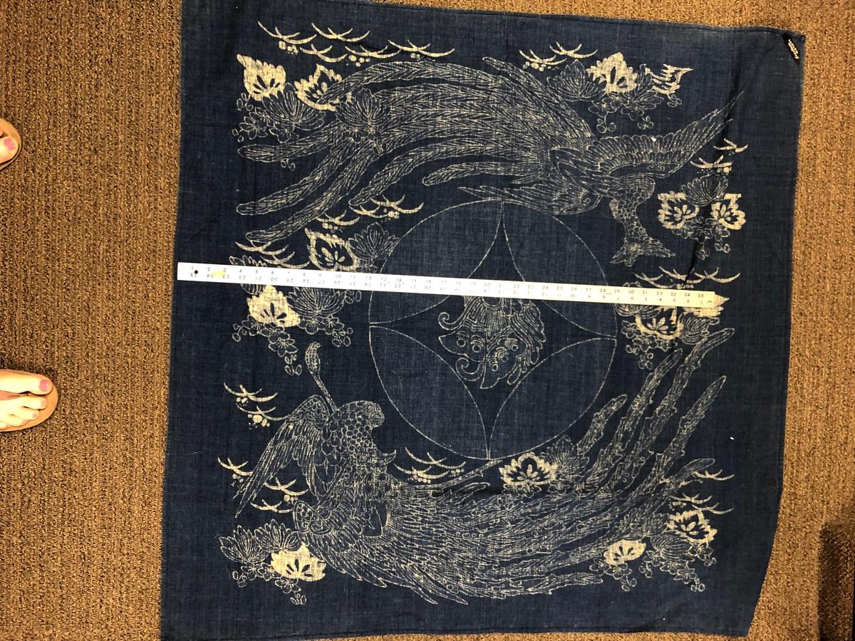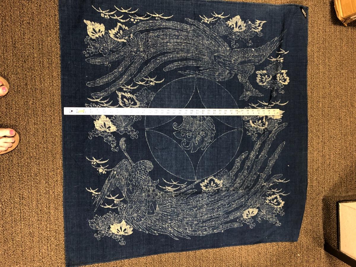 Vintage blue and white square tablecloth. Has an Orient look to its design. Good vintage condition. It is dusty, was on top of a curio cabinet for quite some time.