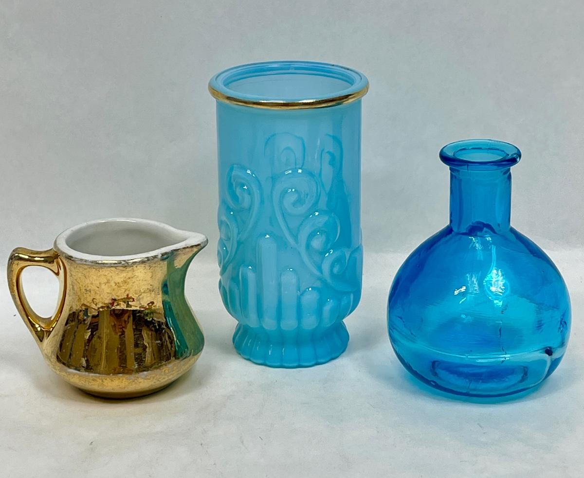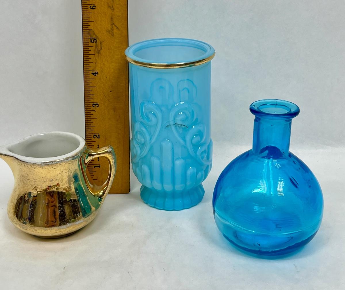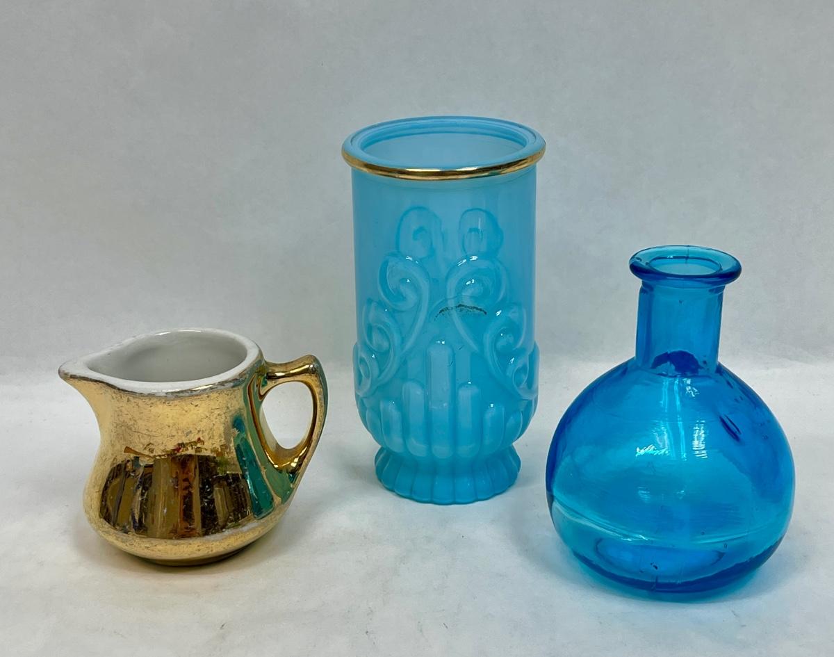 3 piece vintage collection - Gold Ceramic Pitcher, Milk Glass Blue Gold Vase, Glass Vase