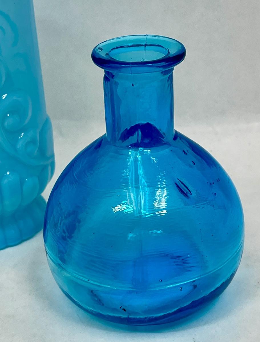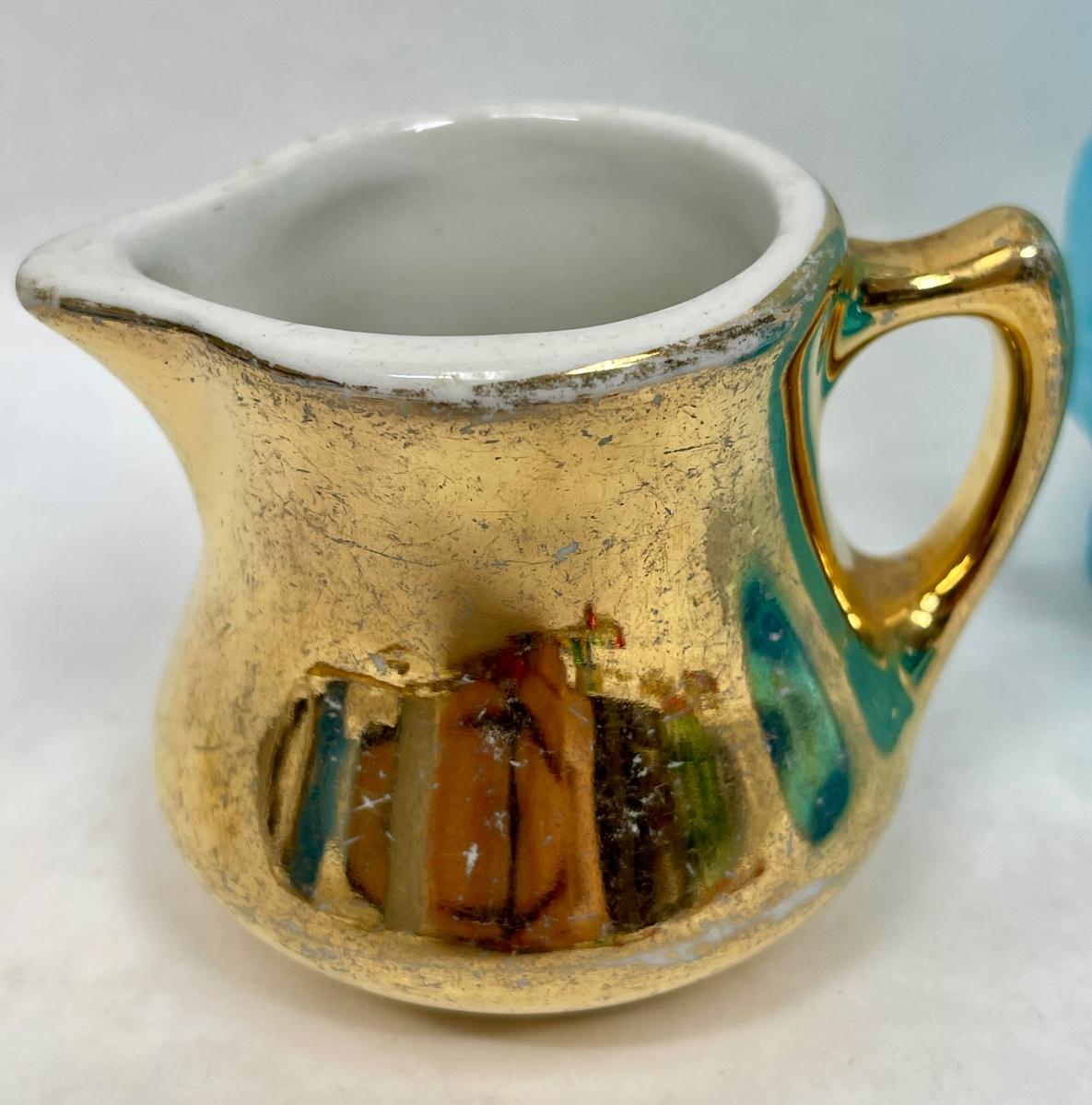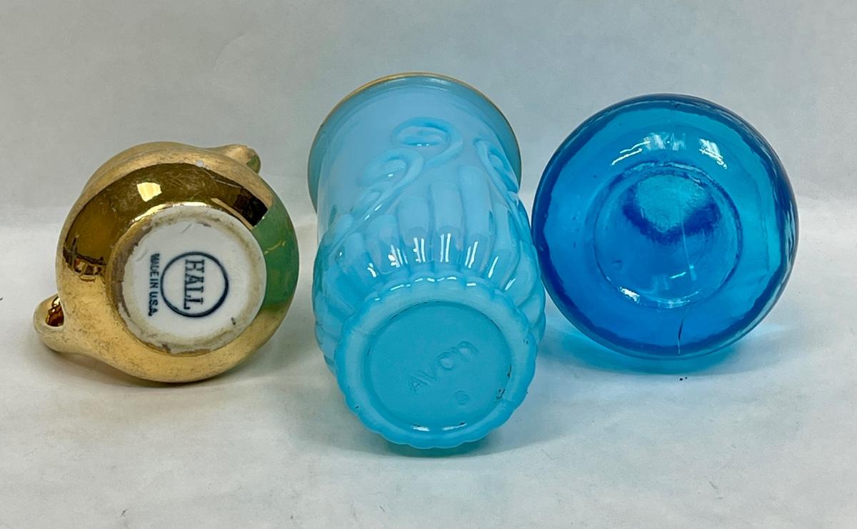 3 piece vintage collection - Gold Ceramic Pitcher, Milk Glass Blue Gold Vase, Glass Vase