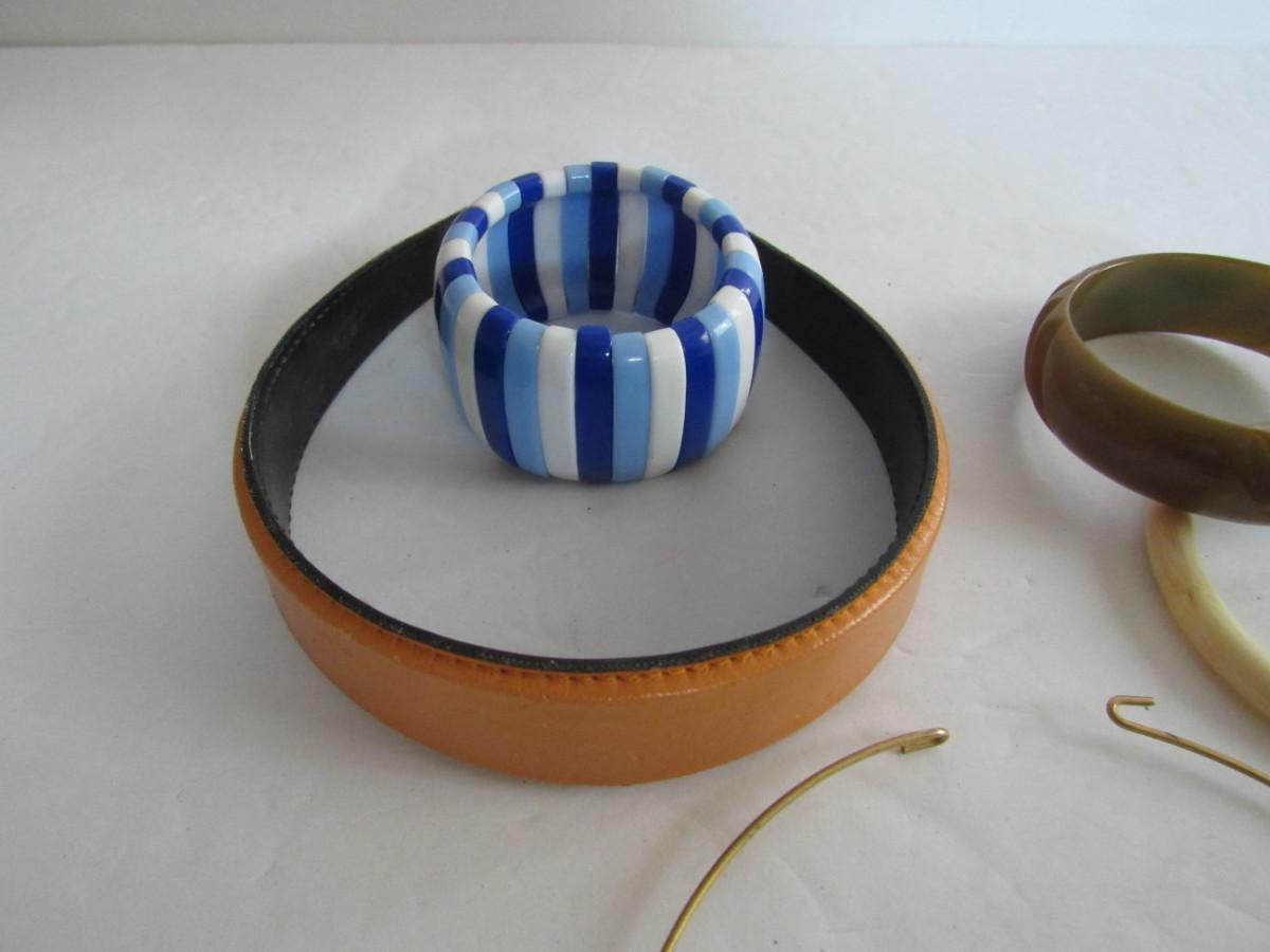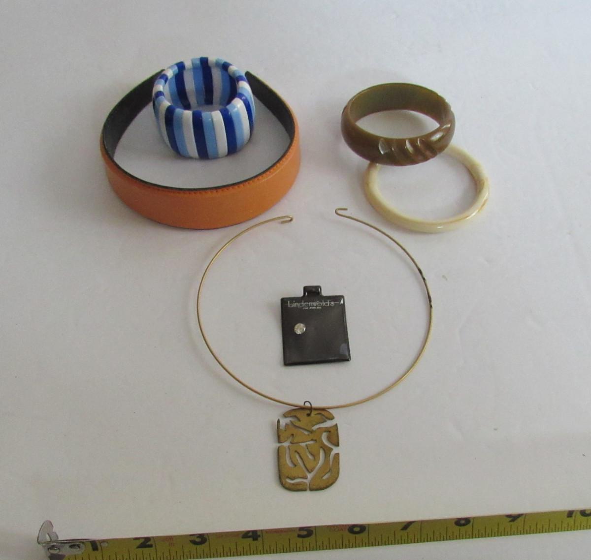 Minor wear on the brass necklace. One of the bracelets has stains. Rest appear to be fine. Nice wide 1970s headband. Stretch plastic bracelet. Shipping is available at actual shipping cost plus $5.00 handling fee per box for supplies/labor. See our terms for details. All sales are final. Condition notes may not be all inclusive, we may miss some issues as most vintage items are not in mint condition and have some degree of wear, paint loss, etc, but we always try to note obvious damage.