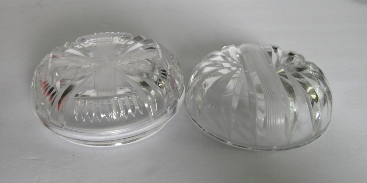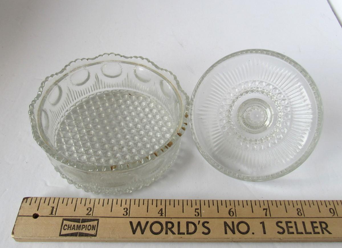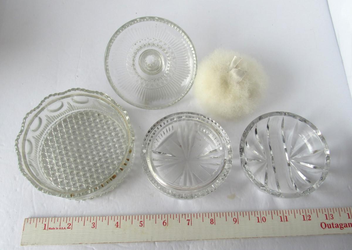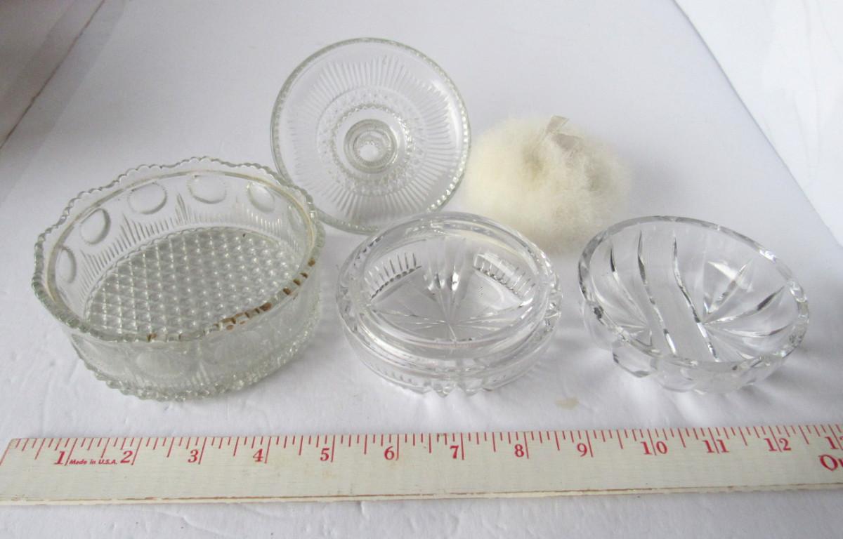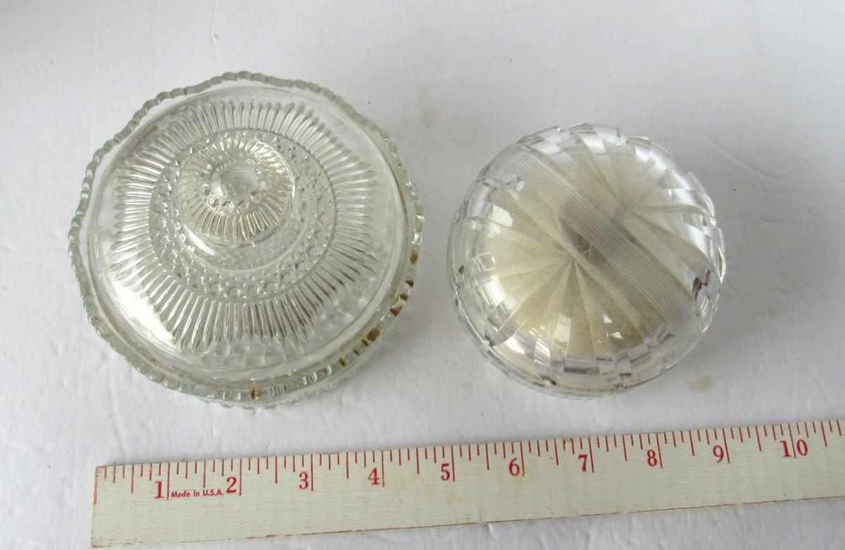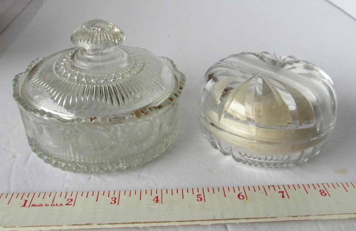 Both in good shape. The pressed glass one has some gold trim wear, mostly gone. The cut glass one has a nice clean powder puff inside. Shipping is available at actual shipping cost plus $5.00 handling fee per box for supplies/labor. See our terms for details. All sales are final. Condition notes may not be all inclusive, we may miss some issues as most vintage items are not in mint condition and have some degree of wear, paint loss, etc, but we always try to note obvious damage.