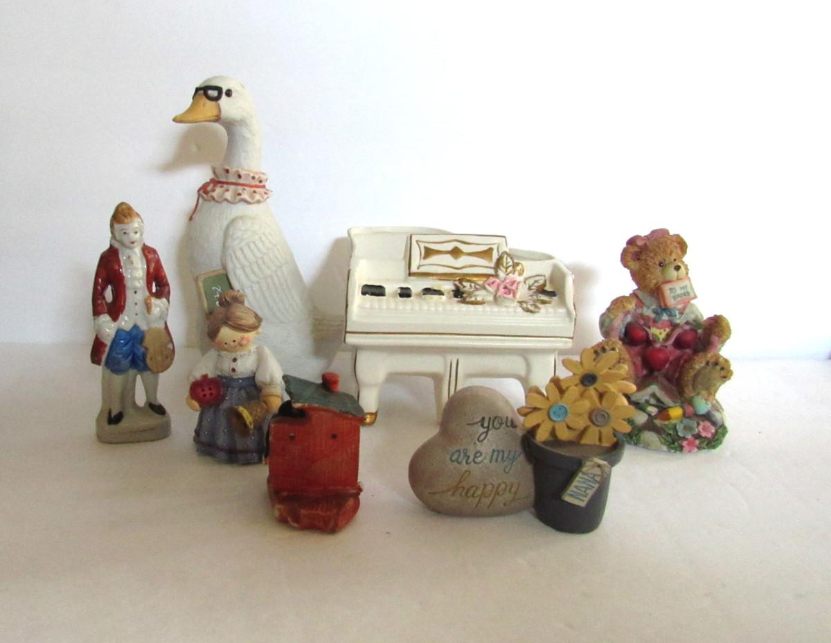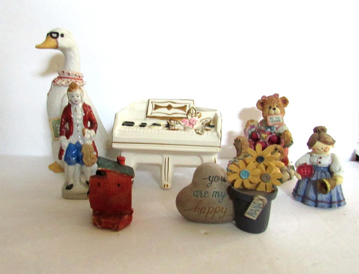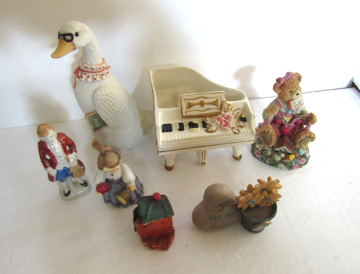 I don't see any damage. Old black Americana outhouse guy is turned around, sorry. Piano is a planter.
