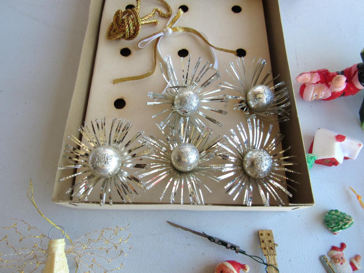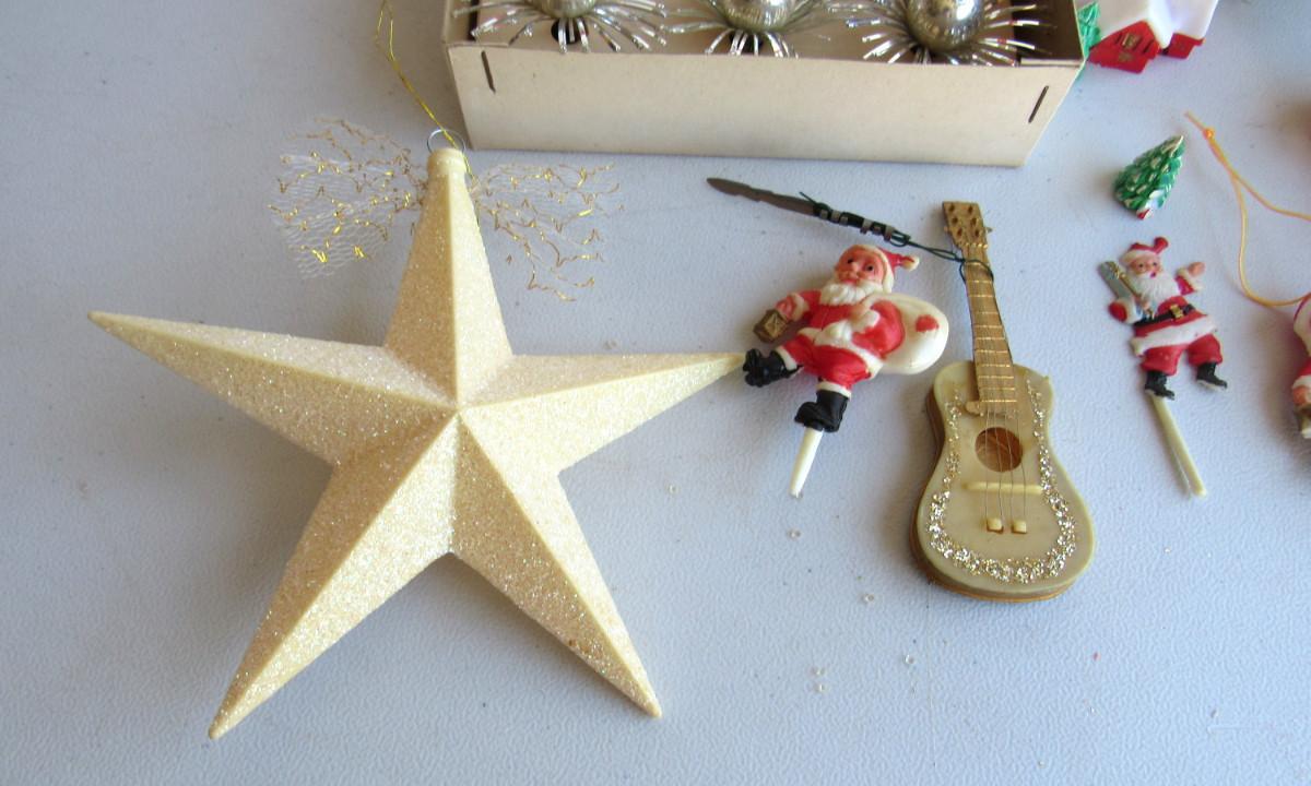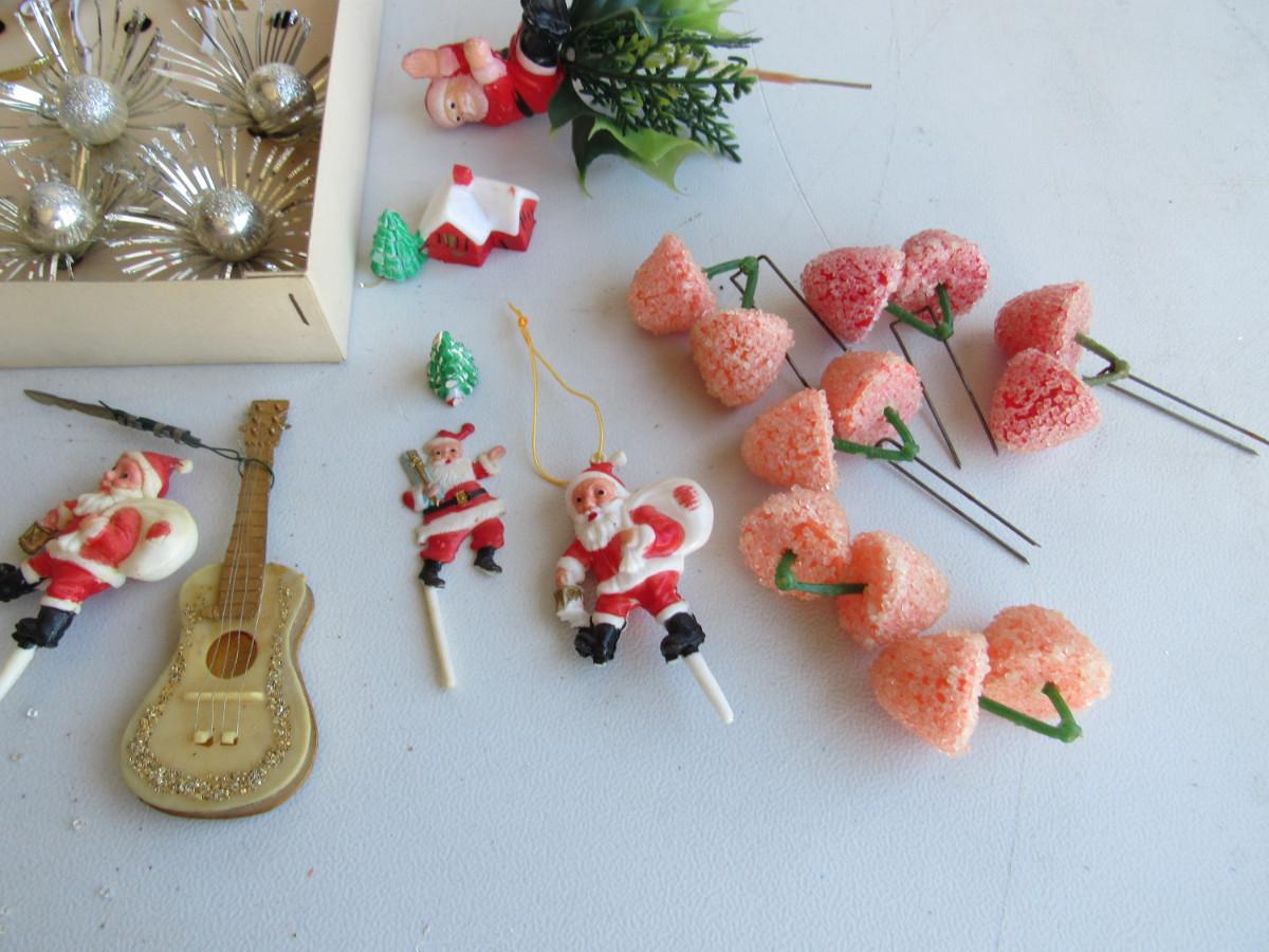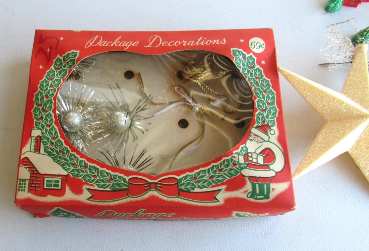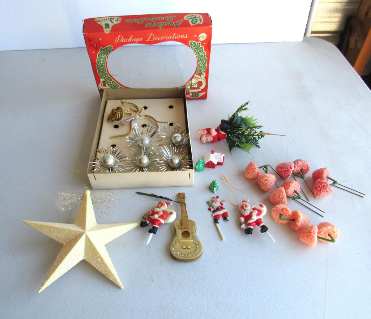 Partial box of decorations, cellophane is torn on box. Plastic Santa picks, star, guitar ornament. Good shape on most. Shipping is available at actual shipping cost plus $5.00 handling fee per box for supplies/labor. See our terms for details. All sales are final. Condition notes may not be all inclusive, we may miss some issues as most vintage items are not in mint condition and have some degree of wear, paint loss, etc, but we always try to note obvious damage.