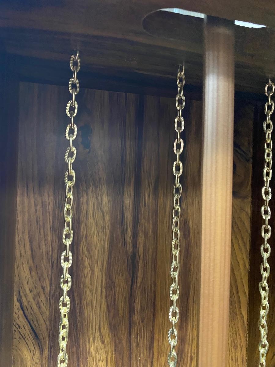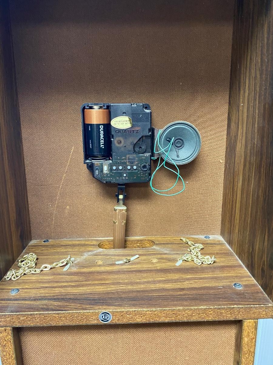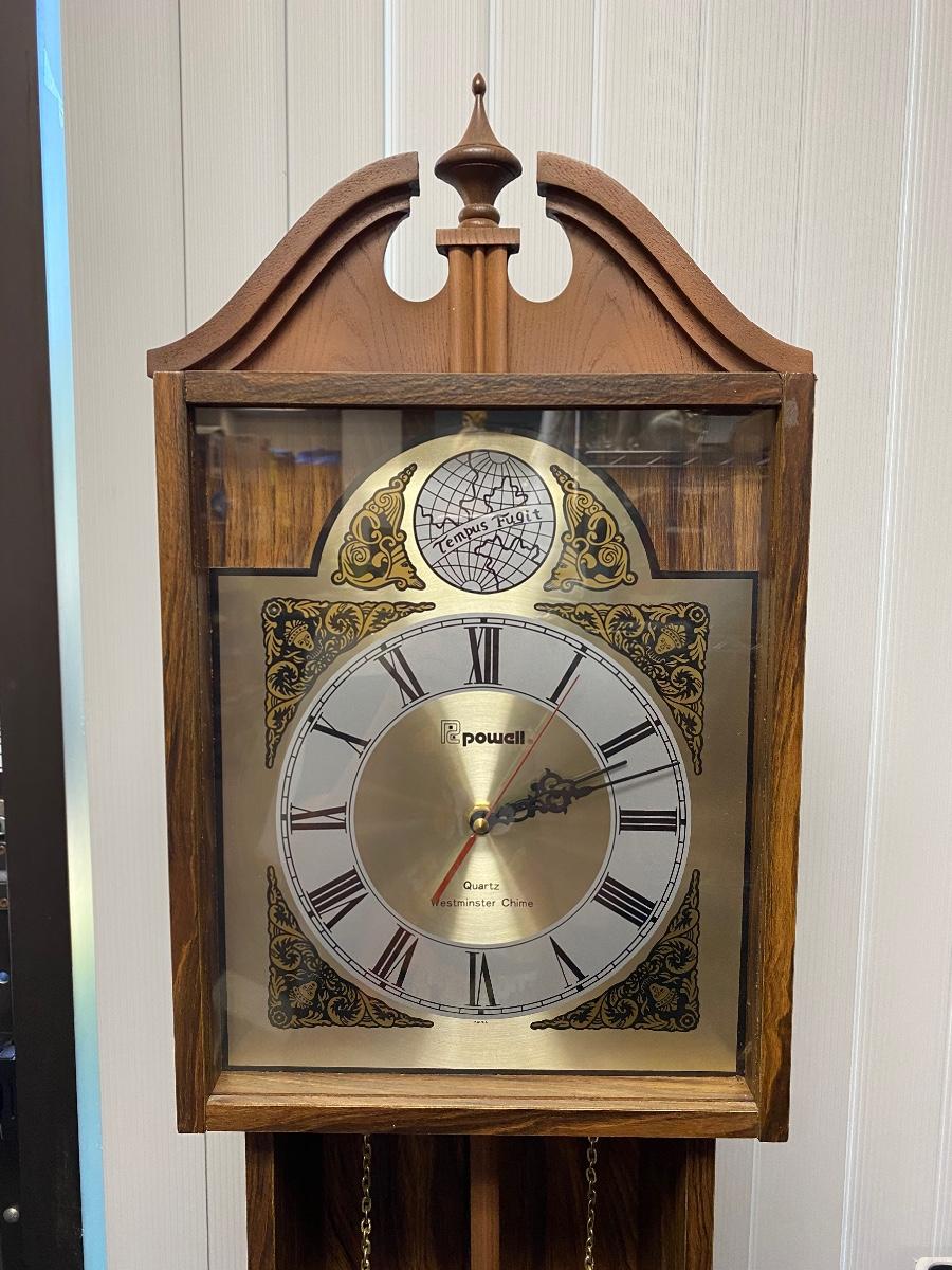 Vintage Battery Operated Veneered Standing Grandfather Clock. Can have chime sound on or off. Veneered particle board, not real wood. Looks good, about 6' tall. Plastic weights and chains.