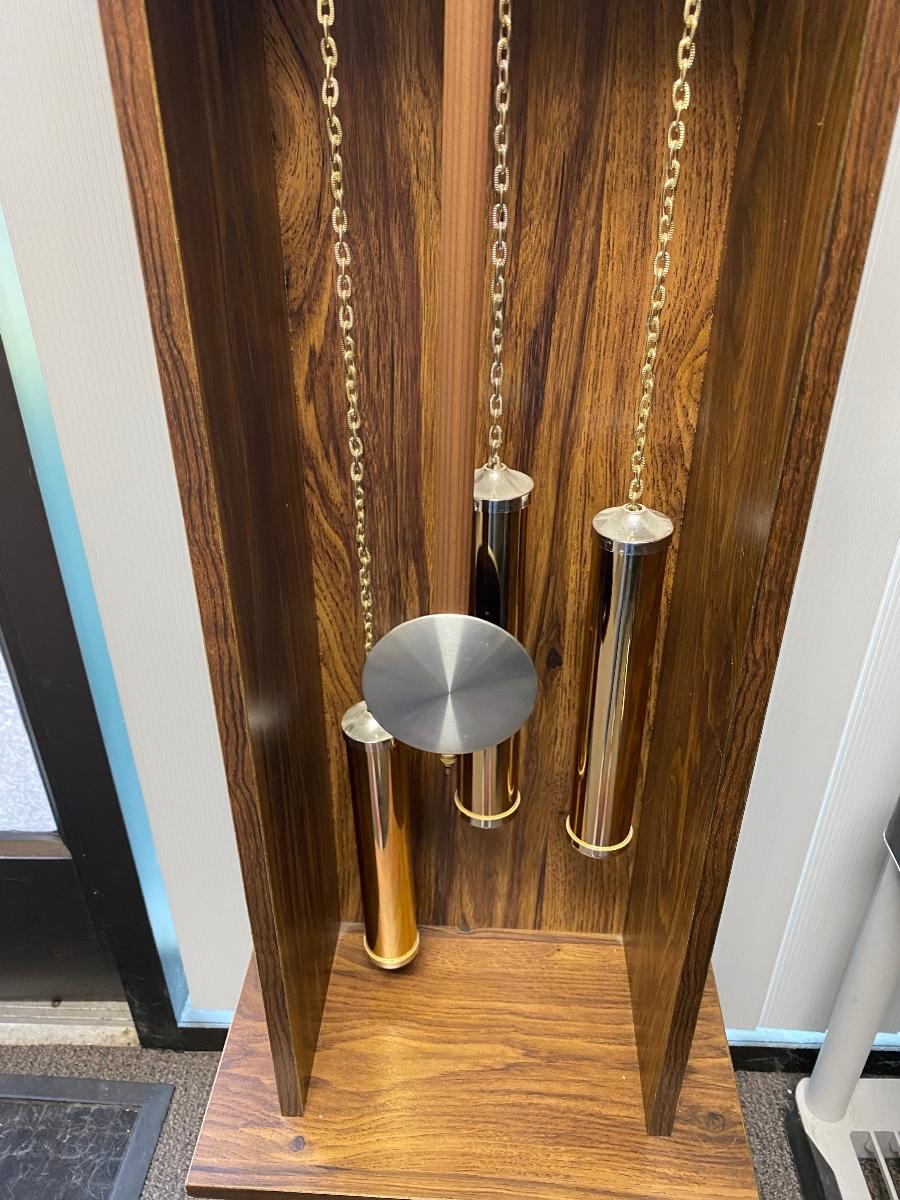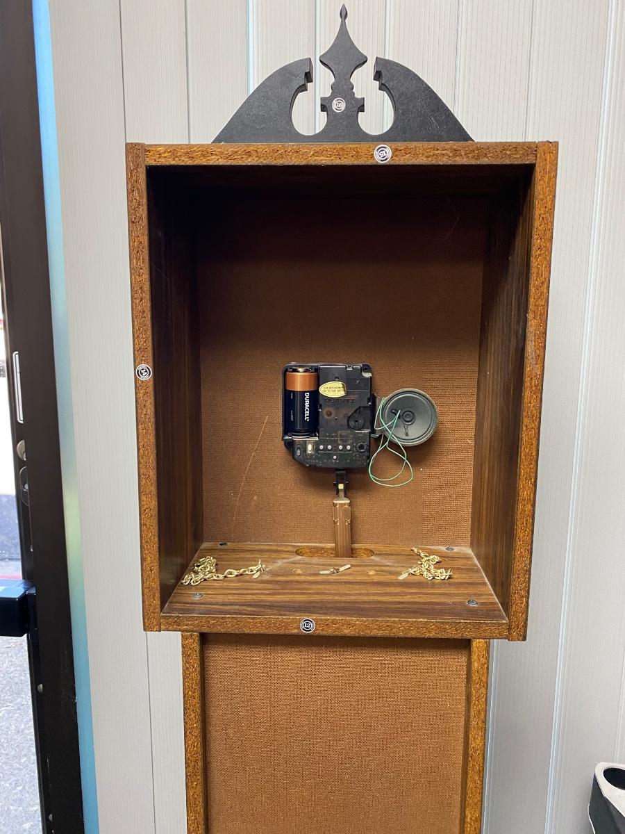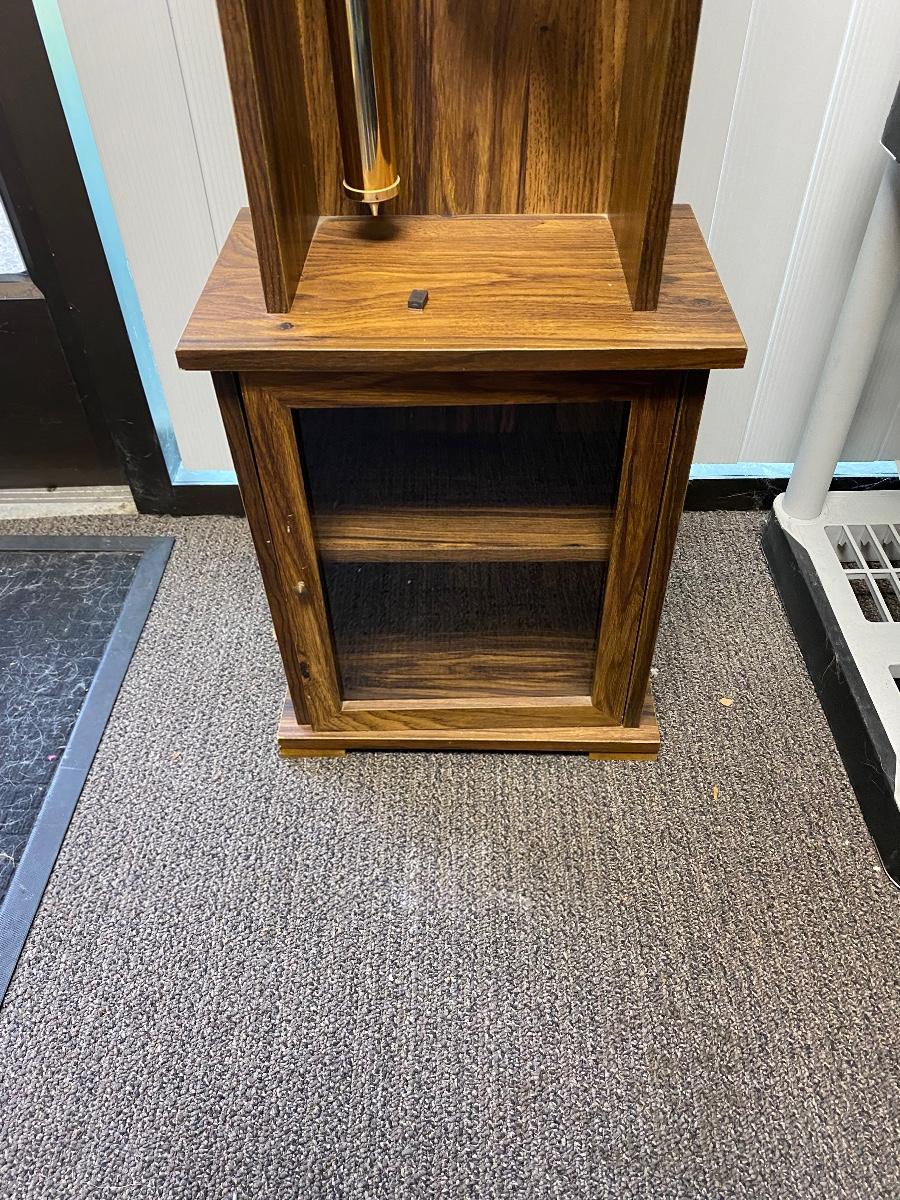 Vintage Battery Operated Veneered Standing Grandfather Clock. Can have chime sound on or off. Veneered particle board, not real wood. Looks good, about 6' tall. Plastic weights and chains.