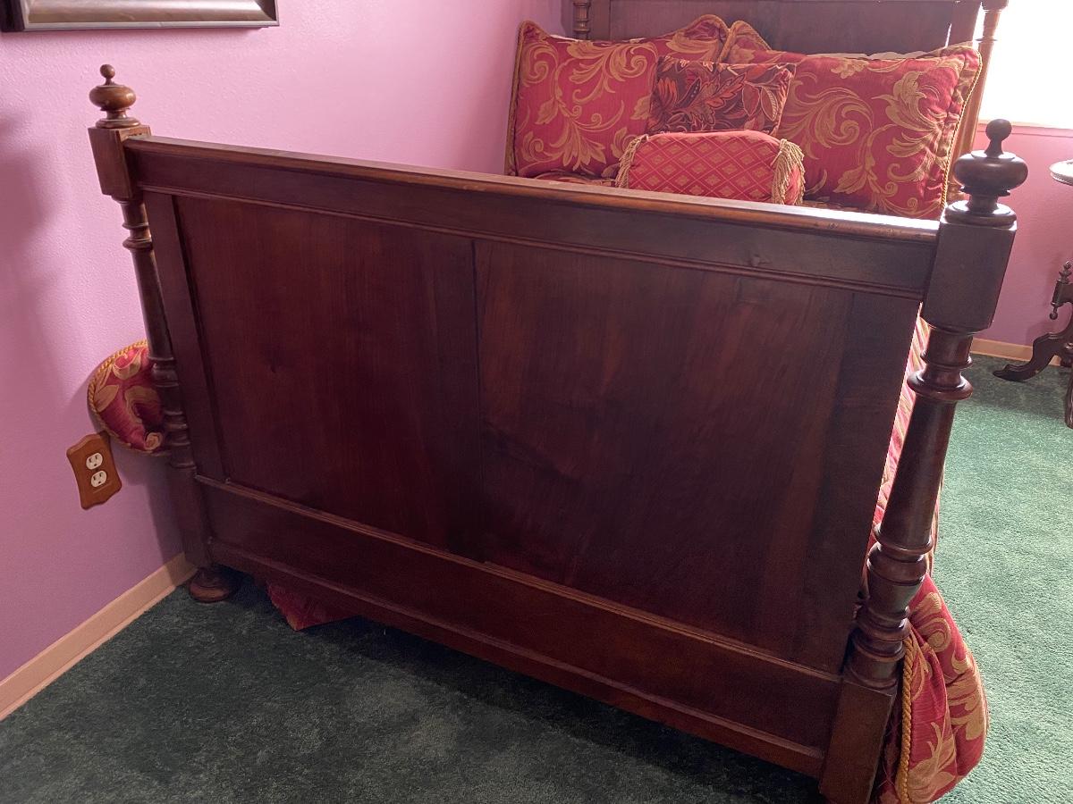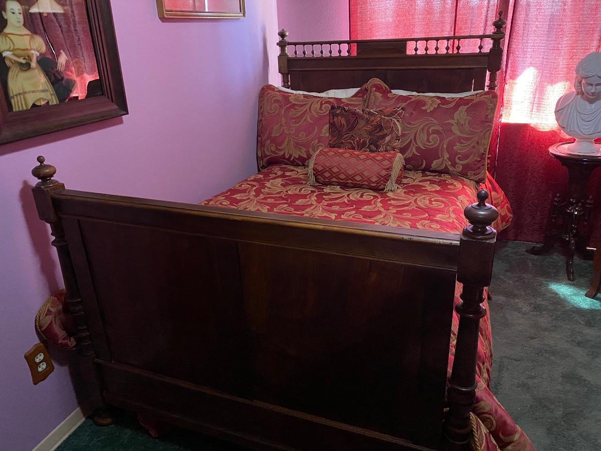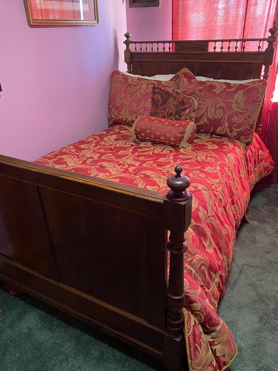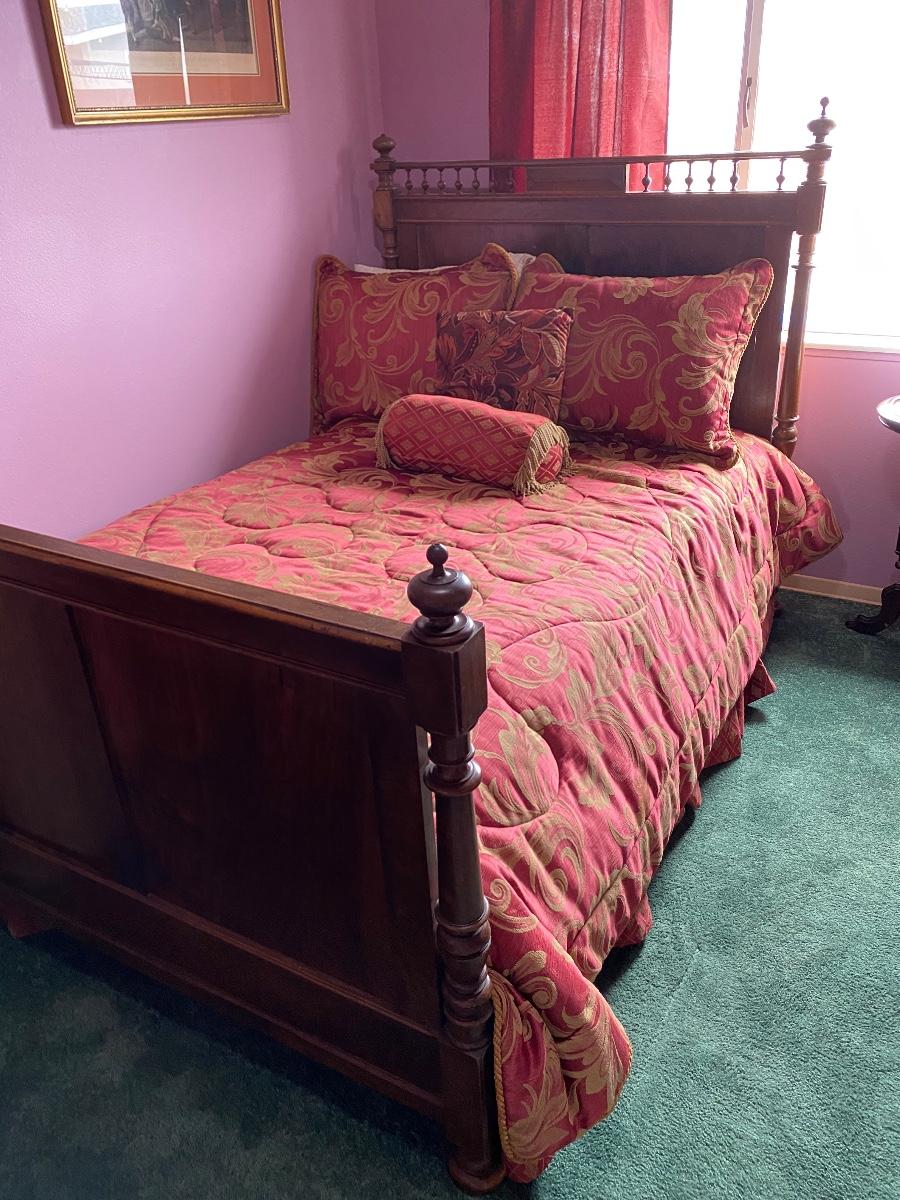 Antique Victorian wood bed. High back headboard, footboard and rails. Full size bed. Comes with mattress and bedding. There is a spindle missing in the headboard. In good condition. LOCAL PICK UP IN FULLERTON.
