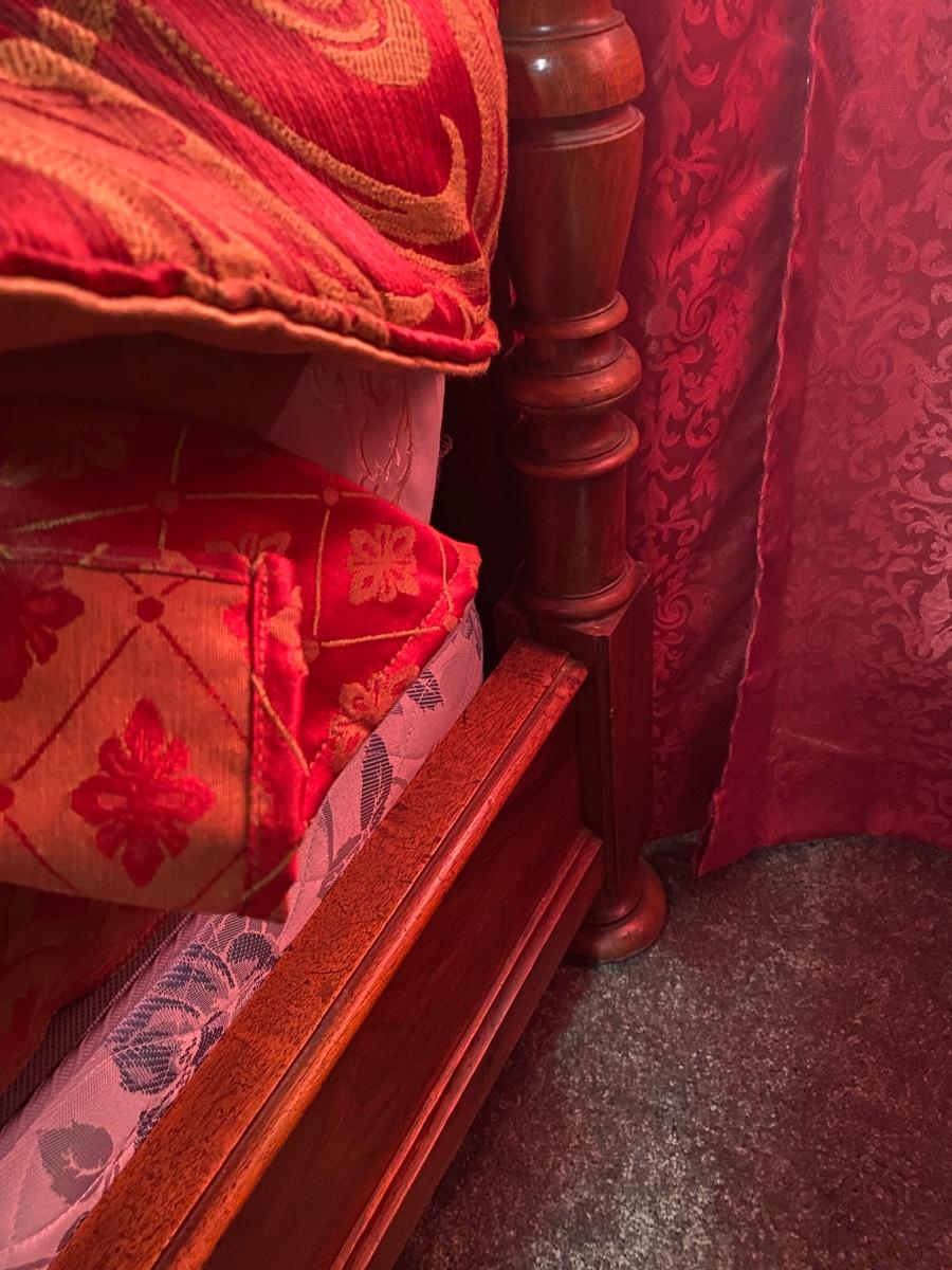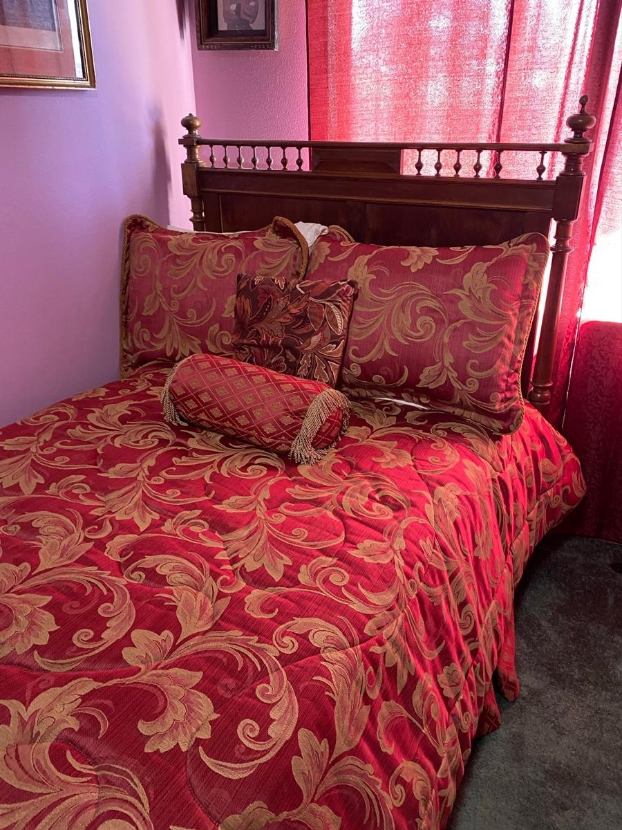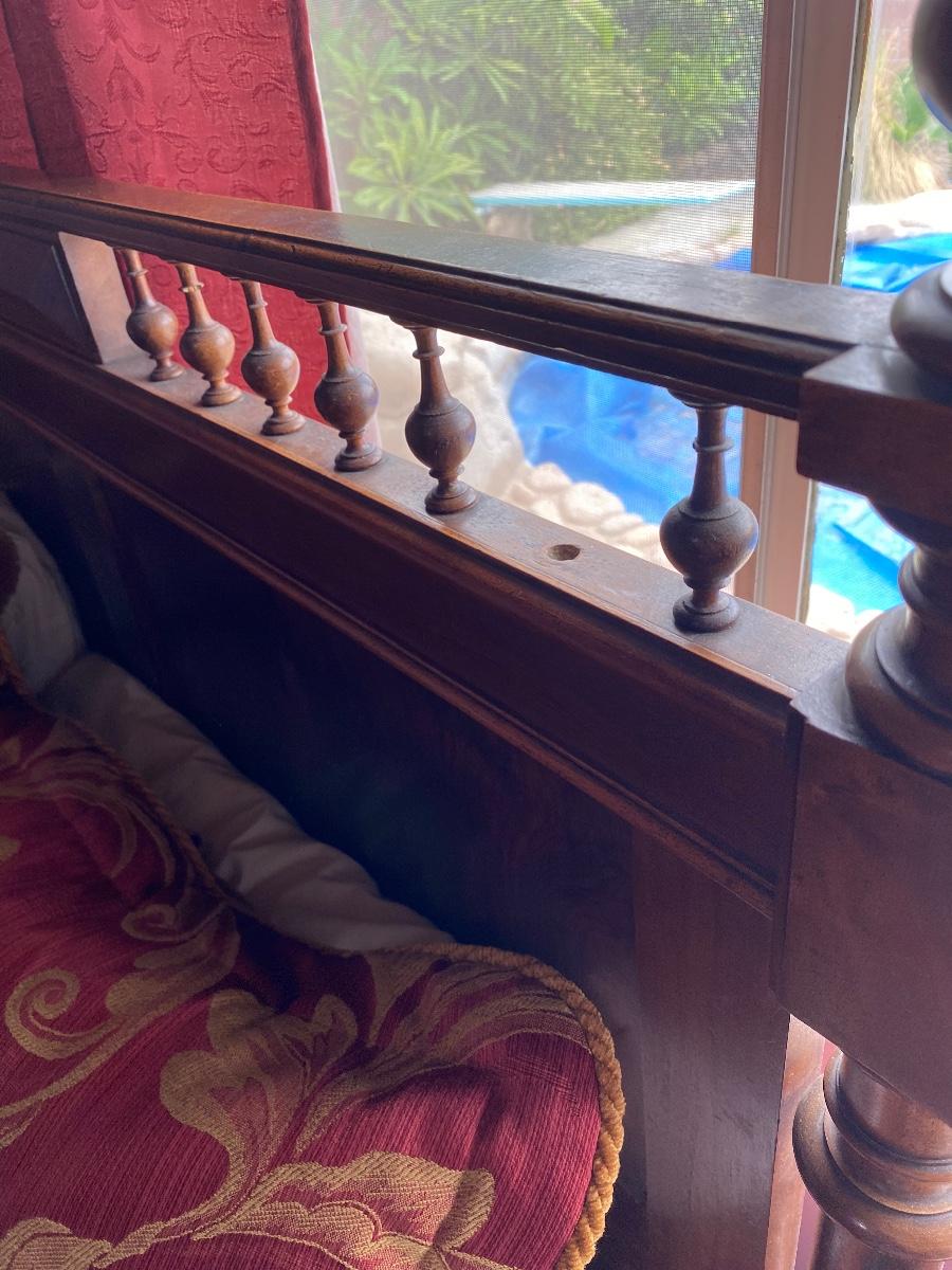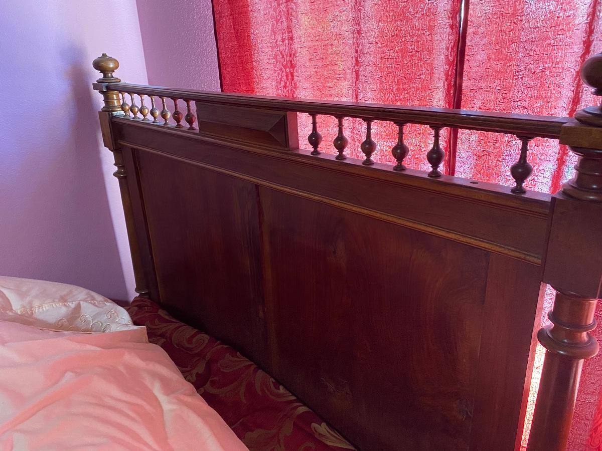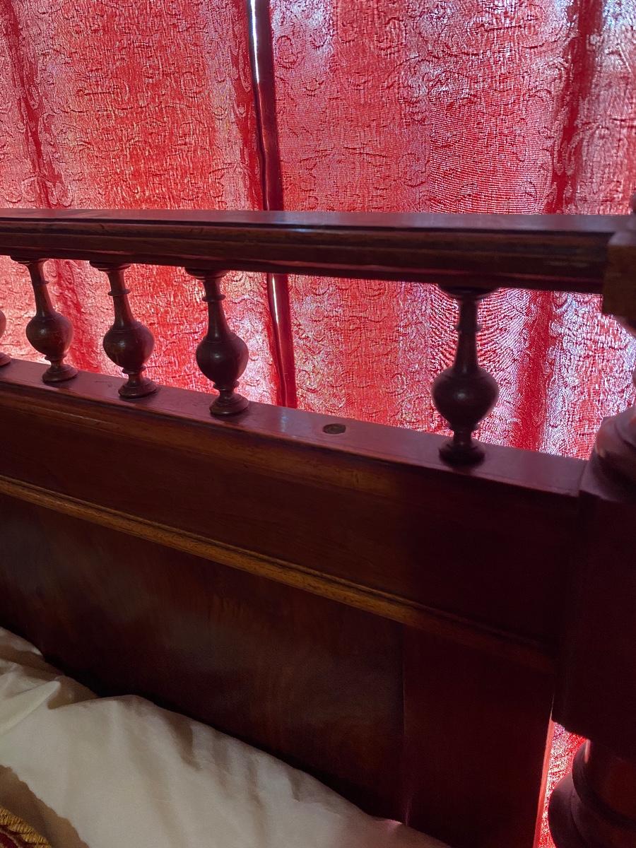 Antique Victorian wood bed. High back headboard, footboard and rails. Full size bed. Comes with mattress and bedding. There is a spindle missing in the headboard. In good condition. LOCAL PICK UP IN FULLERTON.