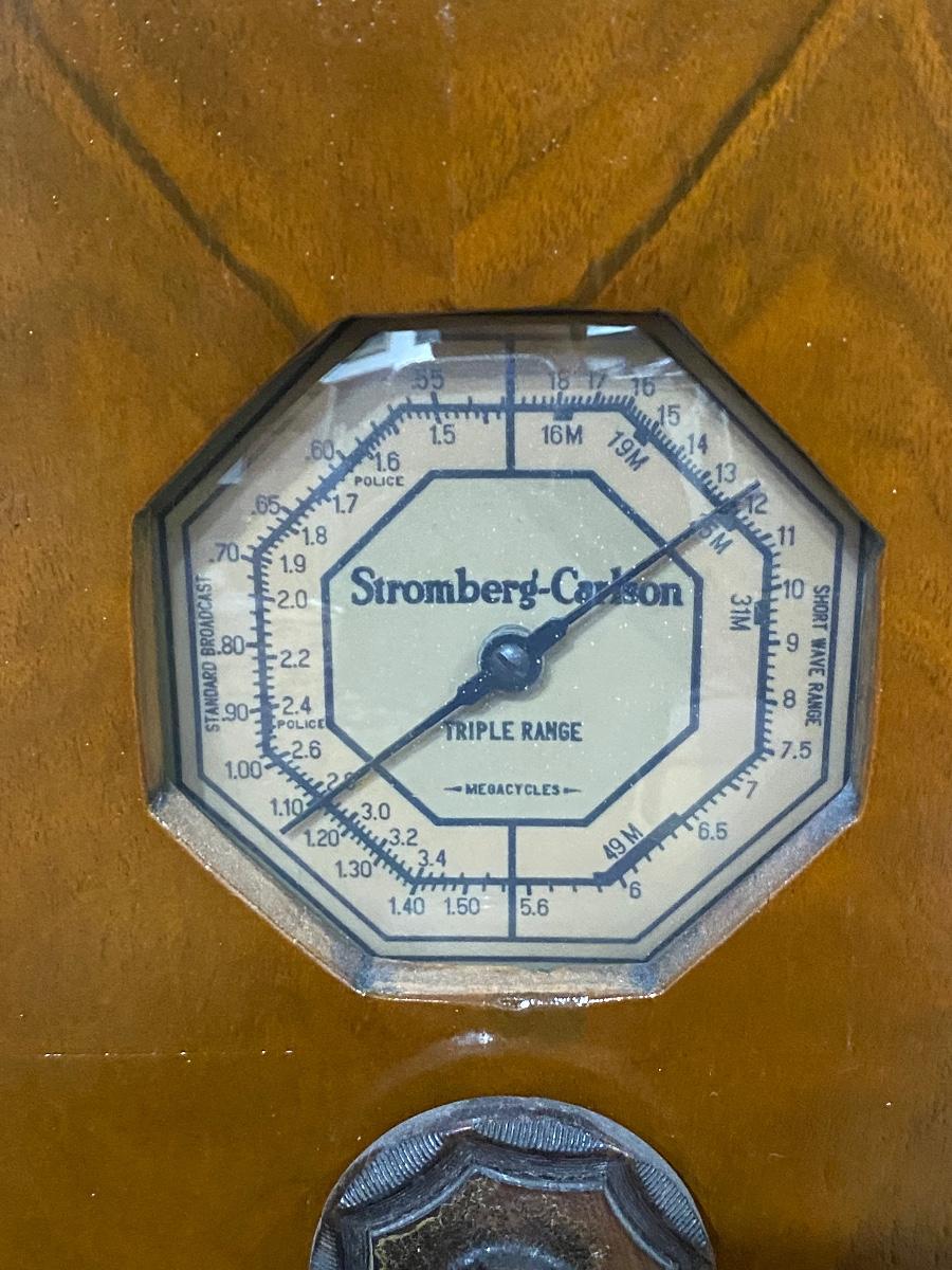 Vintage Art Deco style Stromberg Carlson tube radio grandfather clock. Face has been replaced, the current clock is battery operated. Clock cabinet is in good condition. Untested. Storage space behind clock face and in lower half of cabinet under radio. About 6' tall. LOCAL PICK UP IN FULLERTON.