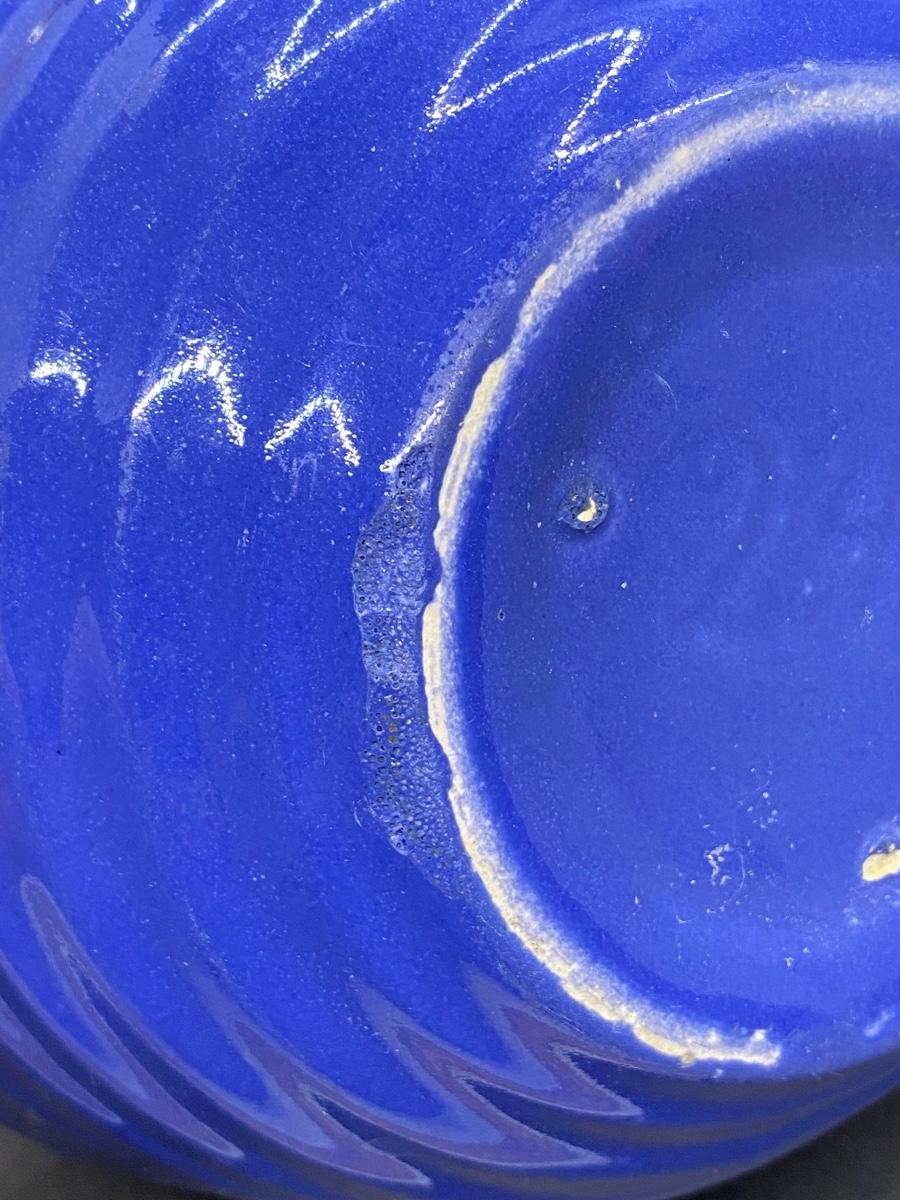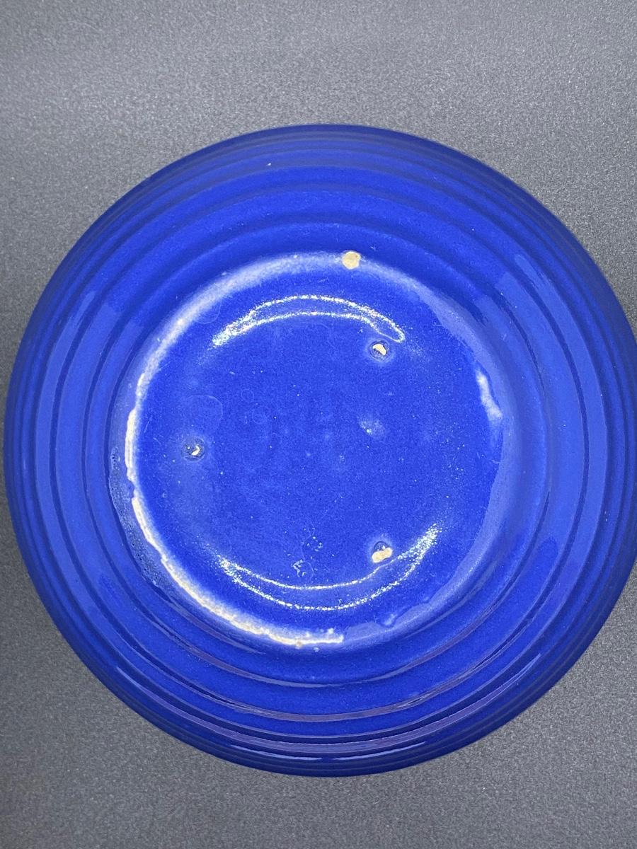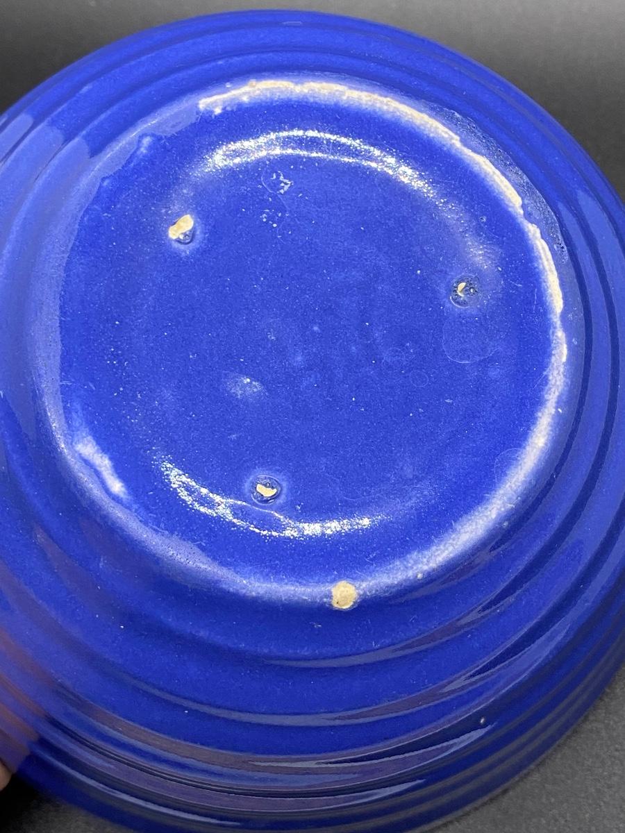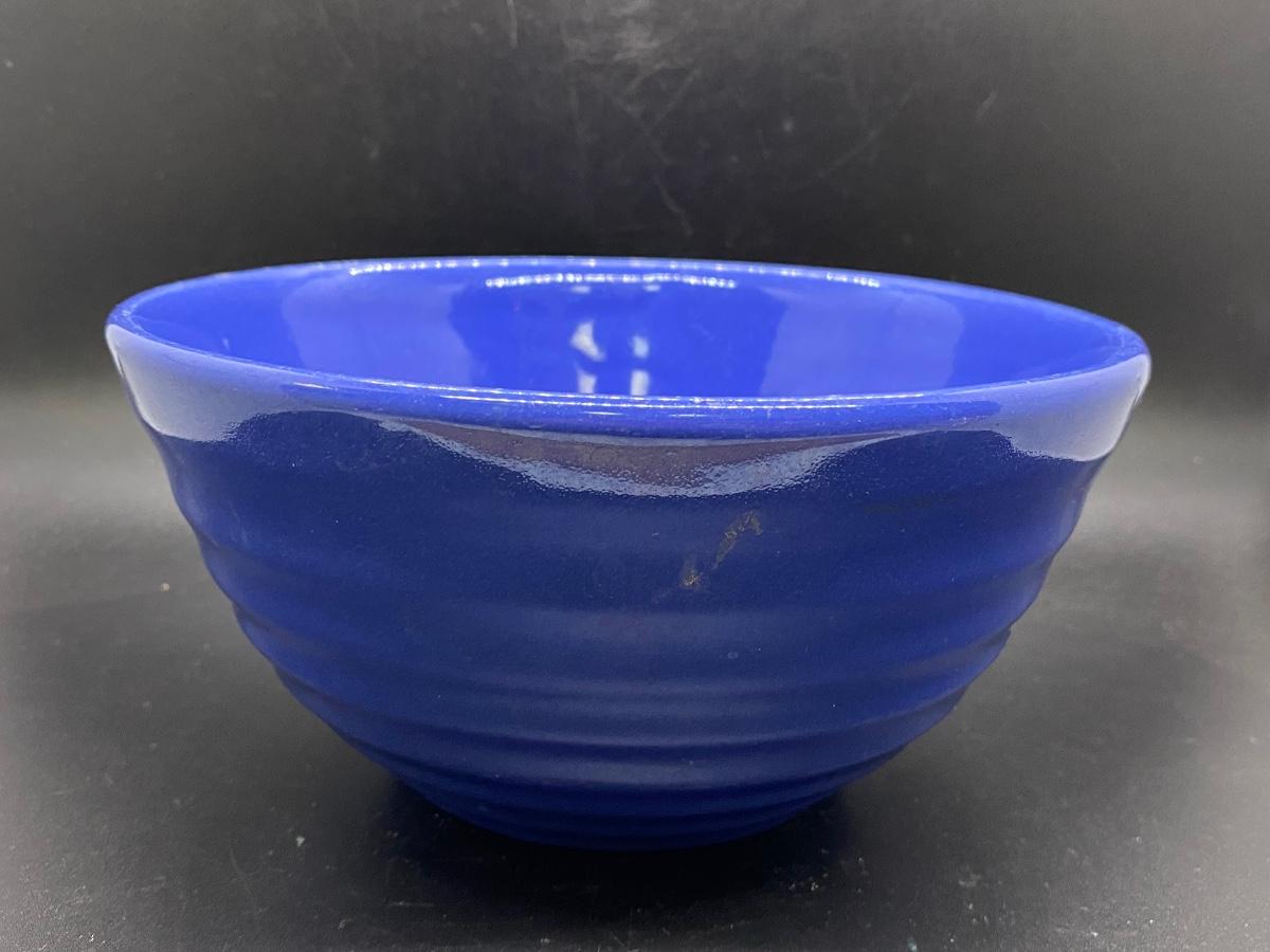 Vintage blue mauve colored beehive mixing bowl. Good vintage condition, some utensil scratches from use, no cracks or chips. Has 24 on the bottom, can't make out a name. About 7.5" diameter.