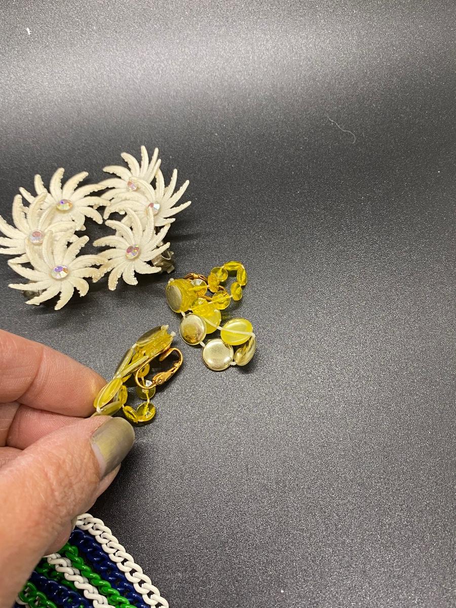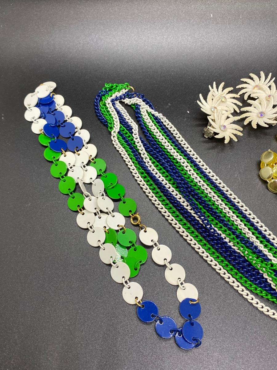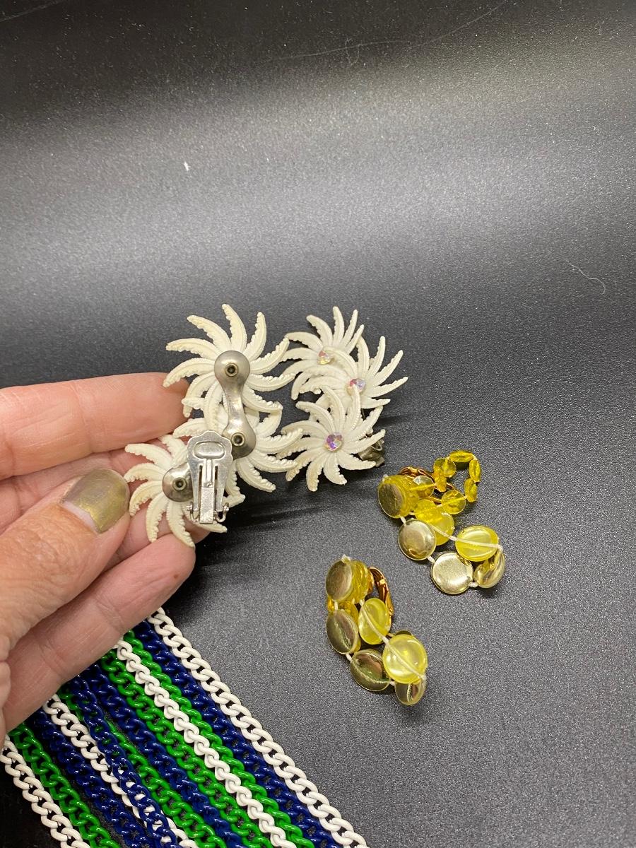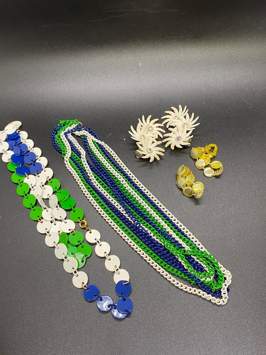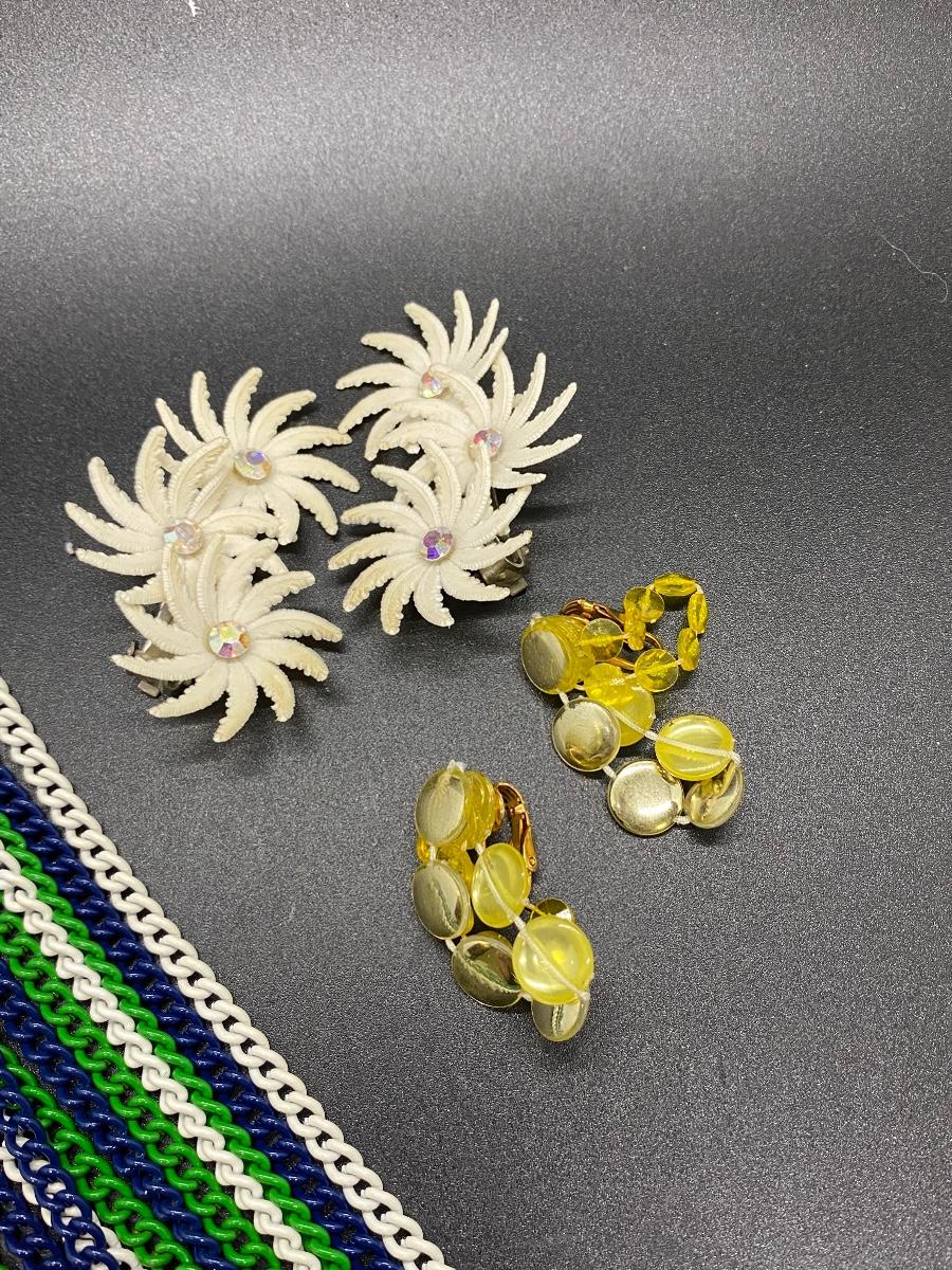 Vintage Plastic & Enamel Jewelry Lot. Necklaces are long can be doubled. Earrings are plastic, clip on style.