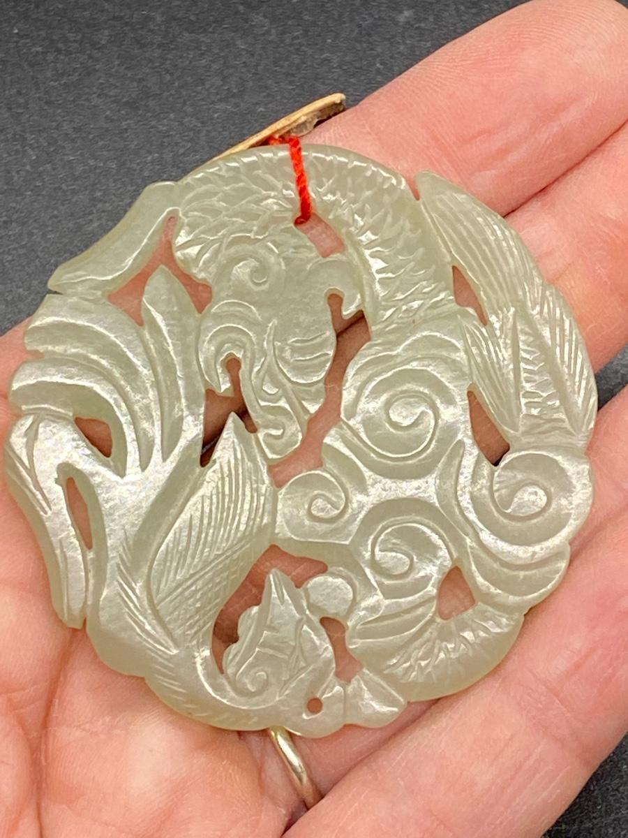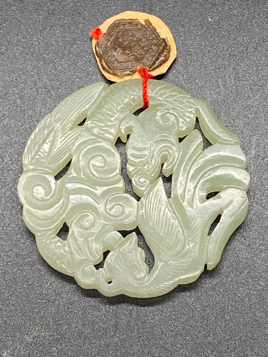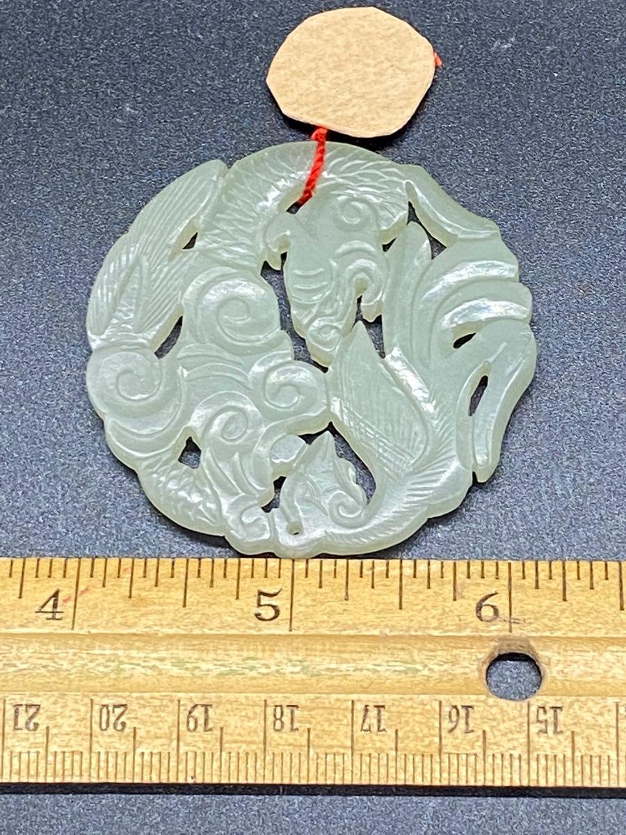 Vintage Carved Jade Dragon Medallion. Has a wax stamp tag attached. In good condition, no damage or cracks. About 2" size.