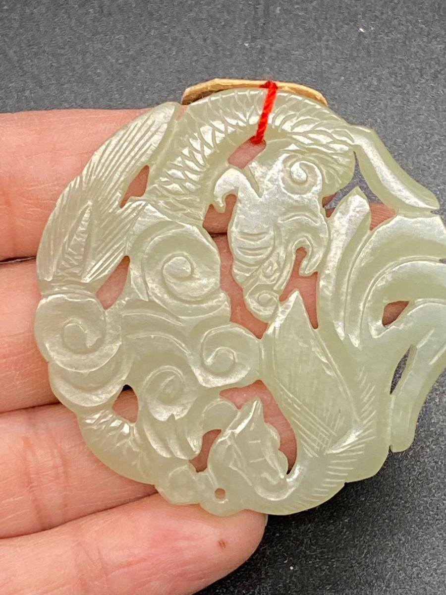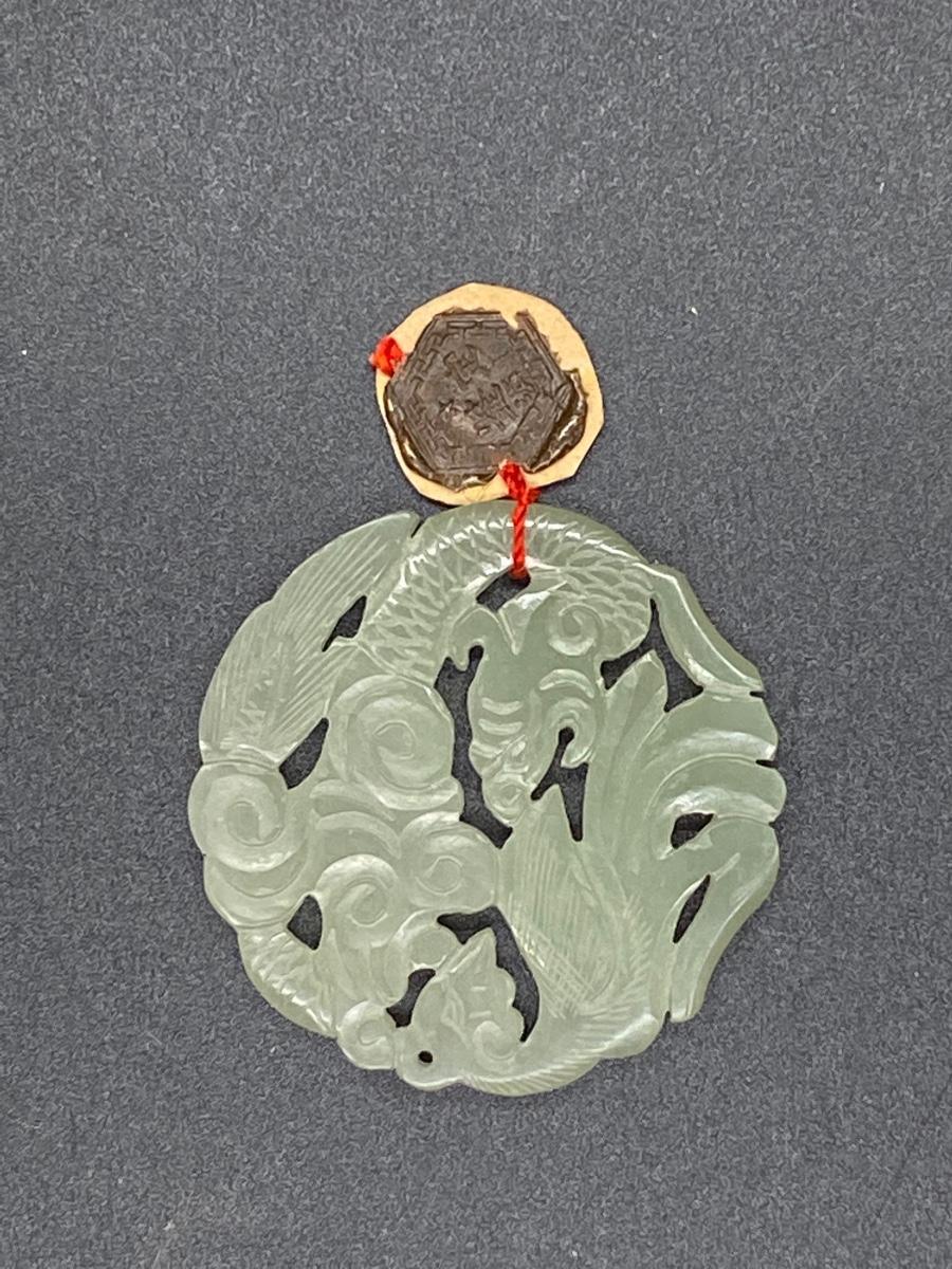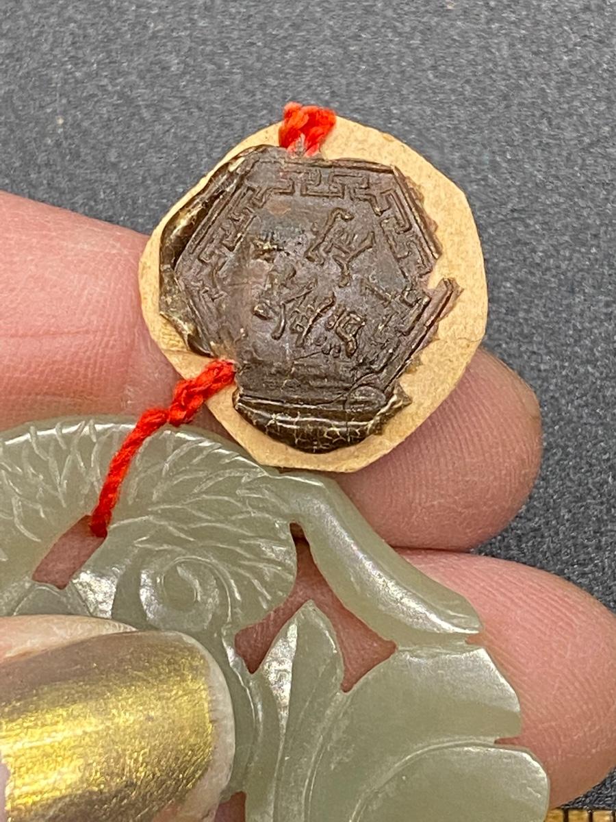 Vintage Carved Jade Dragon Medallion. Has a wax stamp tag attached. In good condition, no damage or cracks. About 2" size.