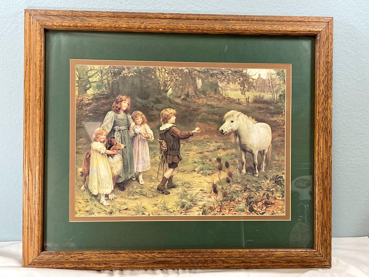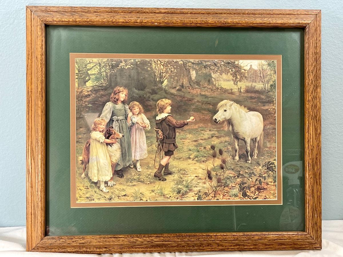 Framed Lithograph Art Print Children with Dog & Horse by John Elsley. Art piece is titled A Tempting Bait. Good condition.
