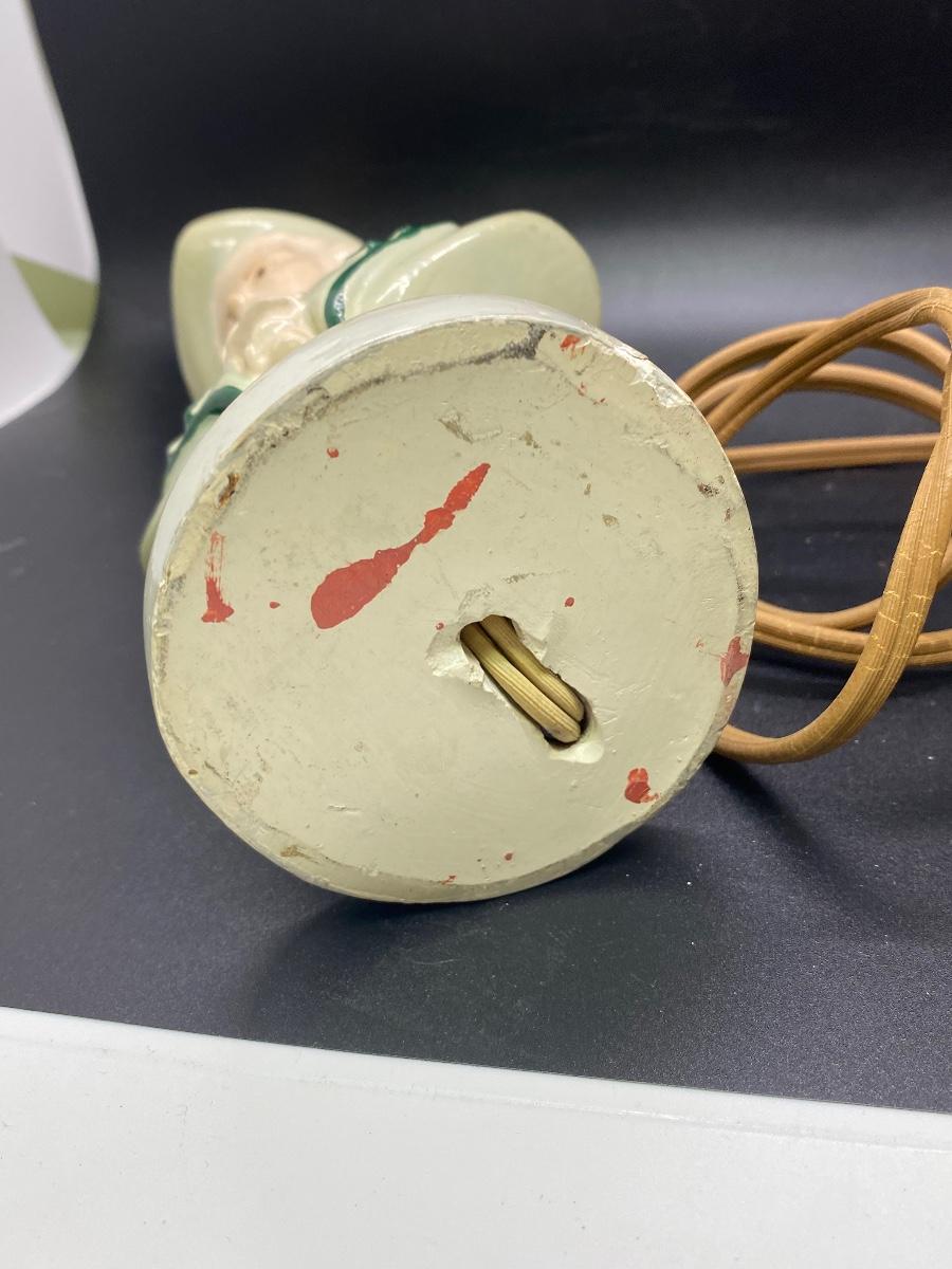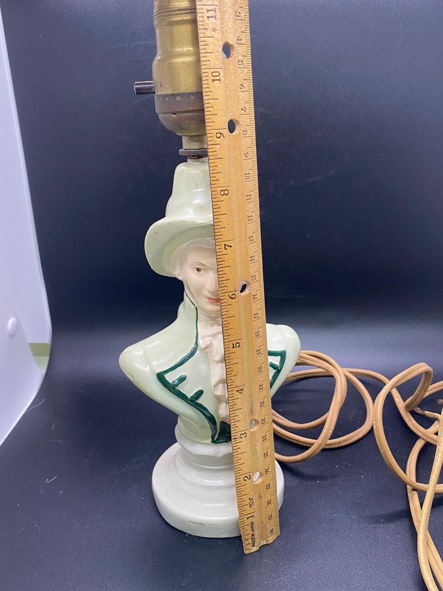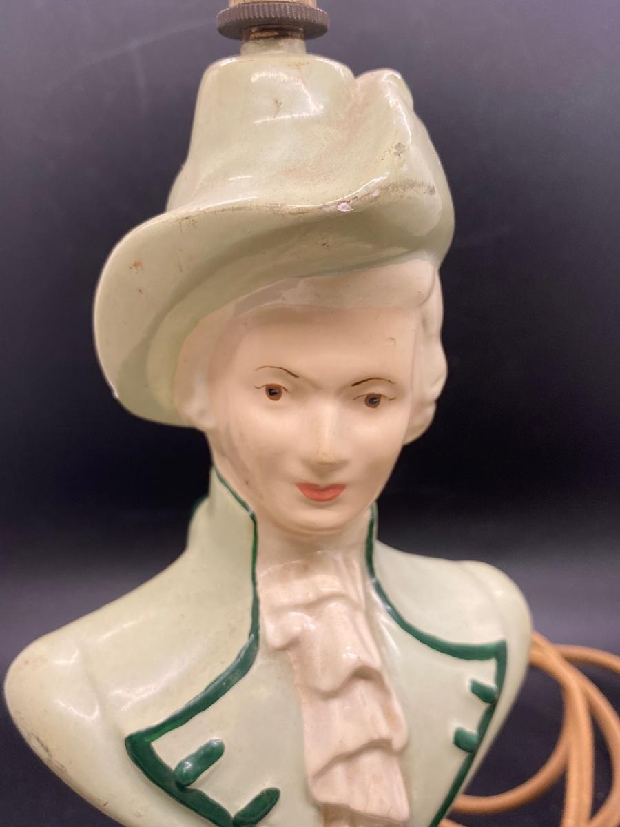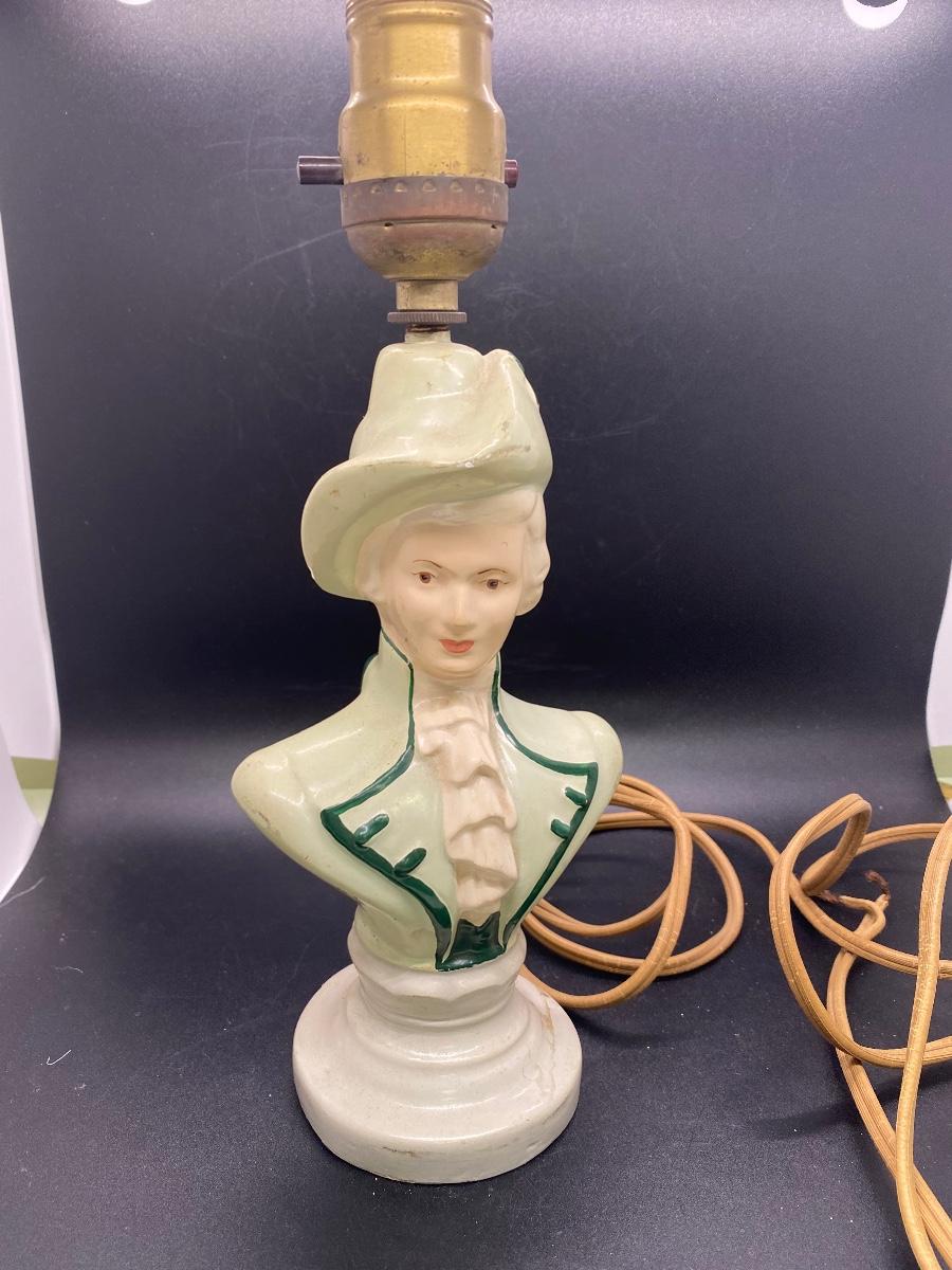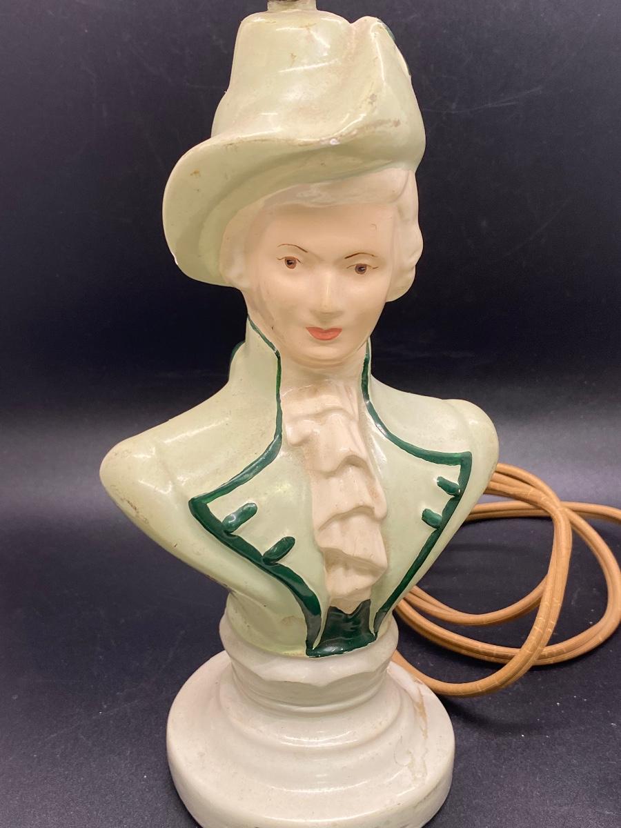 Vintage painted plaster lamp base of a Colonial style man bust. In vintage condition. Light wear, no shade. Small size, good for desk, dresser, nightstand. Untested, Cord needs to be replaced, no plug.