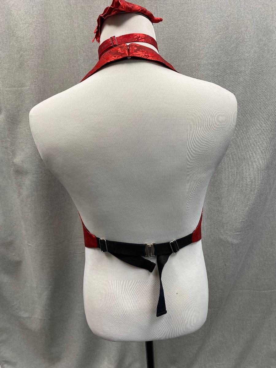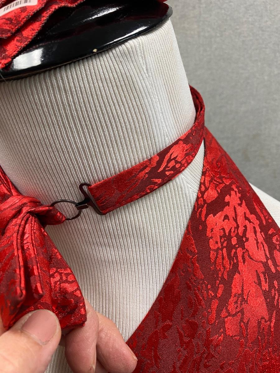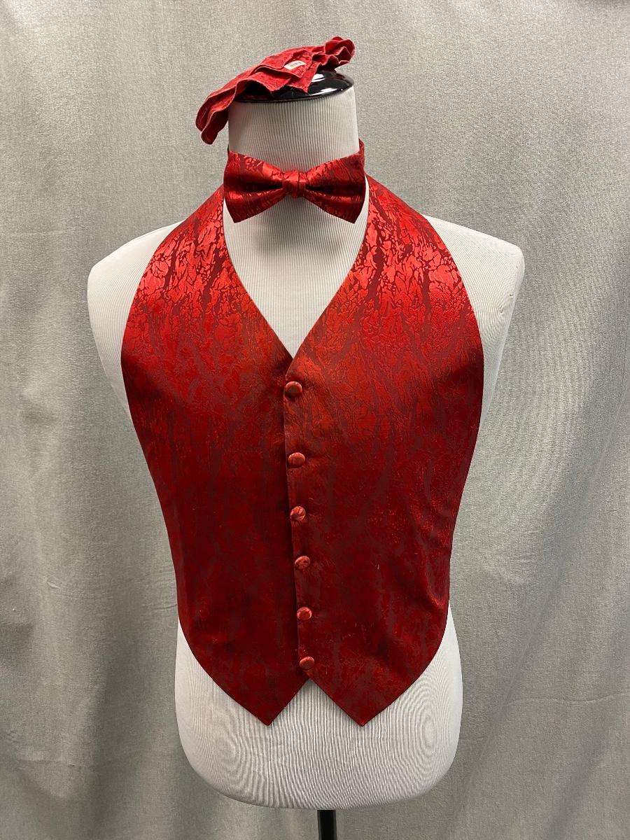 Vintage men's rest suit vest, bow tie and matching pocket square. Made by Santana, size medium but it is a bit adjustable in the back. Bow tie is adjustable size also. Textured look red fabric.