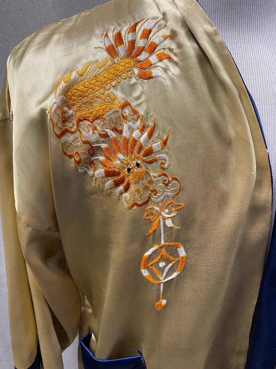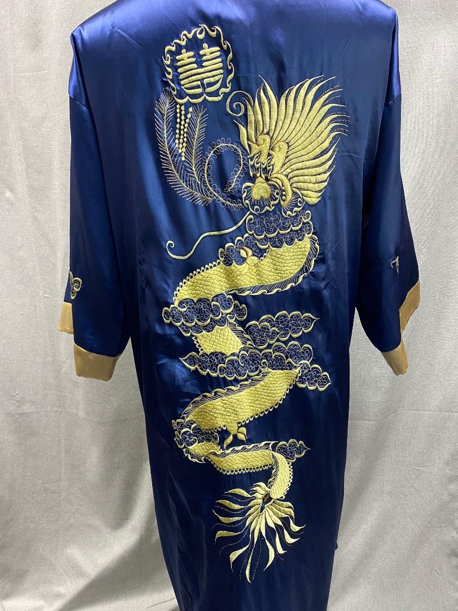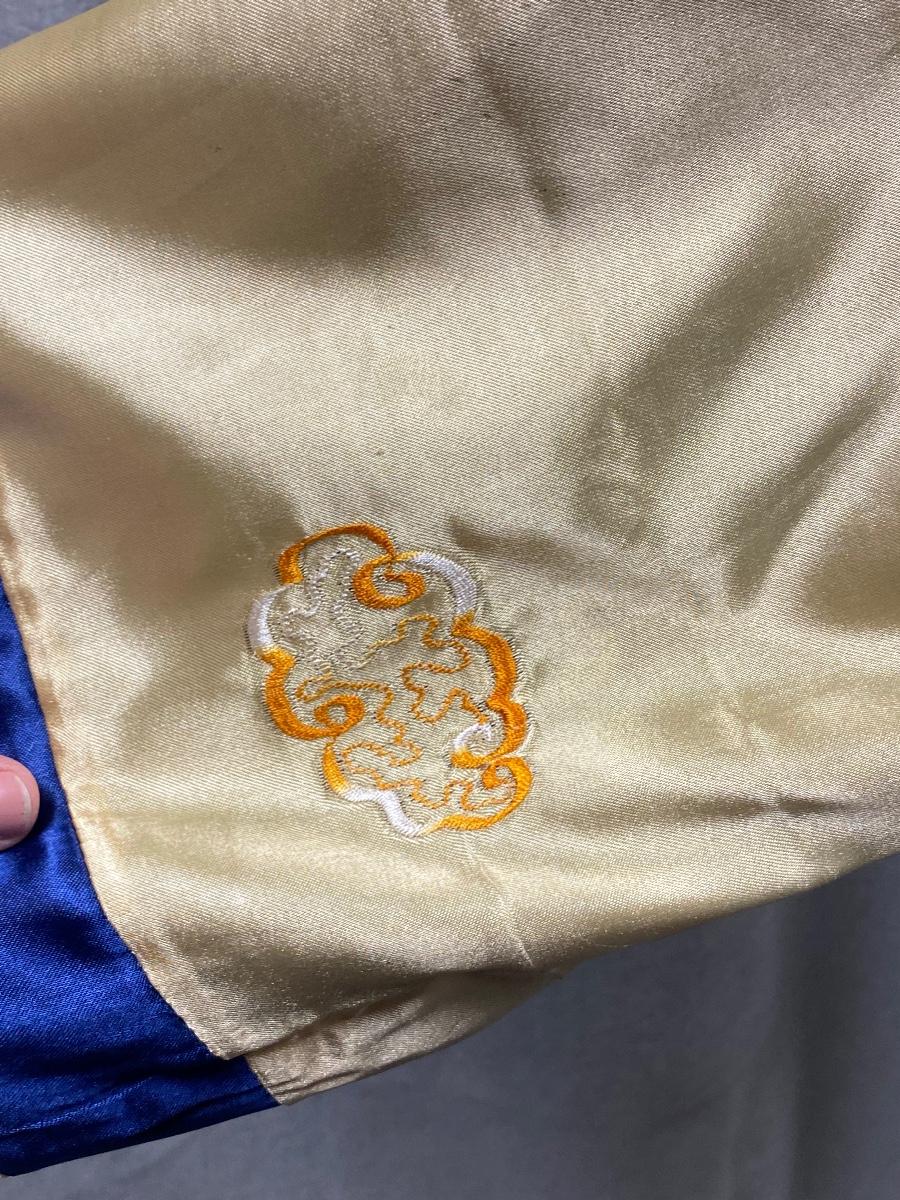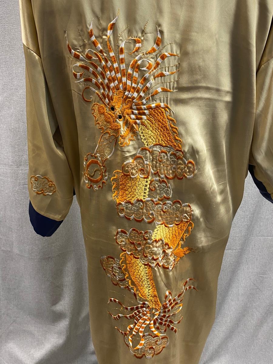 Blue and gold dragon embroidered reversible kimono robe. Blue with gold stitching on one side, gold with orange stitching on the other. Pockets on both sides. Size tag removed, believe it is a size medium. Good previously worn condition. No spots or tears, a couple small snags and pulled seams in satin but nothing to bad. About shin length.