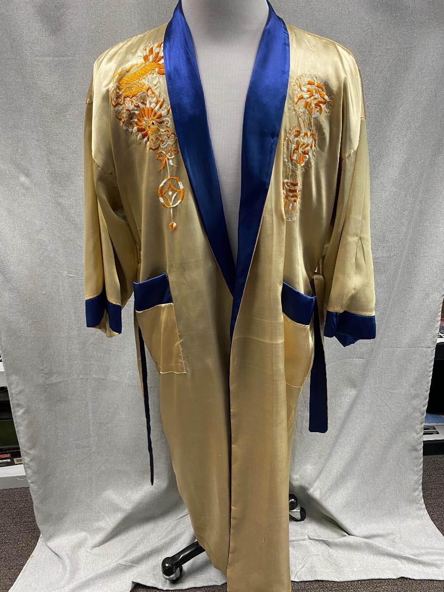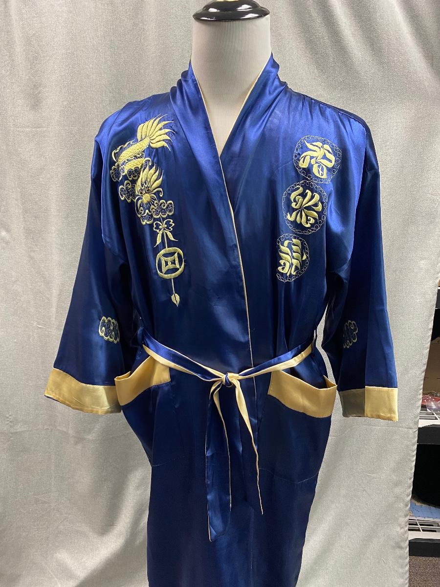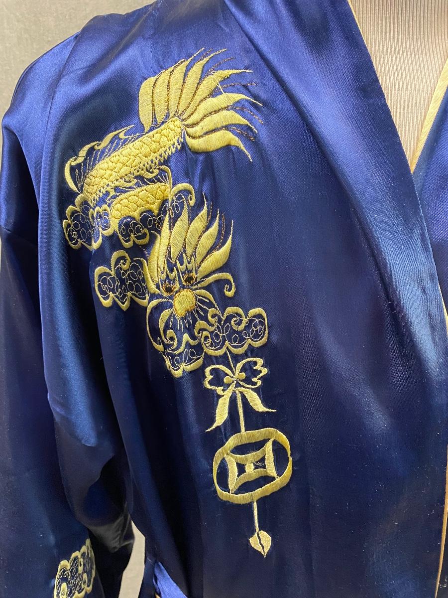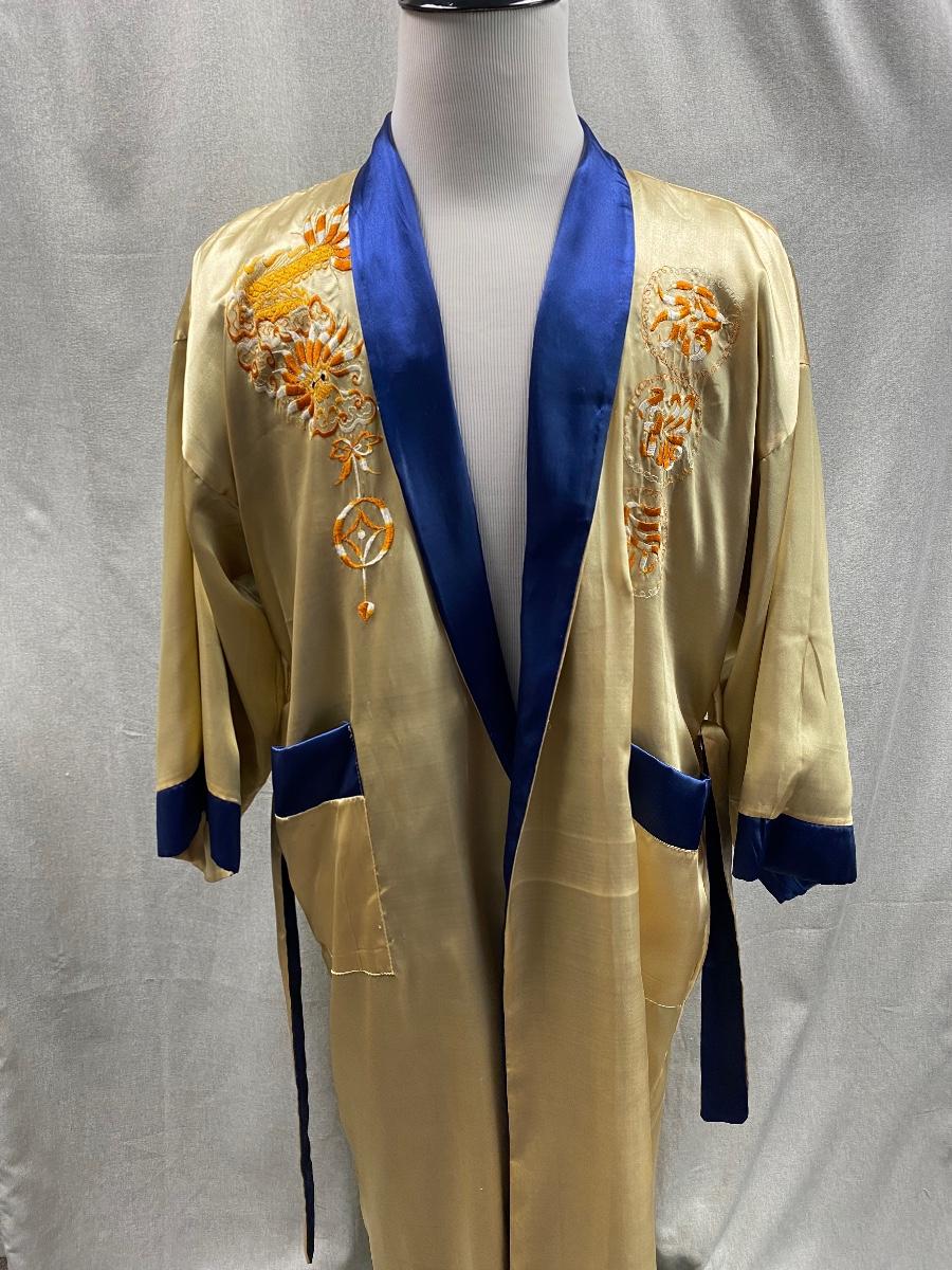 Blue and gold dragon embroidered reversible kimono robe. Blue with gold stitching on one side, gold with orange stitching on the other. Pockets on both sides. Size tag removed, believe it is a size medium. Good previously worn condition. No spots or tears, a couple small snags and pulled seams in satin but nothing to bad. About shin length.