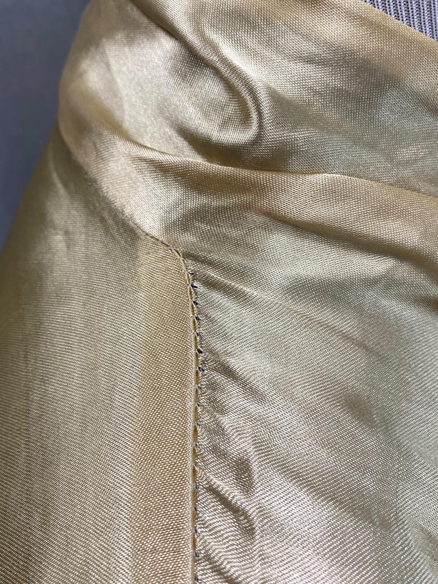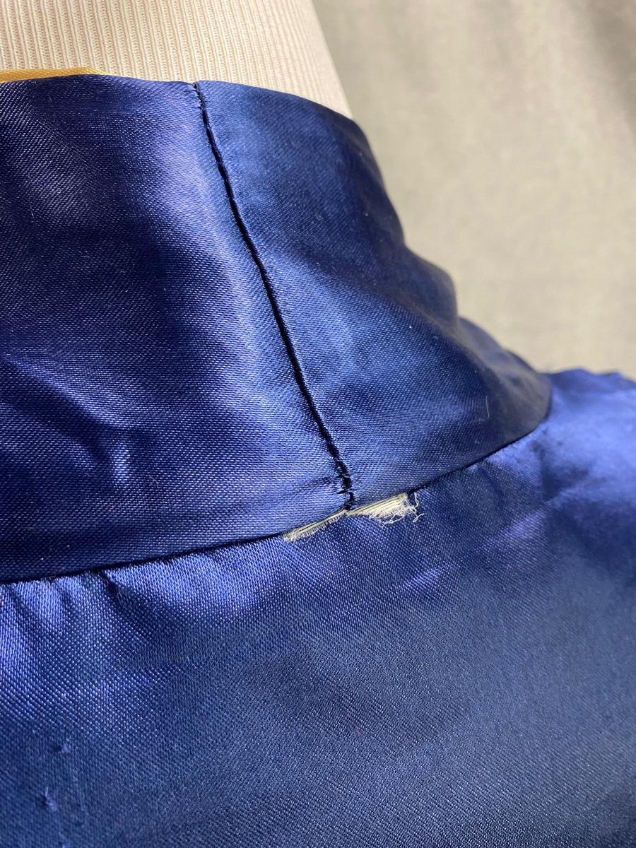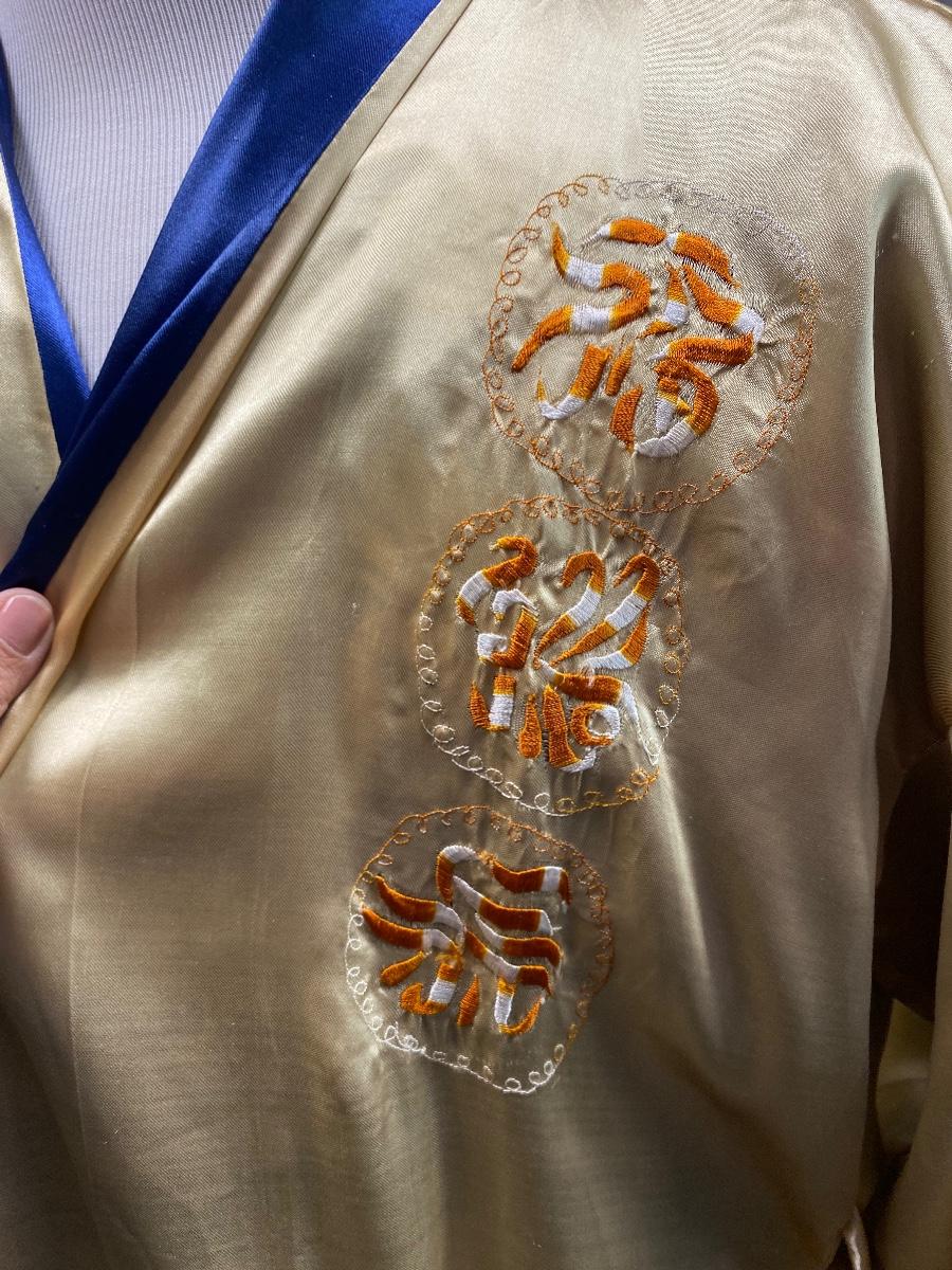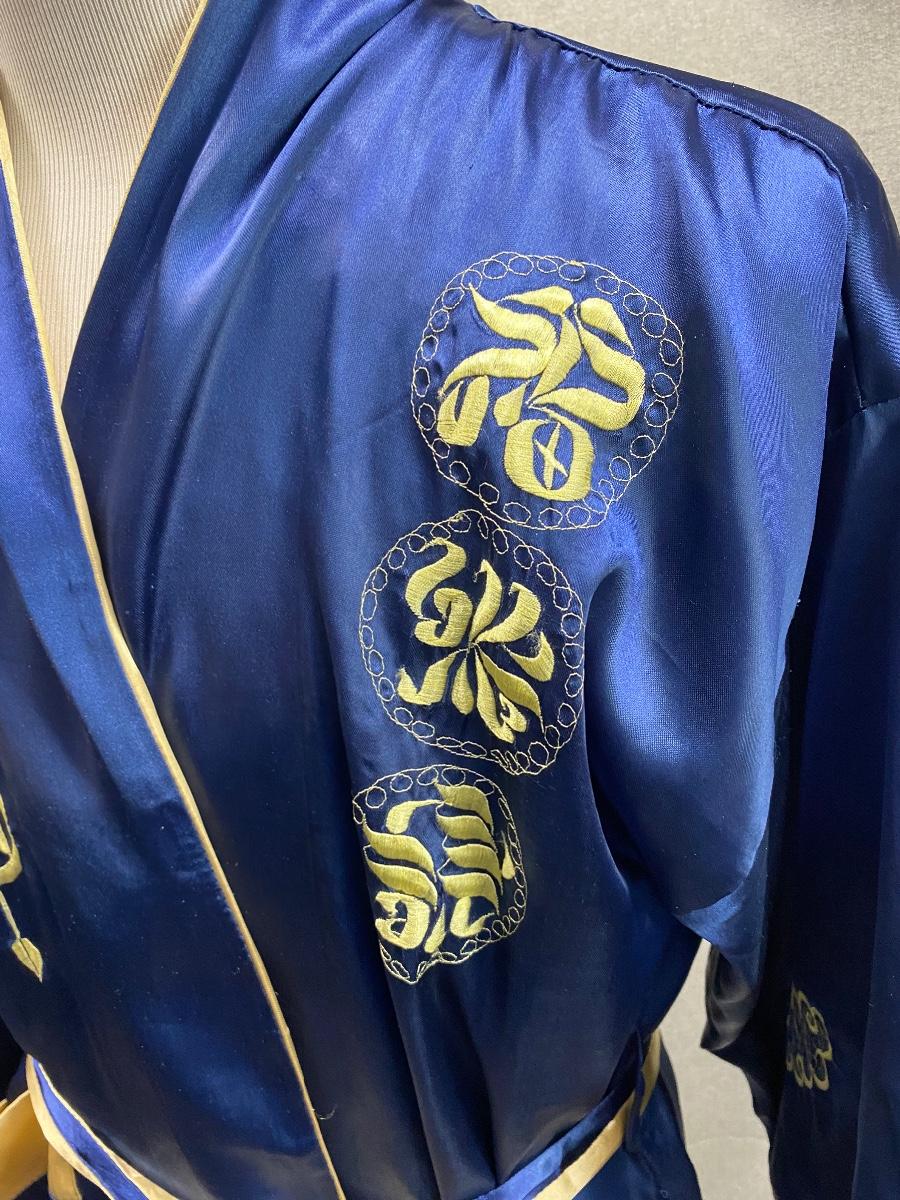 Blue and gold dragon embroidered reversible kimono robe. Blue with gold stitching on one side, gold with orange stitching on the other. Pockets on both sides. Size tag removed, believe it is a size medium. Good previously worn condition. No spots or tears, a couple small snags and pulled seams in satin but nothing to bad. About shin length.