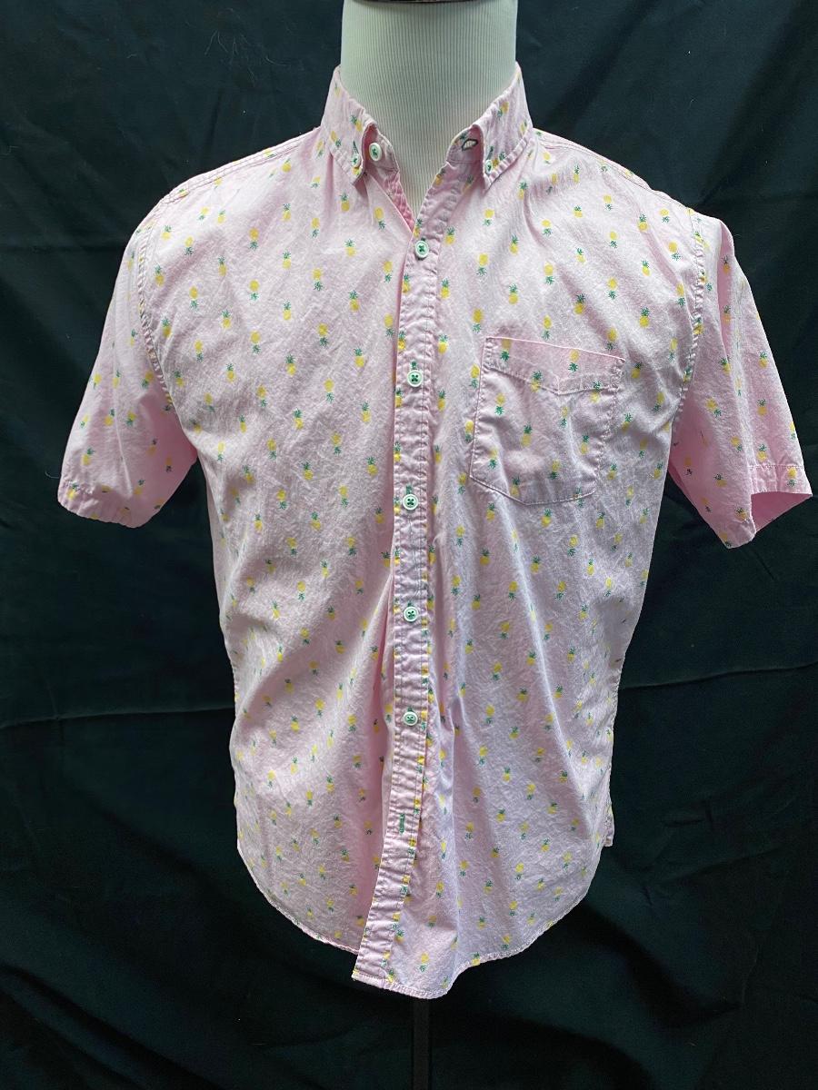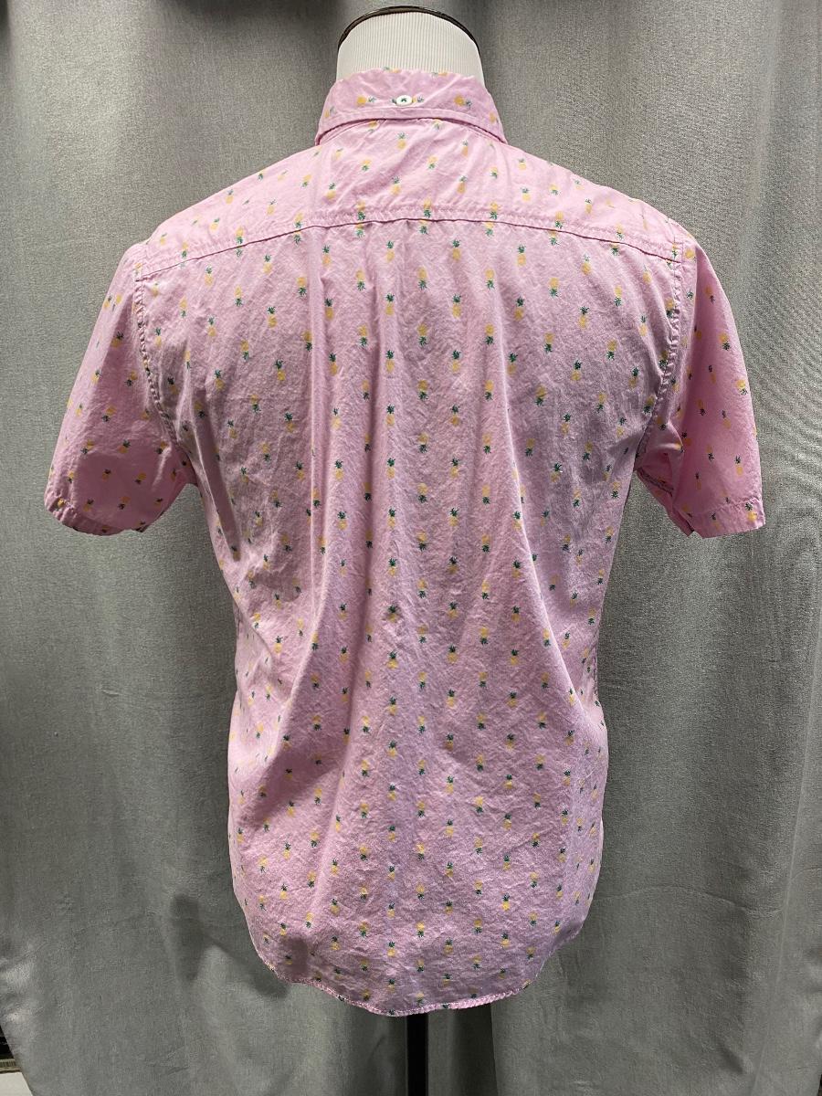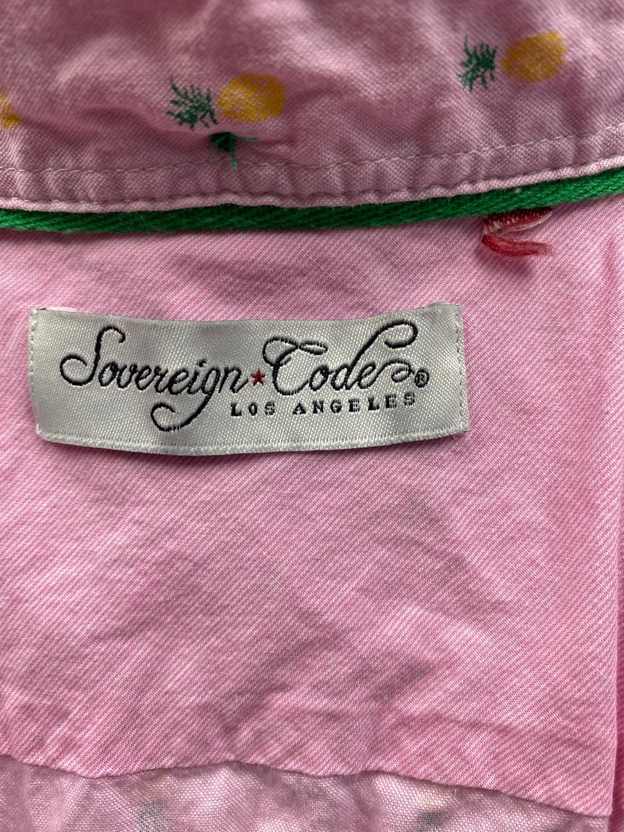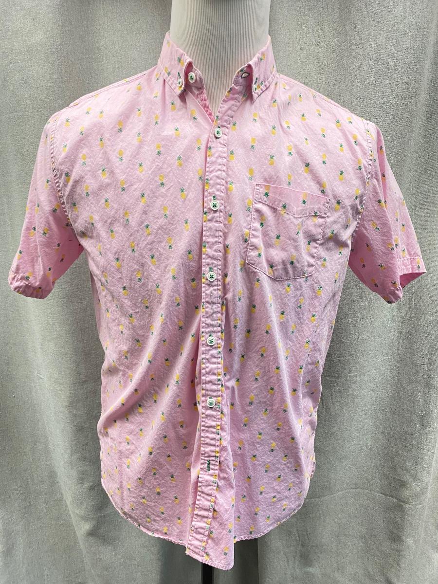 Sovereign Code LA men's pale pink pineapple patterned button front shirt. Short sleeve. Size tag removed, looks like a medium or slim fit large. Good condition.