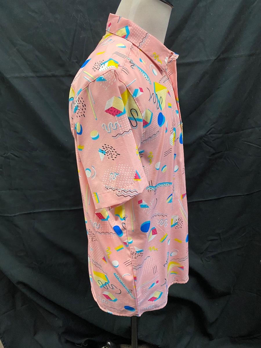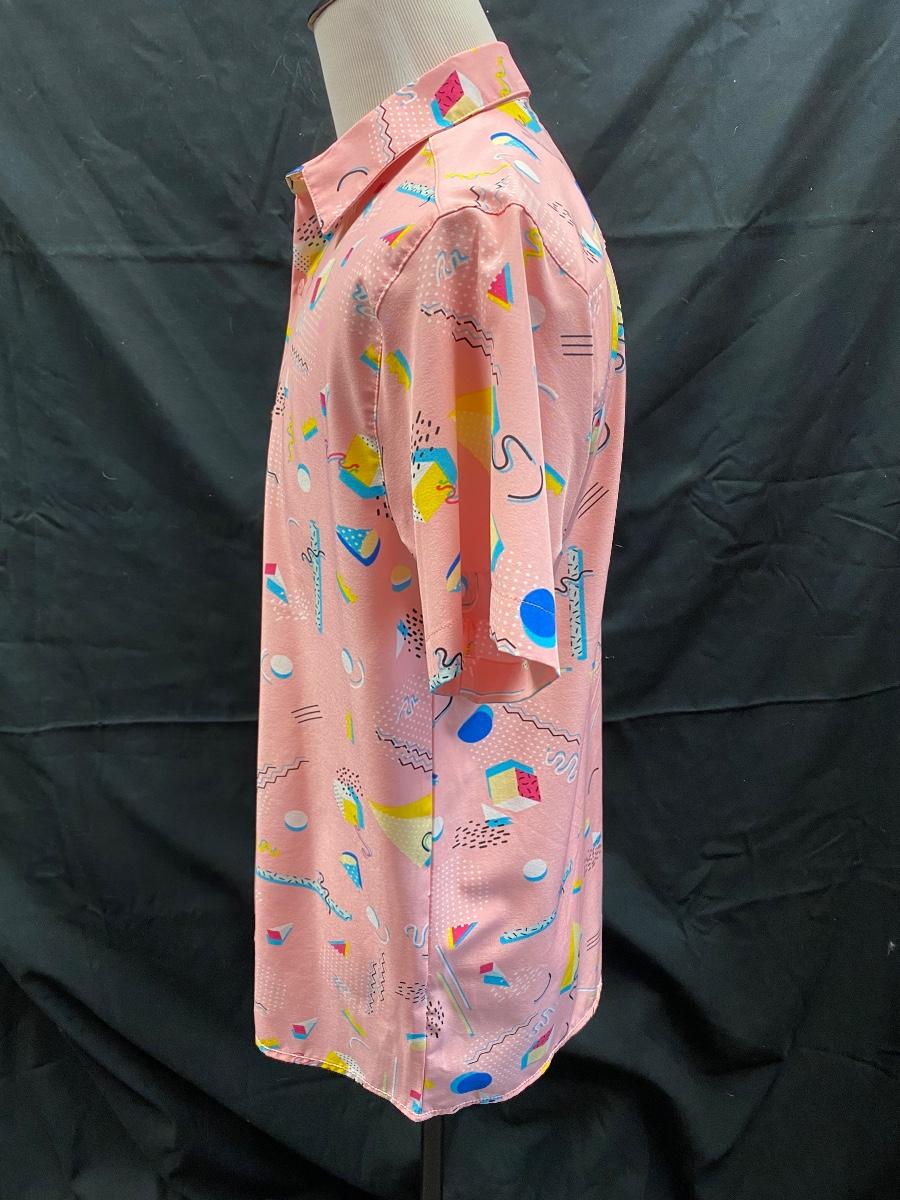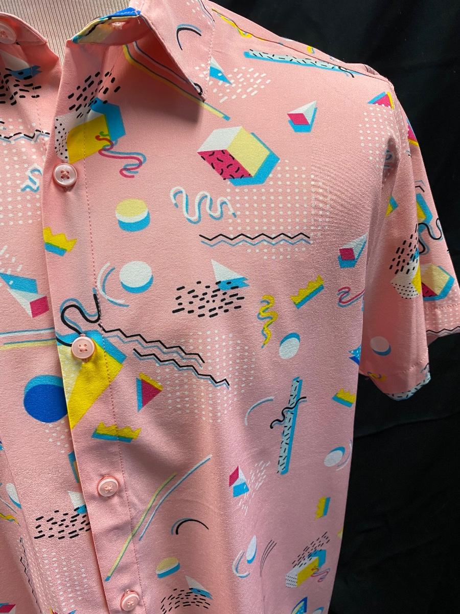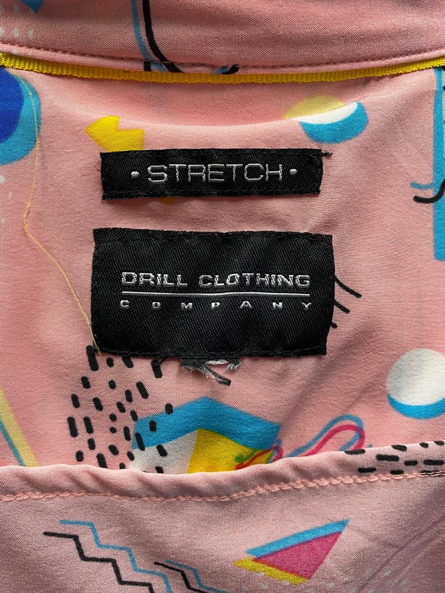 Colorful funky geometric button front men's shirt from Drill Clothing Company. 1980s vibe pattern. Short sleeve. Size tag has been removed, Label says stretch, believe it might be a medium, possibly large size. Good condition.