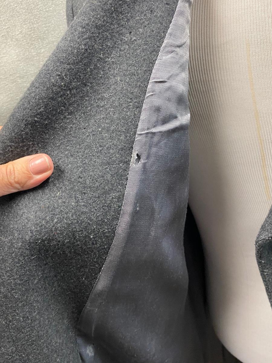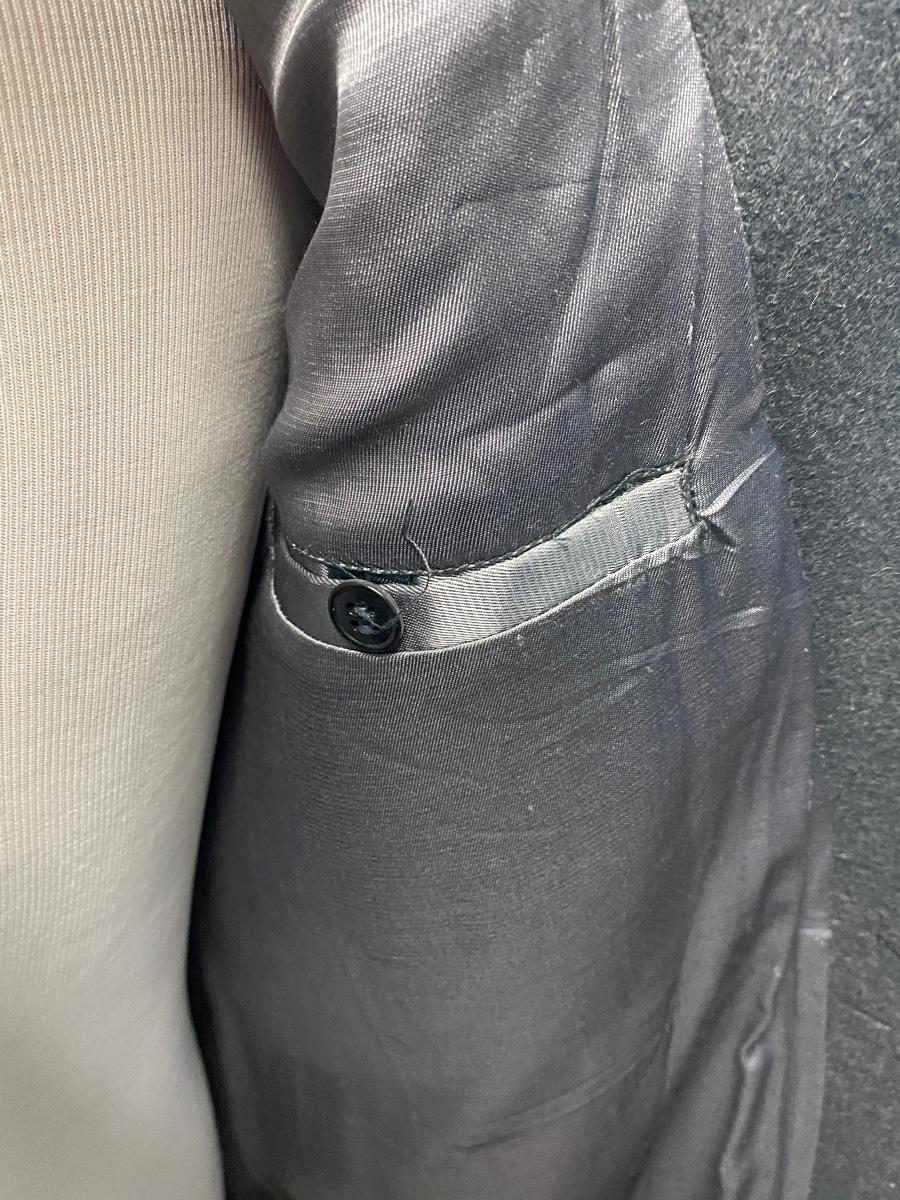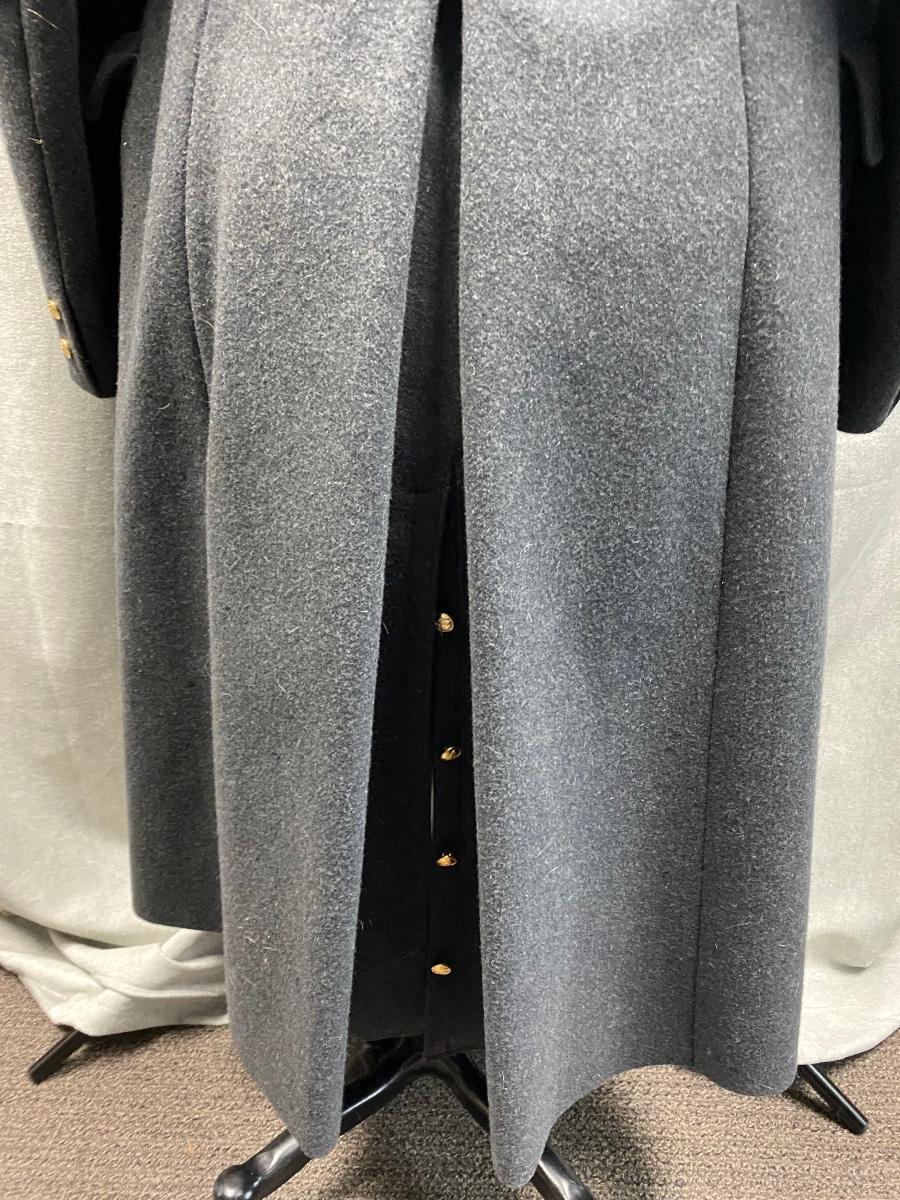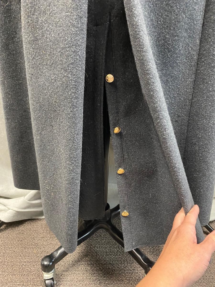 Vintage Soviet Russian heavy wool trench coat jacket Grey with red lapel stripes and gold button details. Buttons have the sickle and star emblem on them. No tags, medium maybe large size. Extremely heavy. In good condition, a few small holes along inside seam.