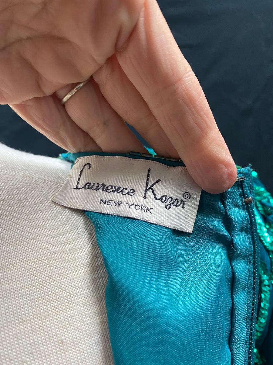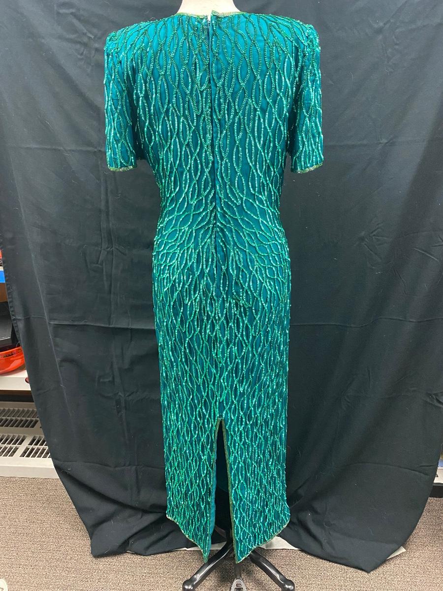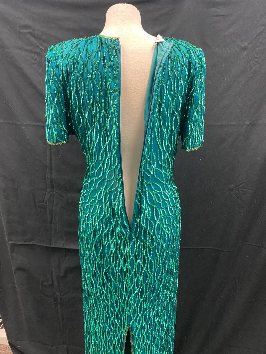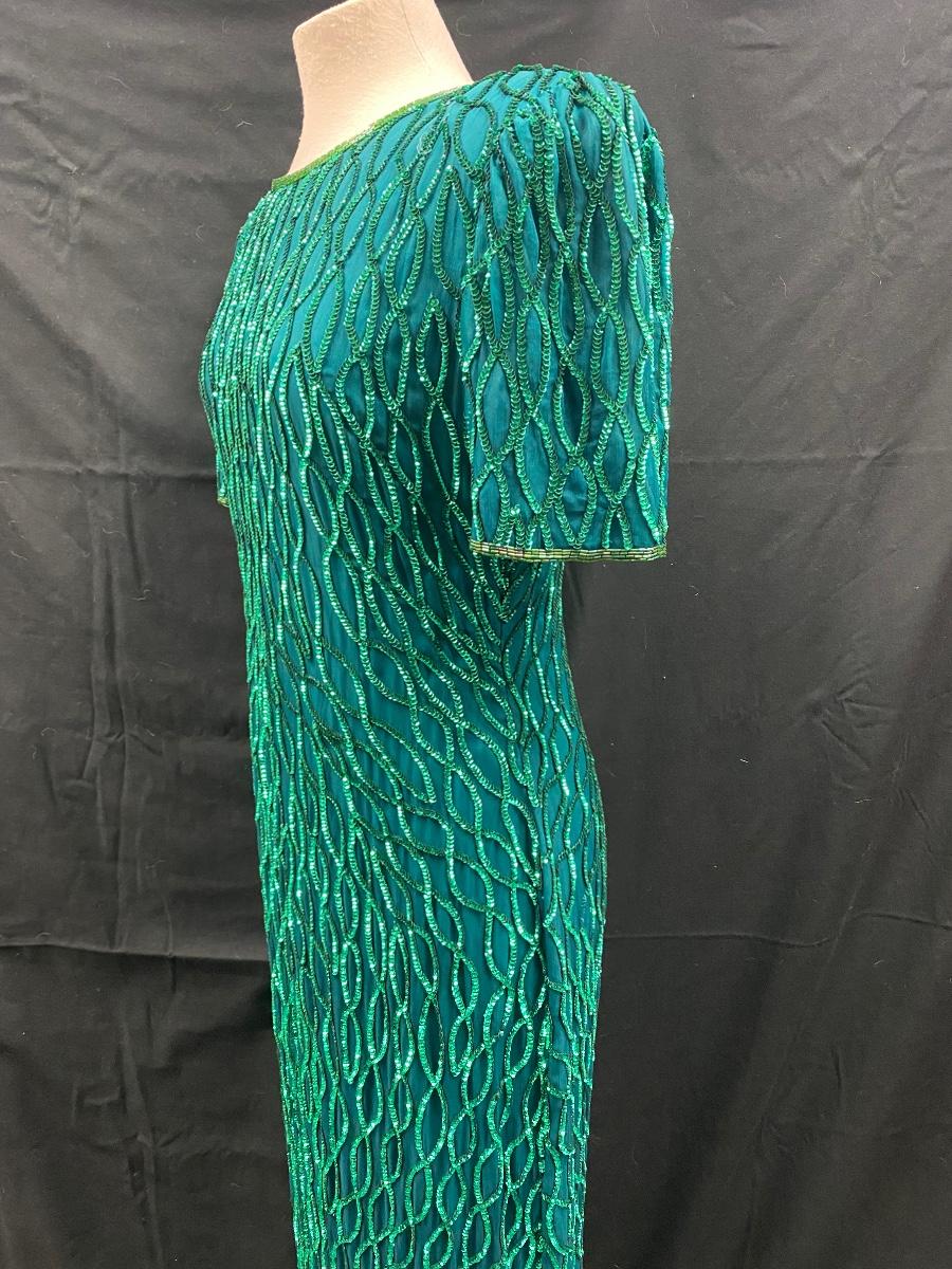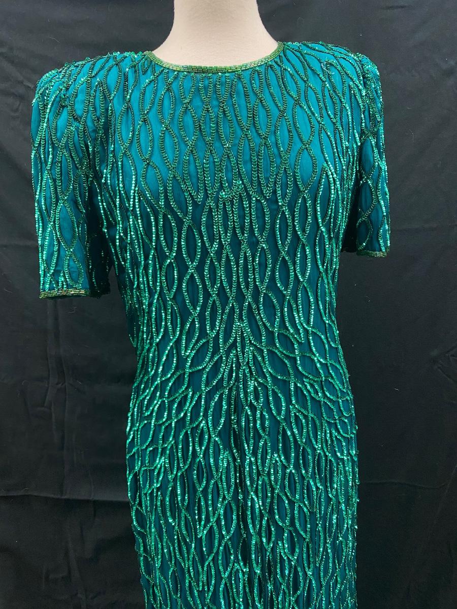 Retro emerald green woman's sequined party dress. Retro style, short sleeve with shoulder pads. Zipper back, ankle length. Made by Laurence Kazar New York, size medium (10/12ish). Good condition.