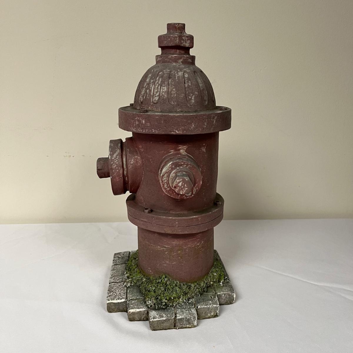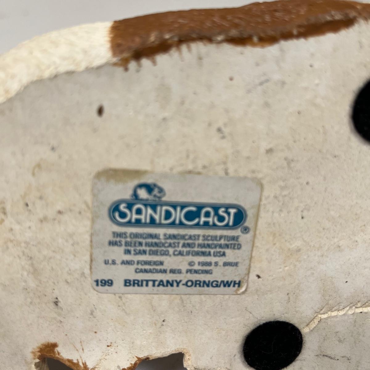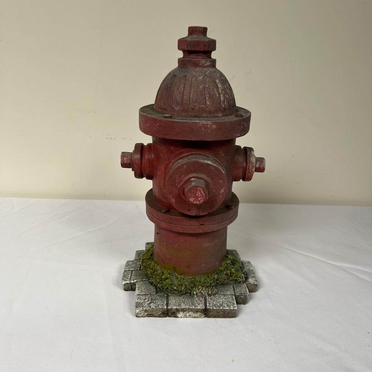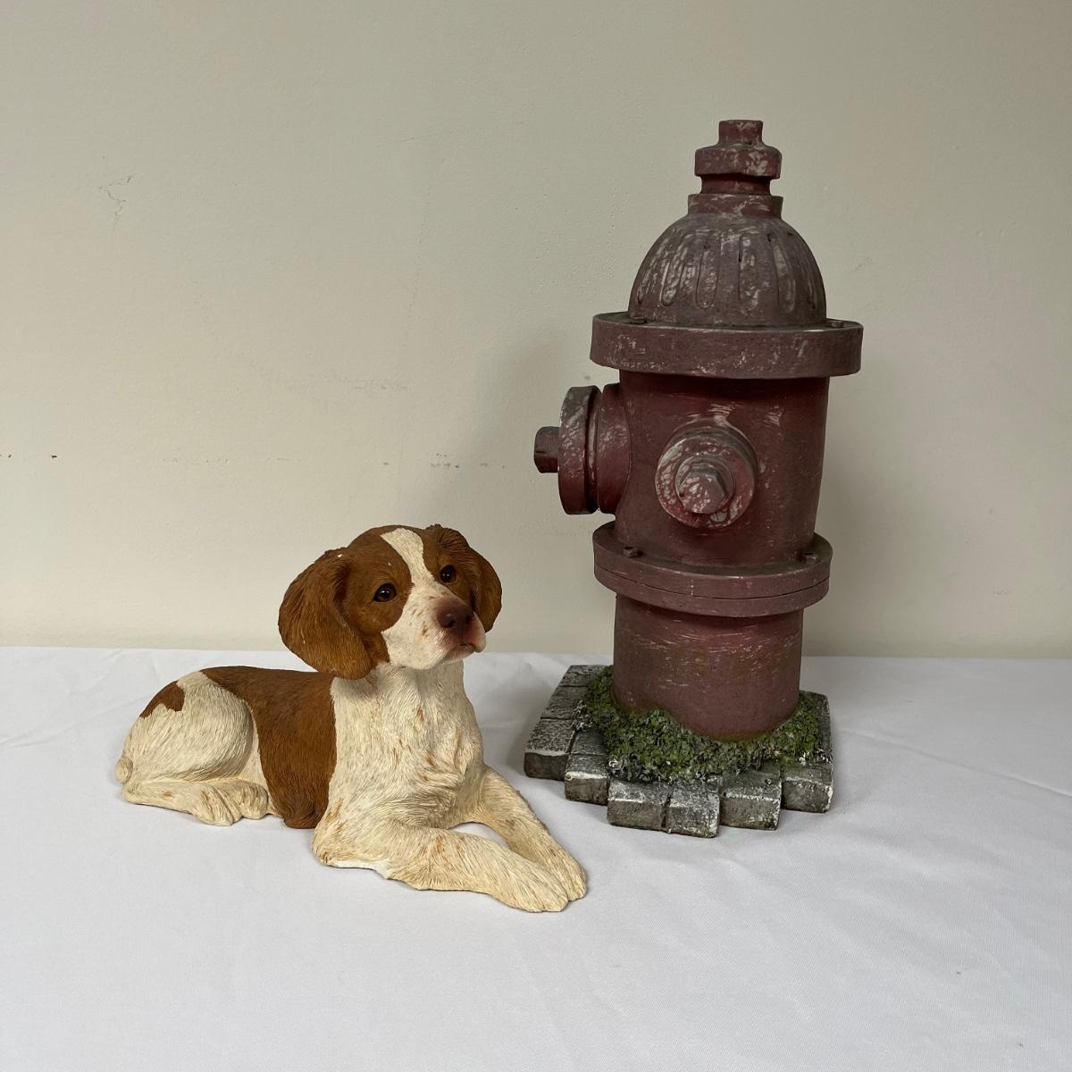 Lot includes a Handcrafted and hand painted Sandicast dog and a resin fire hydrant. Dog has initials etched on back. Dog has a chip on leg (see pictures) and measures 5” x 11” x 6.5”. The fire hydrant measures approximately 7.5” x 6.5” x 13.5”.