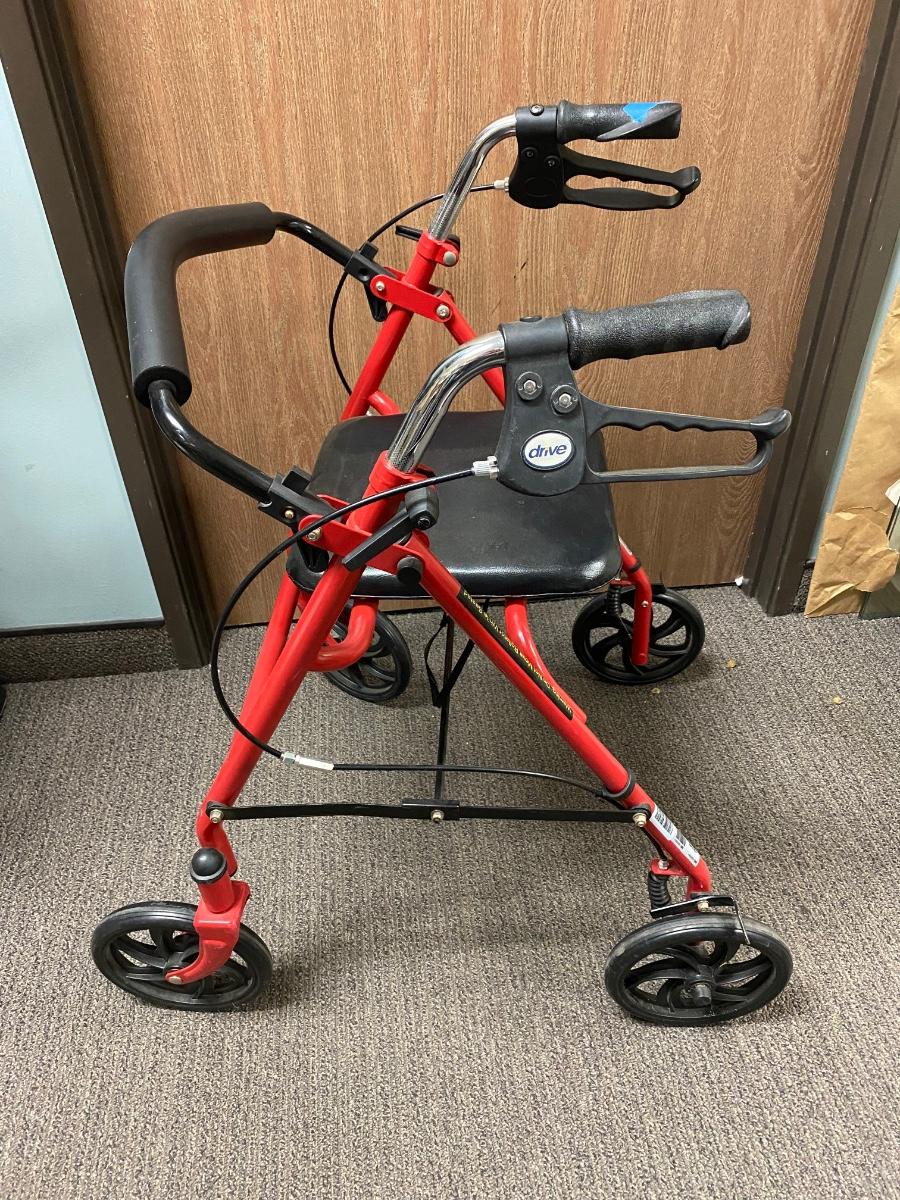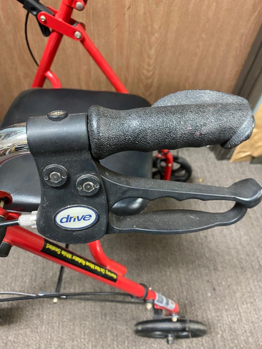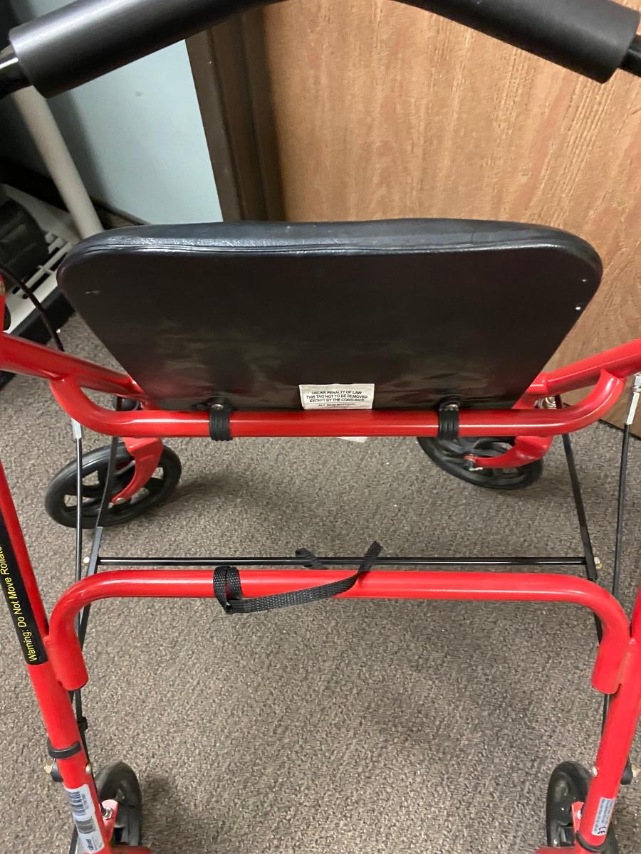 Bright Red Wheeled Mobility Walker with Seat and Hand Brakes. In good used condition. 17" space between handlebars. Height can be adjusted with raising and lowering handles. Foldable, no under seat storage but could easily have one added. 300lb capacity.