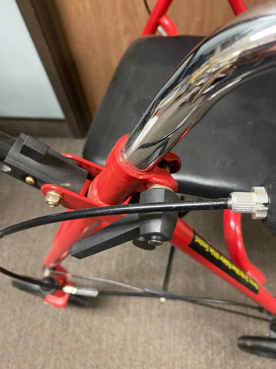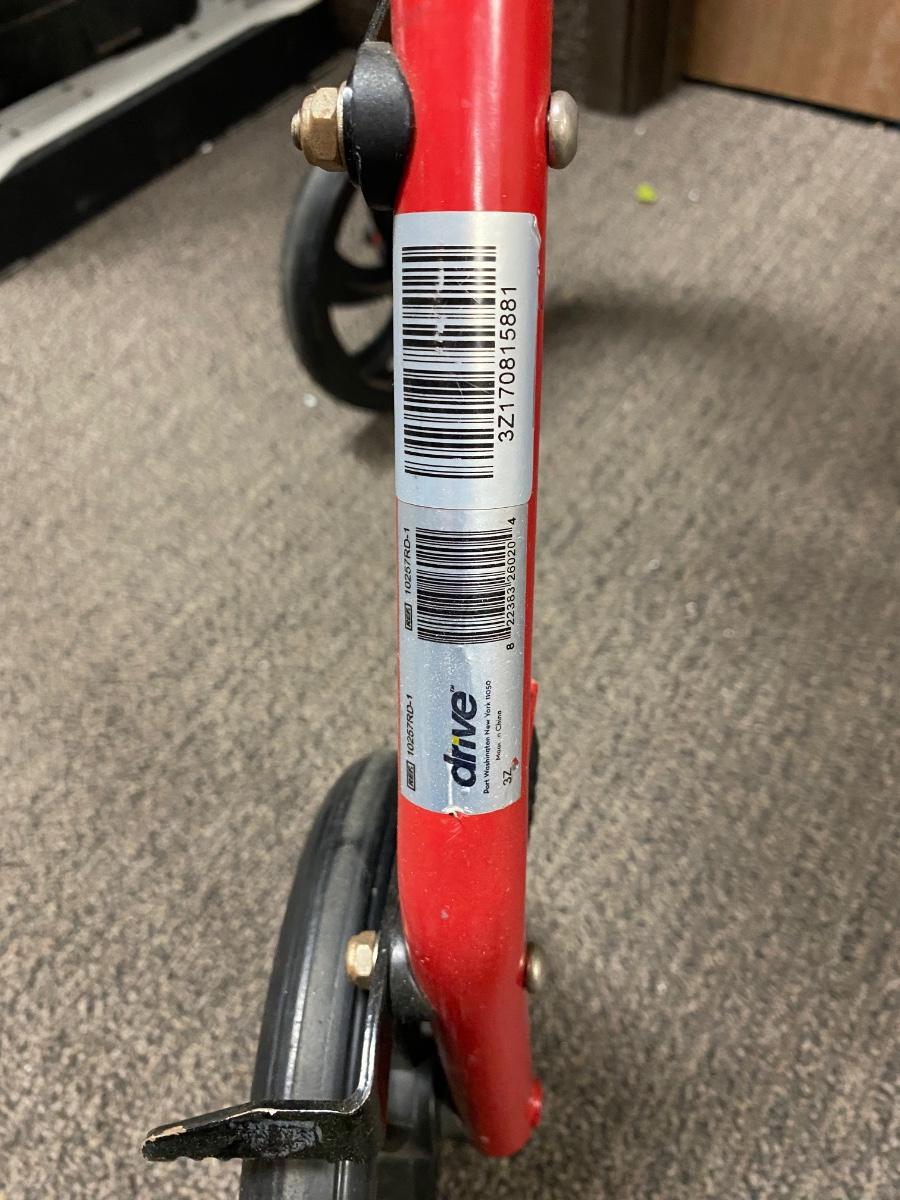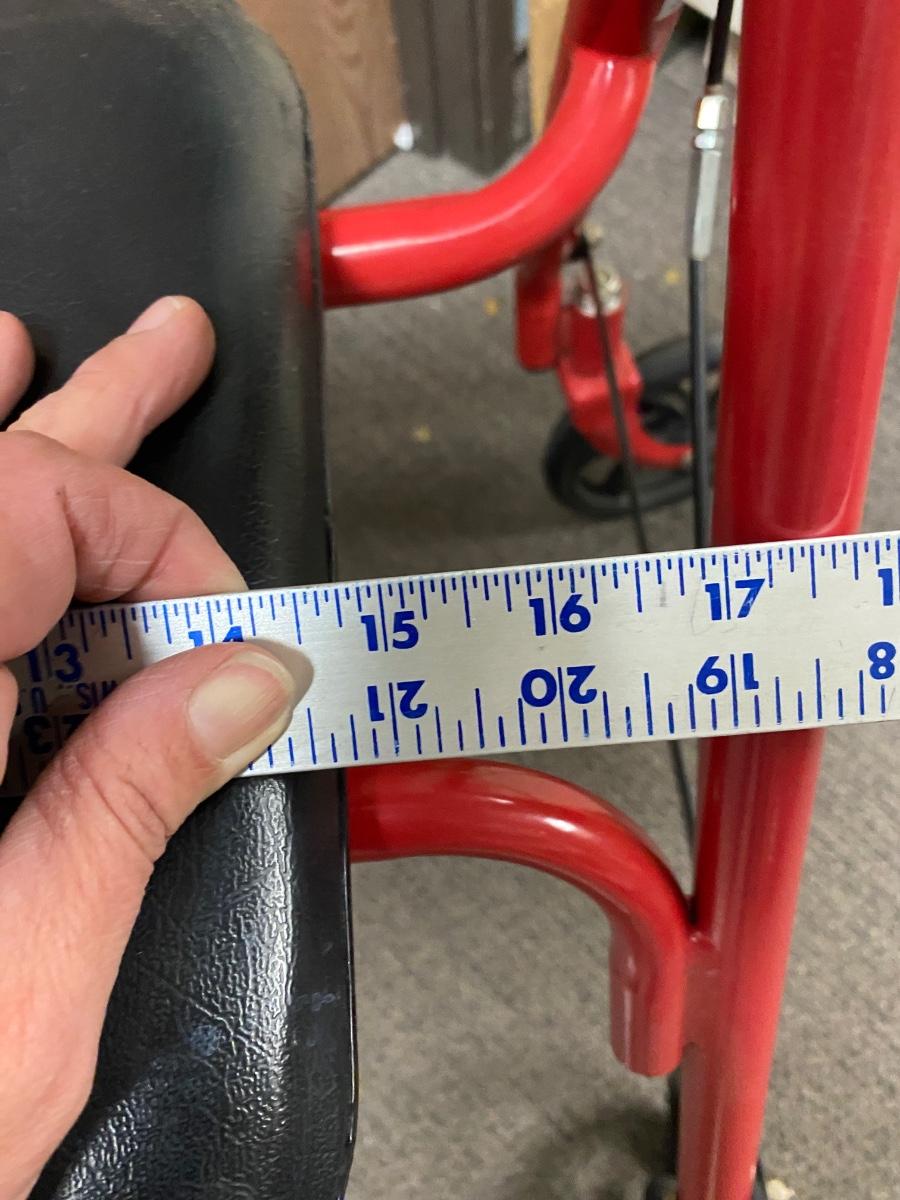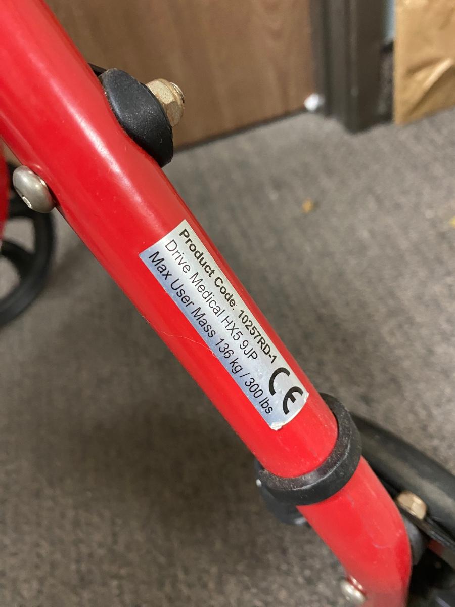 Bright Red Wheeled Mobility Walker with Seat and Hand Brakes. In good used condition. 17" space between handlebars. Height can be adjusted with raising and lowering handles. Foldable, no under seat storage but could easily have one added. 300lb capacity.