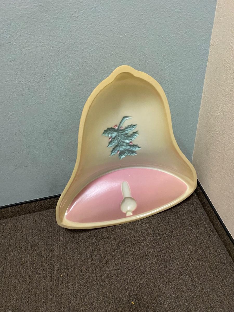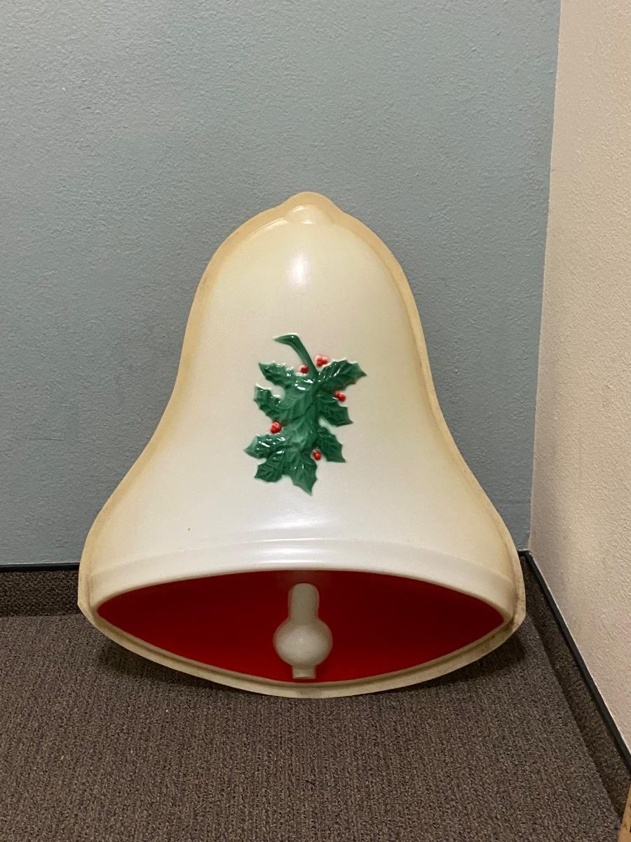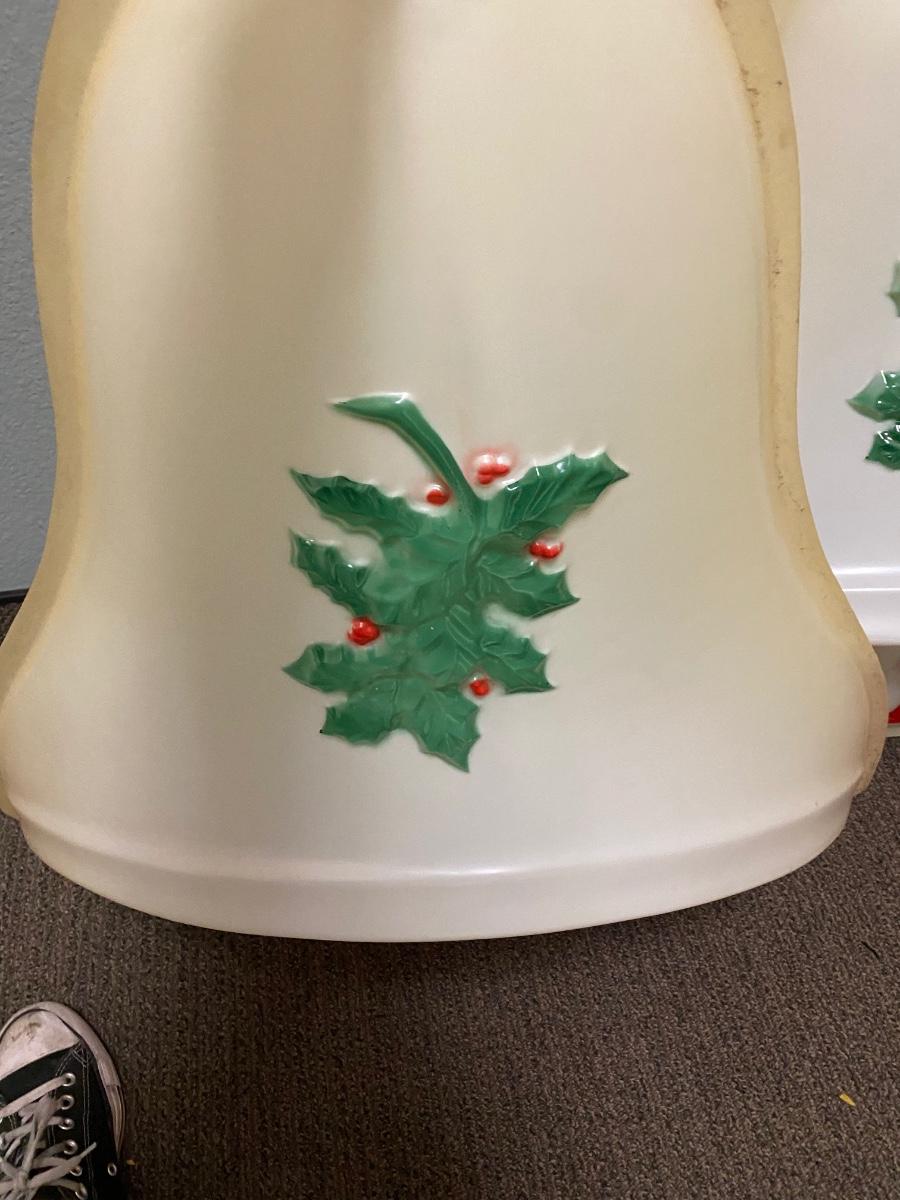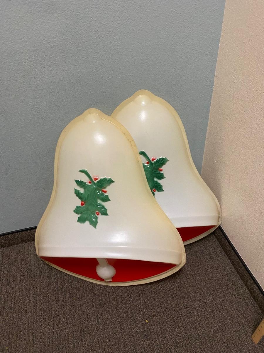 Set of Two Large Blow Mold Plastic Christmas Holiday Bell Wall Decor. In good condition, no cracks but some light discolor from age. About 27"x30" size.