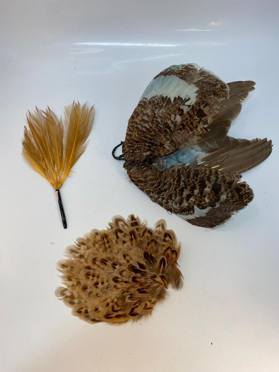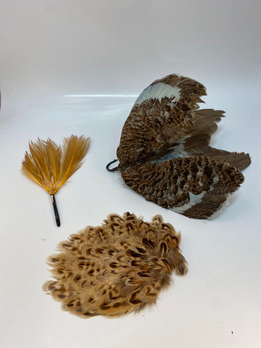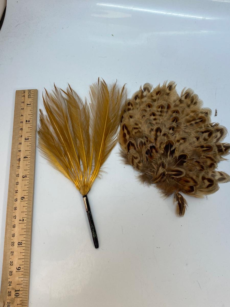 Beige Natural Tone Bird Feather Lot for Crafting and Fashion. One set has wings attached, look like they are from grouse or another small game bird and have been tinted blue.
