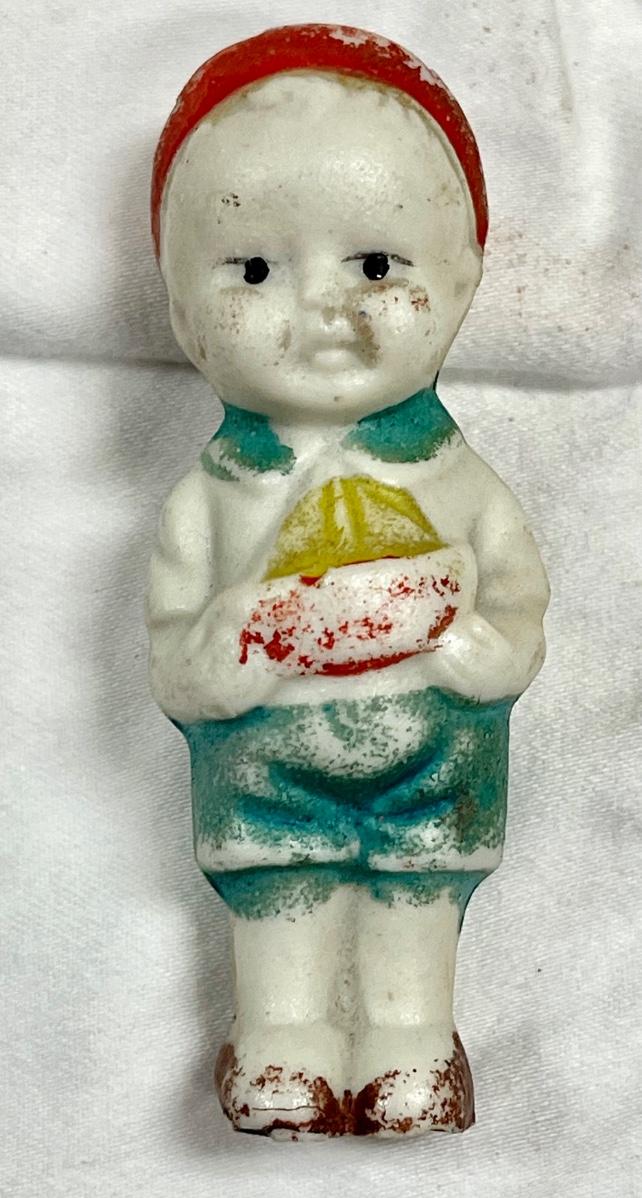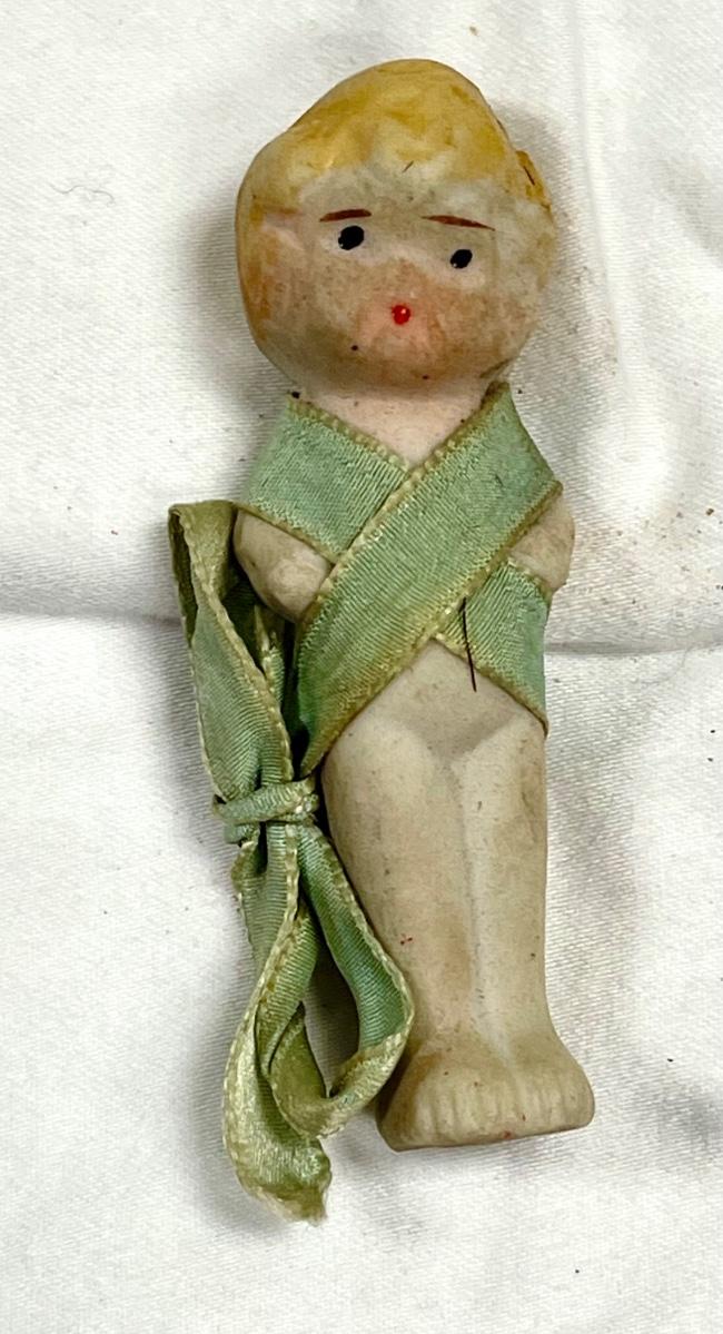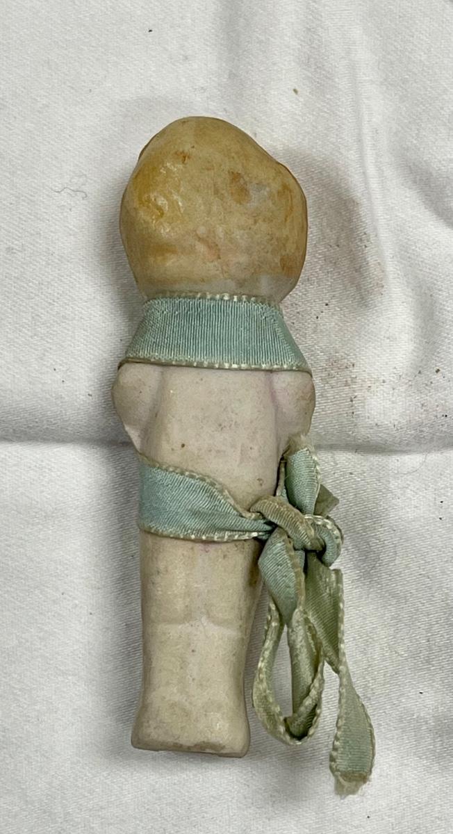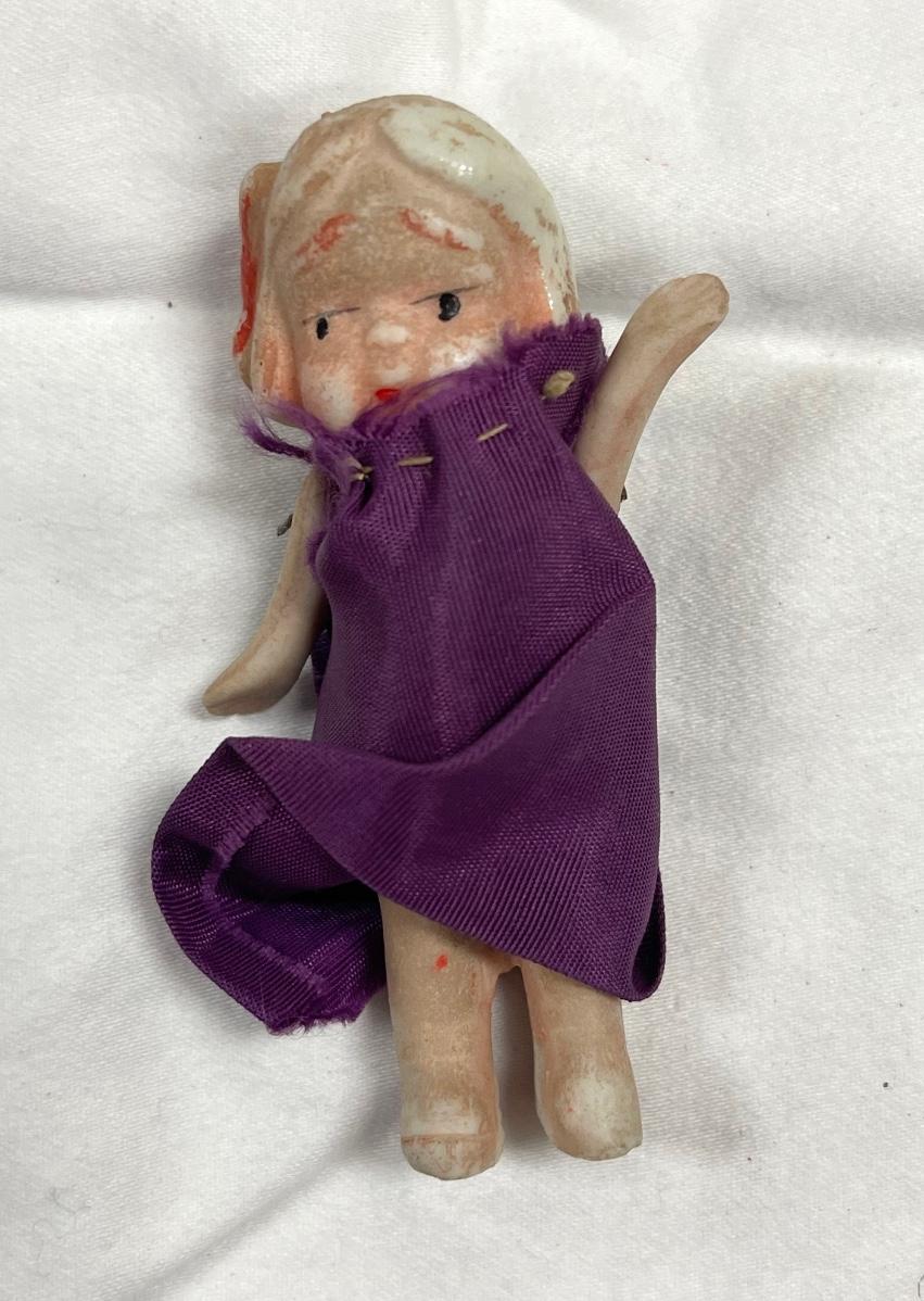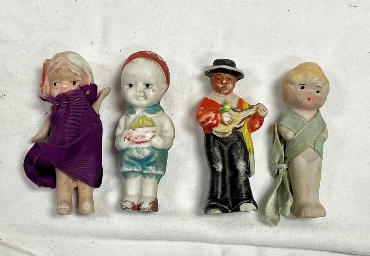Vintage Set of 4 Bisque Porcelain Small Dollhouse Doll Figurines. Various styles of dolls, in different stages of condition. About 4" size.