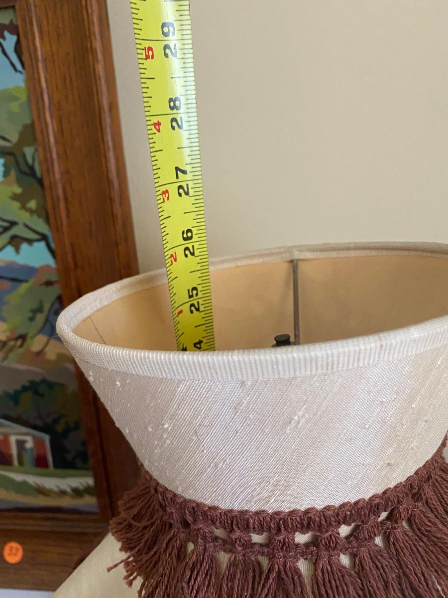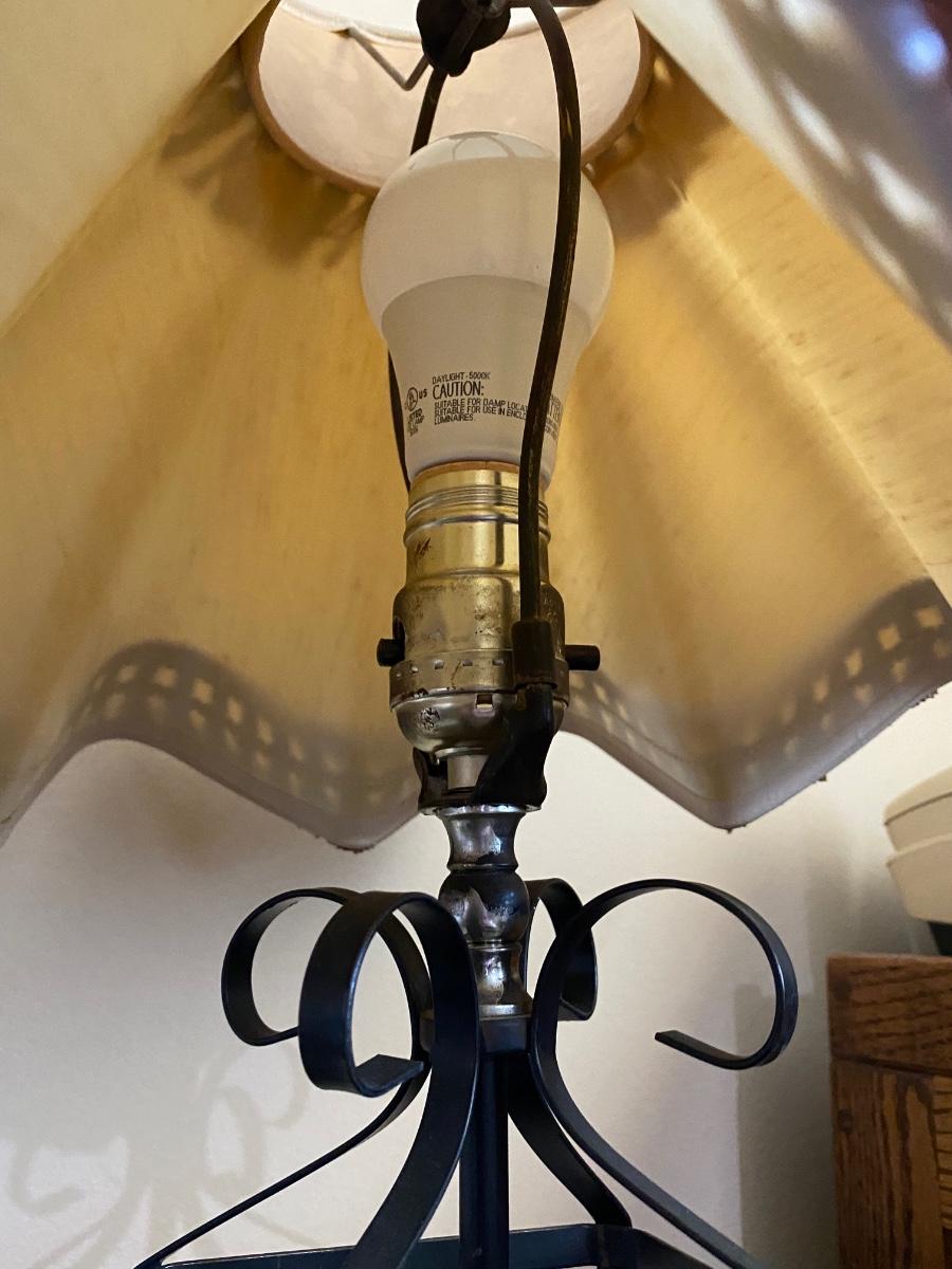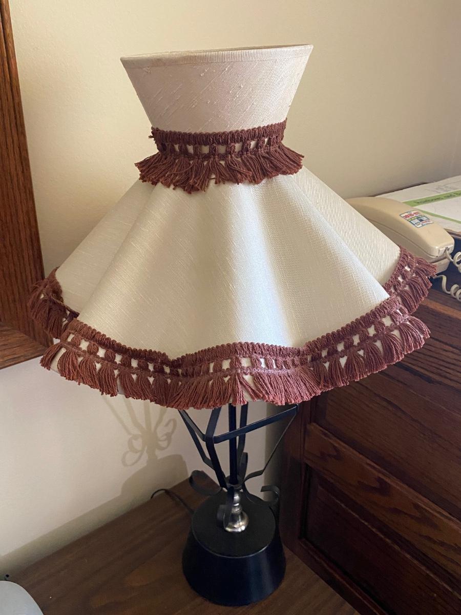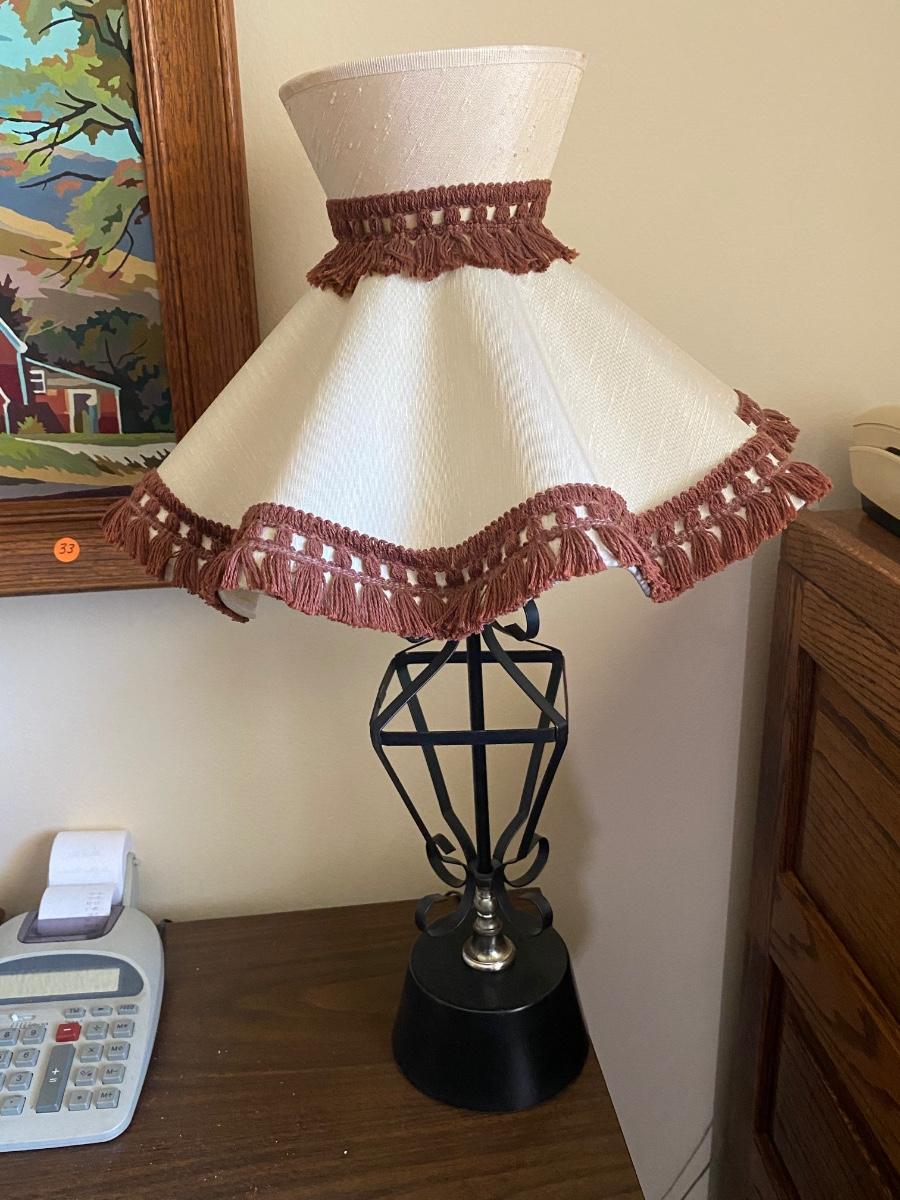 Vintage Country Cottagcore Black Metal Table Lamp with Ruffled Lamp Shade. Interesting lamp and shade combination. Lamp works. About 26" top of shade.
