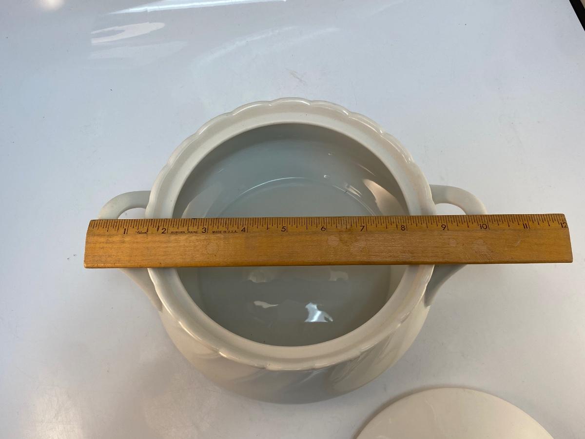 Porcelain White Swirled Lidded Double Handle Casserole Soup Tureen Yorkshire Japan. In good condition. No chips or crazing noticed. 10" wide handle to handle and about 4.5" deep dish.