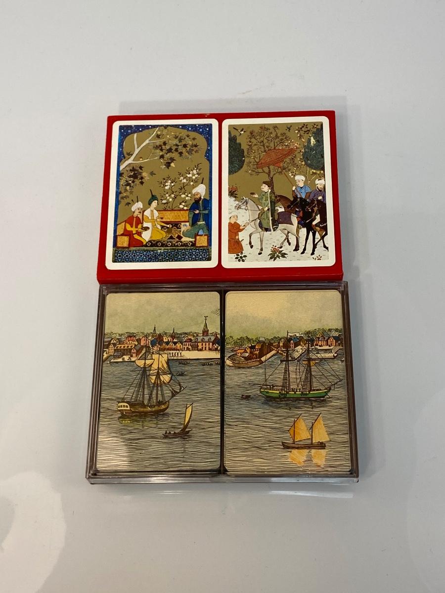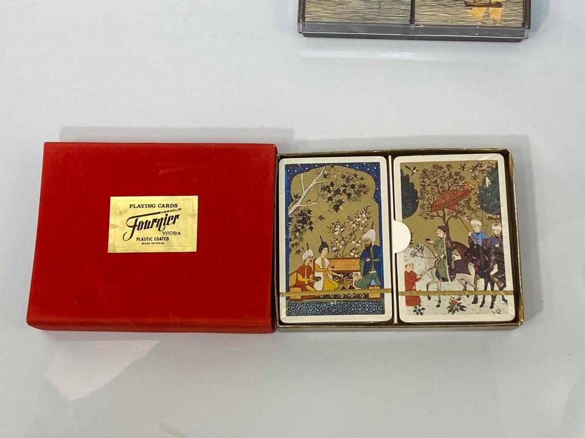 Vintage Sets of Playing Cards Nautical Ships Fournier Spain Velveteen Box Unopened. Both sets are in good condition. The Fournier set is unopened.
