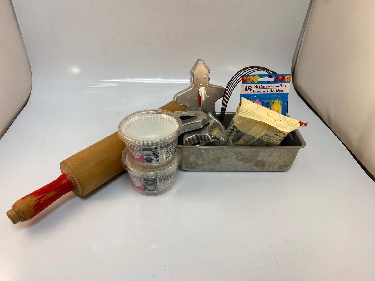 Vintage Baking Lot Wood Rolling Pin Cupcake Wrappers Cookie Cutters Candles