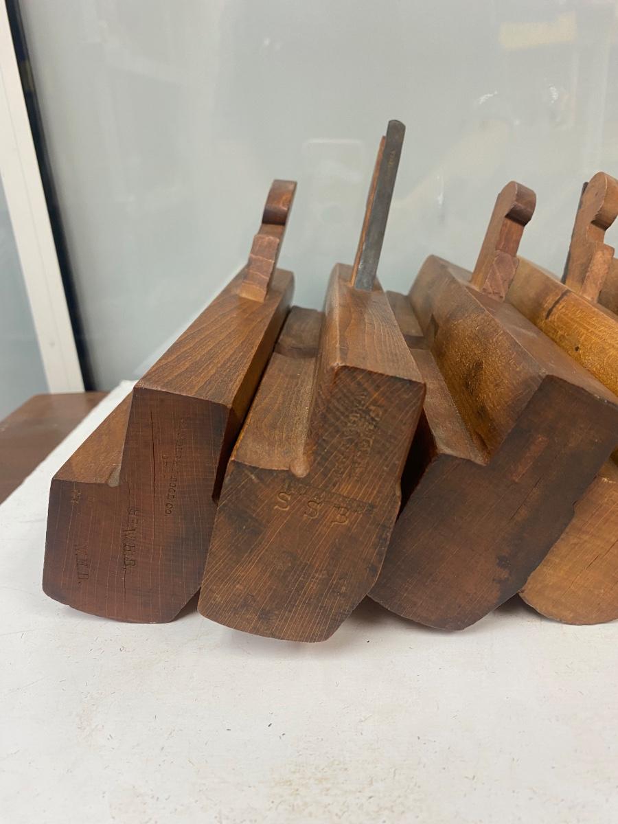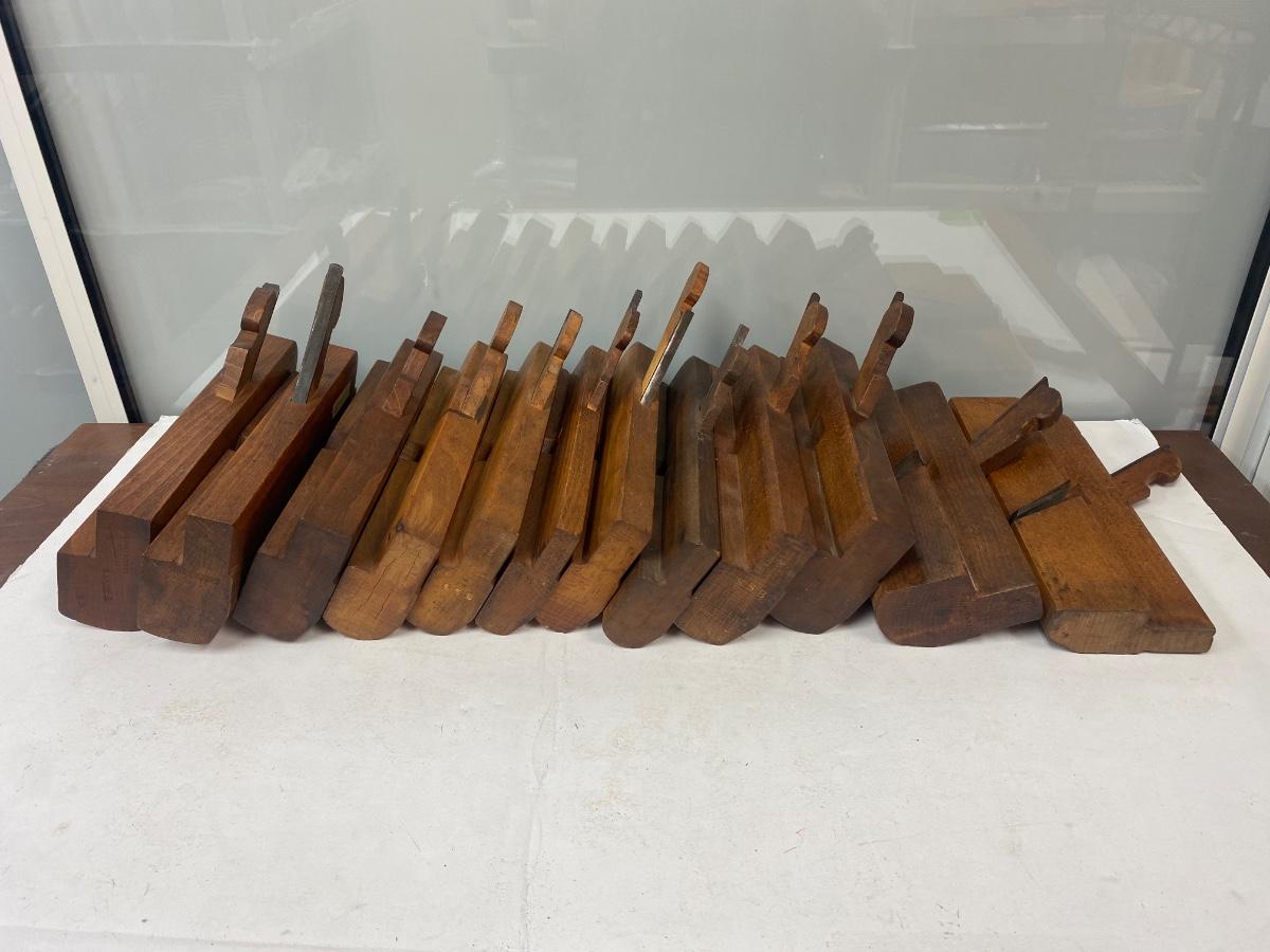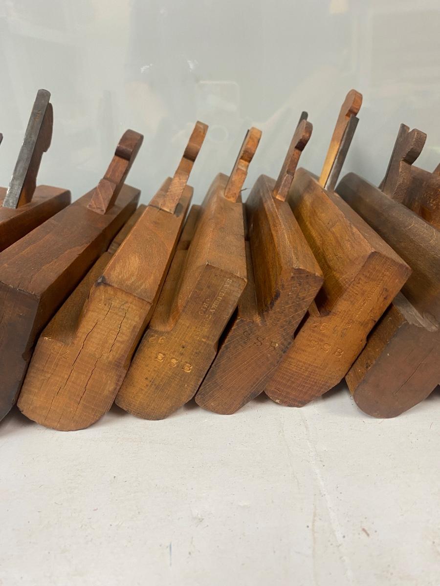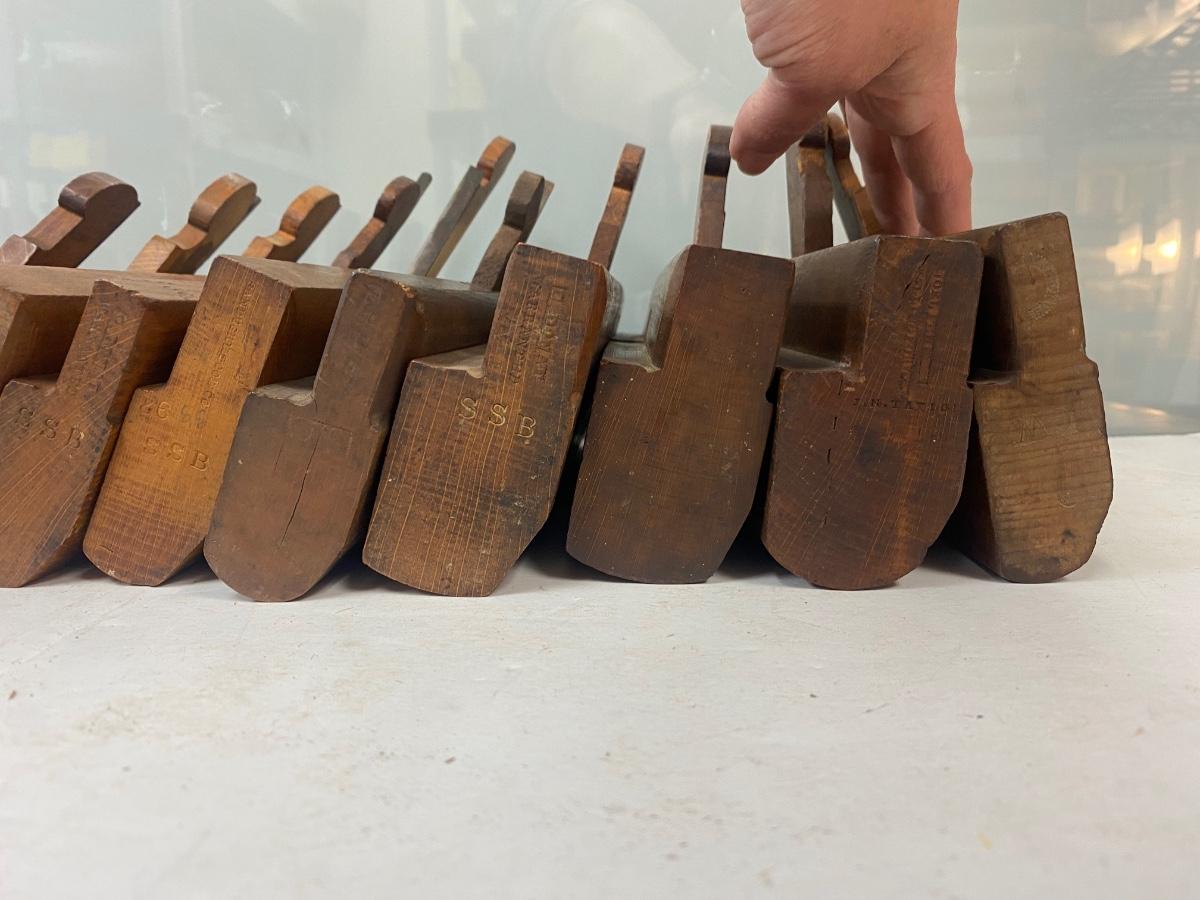 Lot of 12 Wooden Moulding Trim Planes Curved Blade Woodworking Hand Tools. Various sizes, some may be the same. Previous owner/maker and size may be stamped in the end.