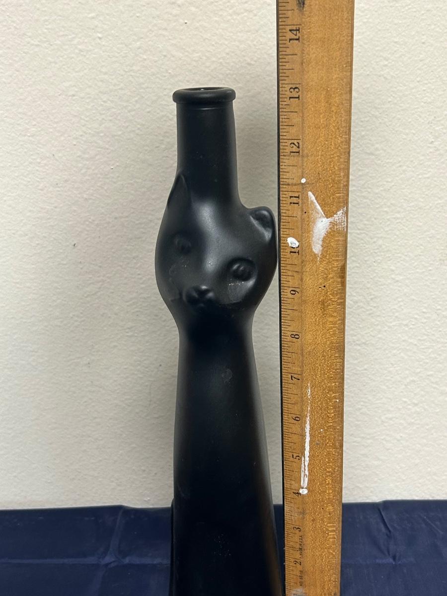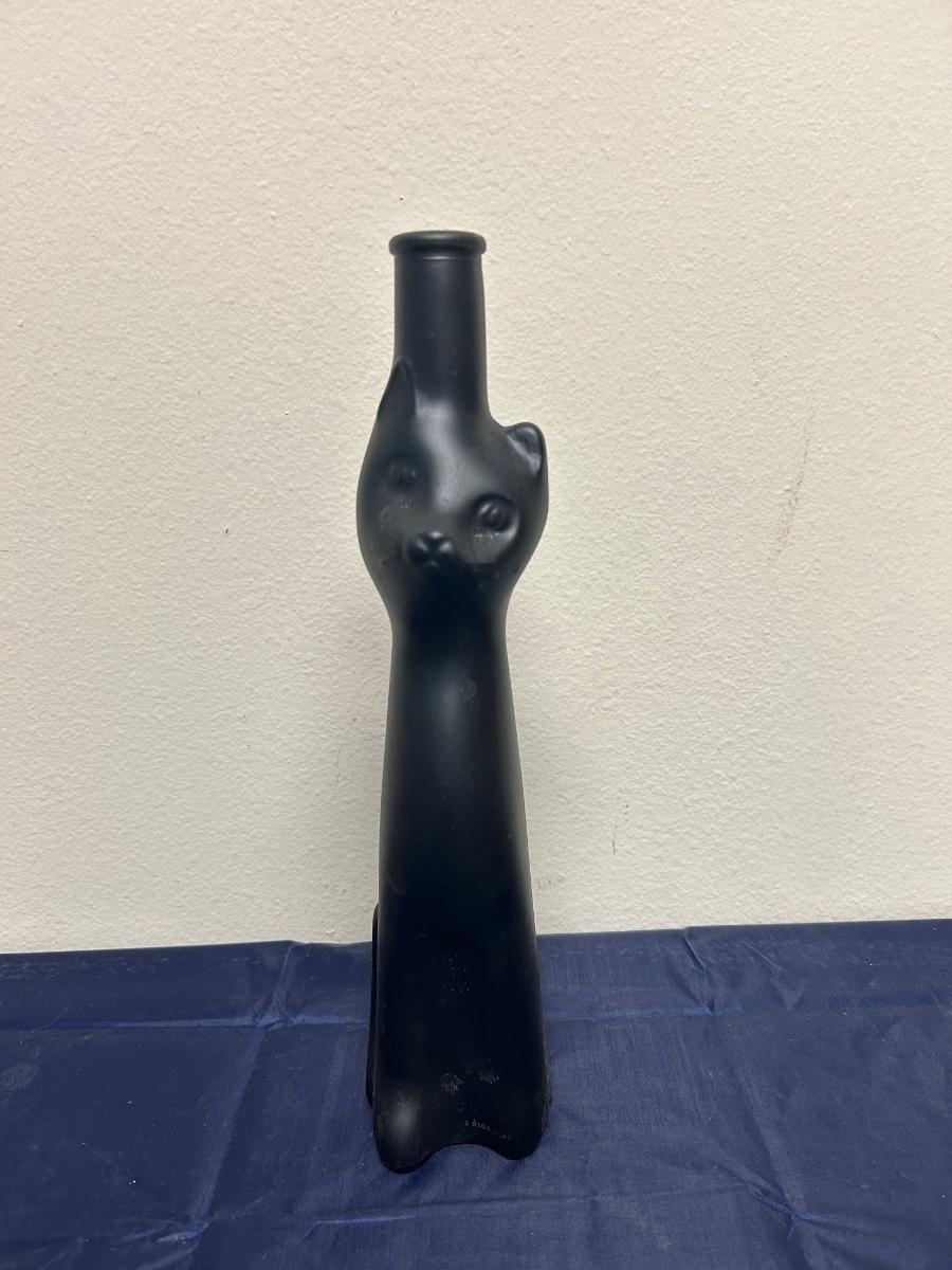 Vintage Retro Mosel Saar Ruwer Riesling Black Satin Glass Cat Shaped Wine Bottle. In good condition. About 13" size.