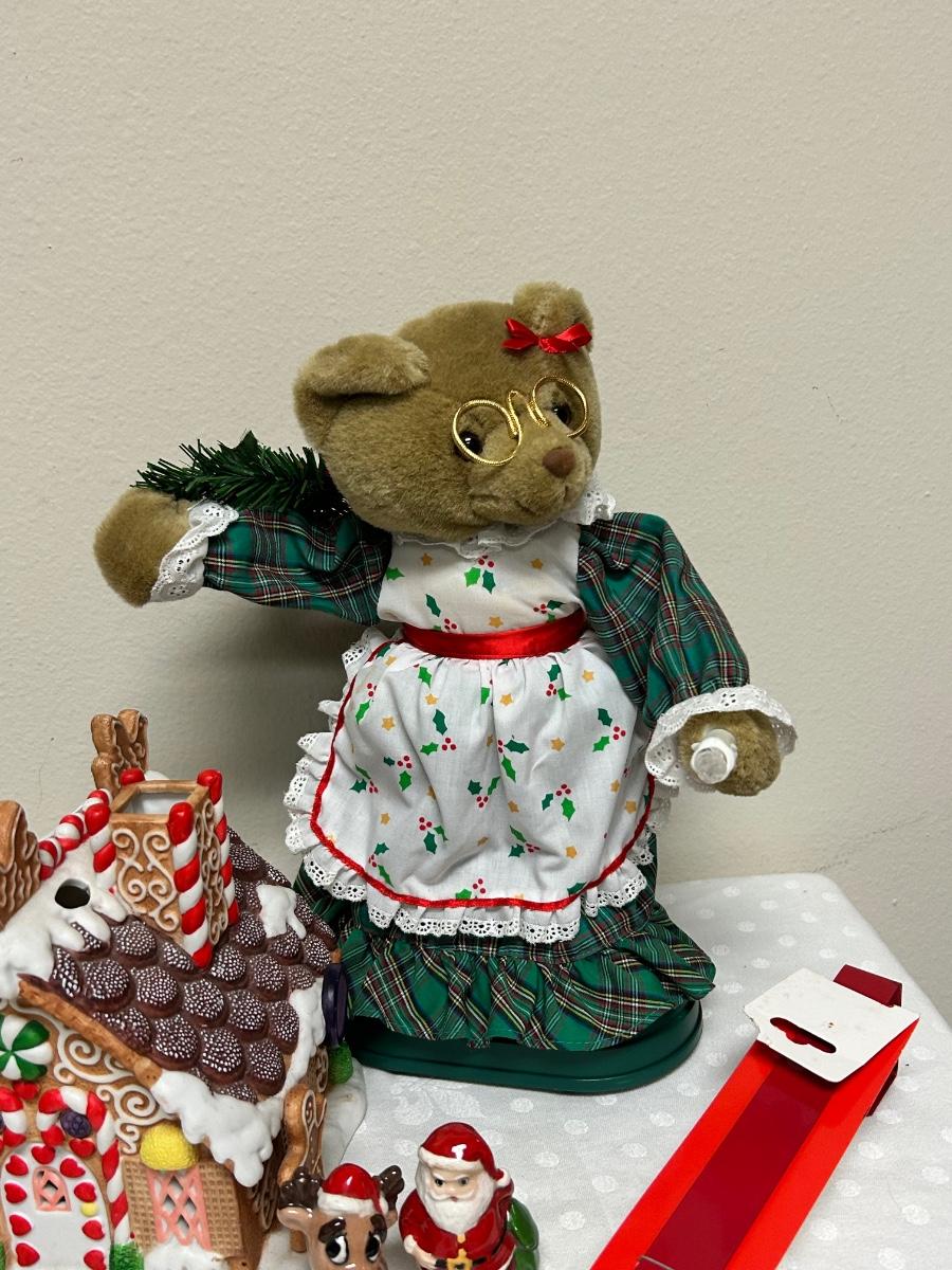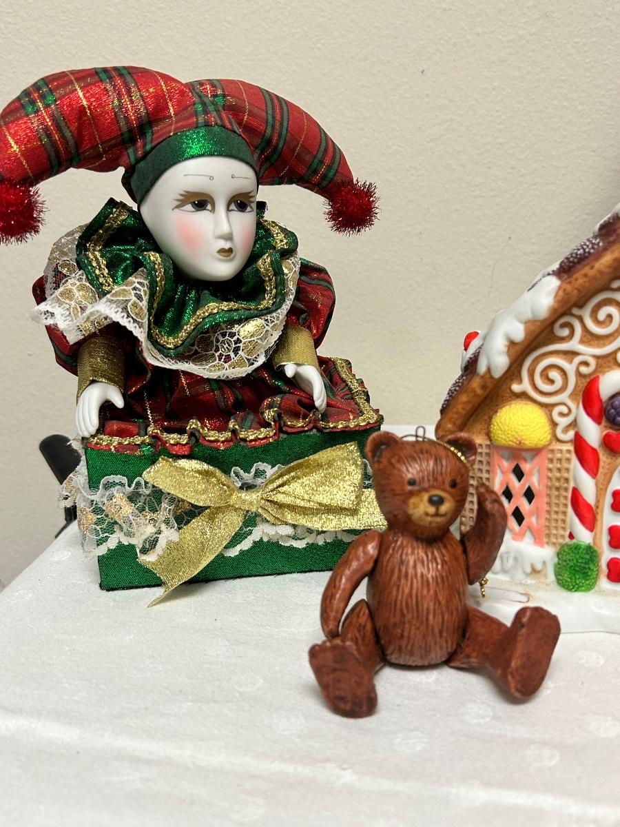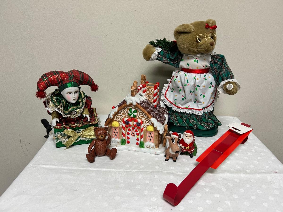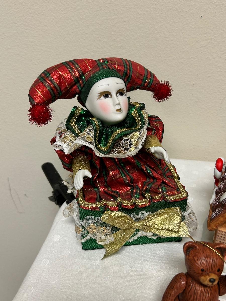 Mixed Holiday Christmas Decor Lot. The jester is a music box and works. The bear can play music and the candle lights up, it works.