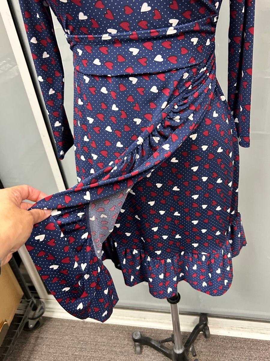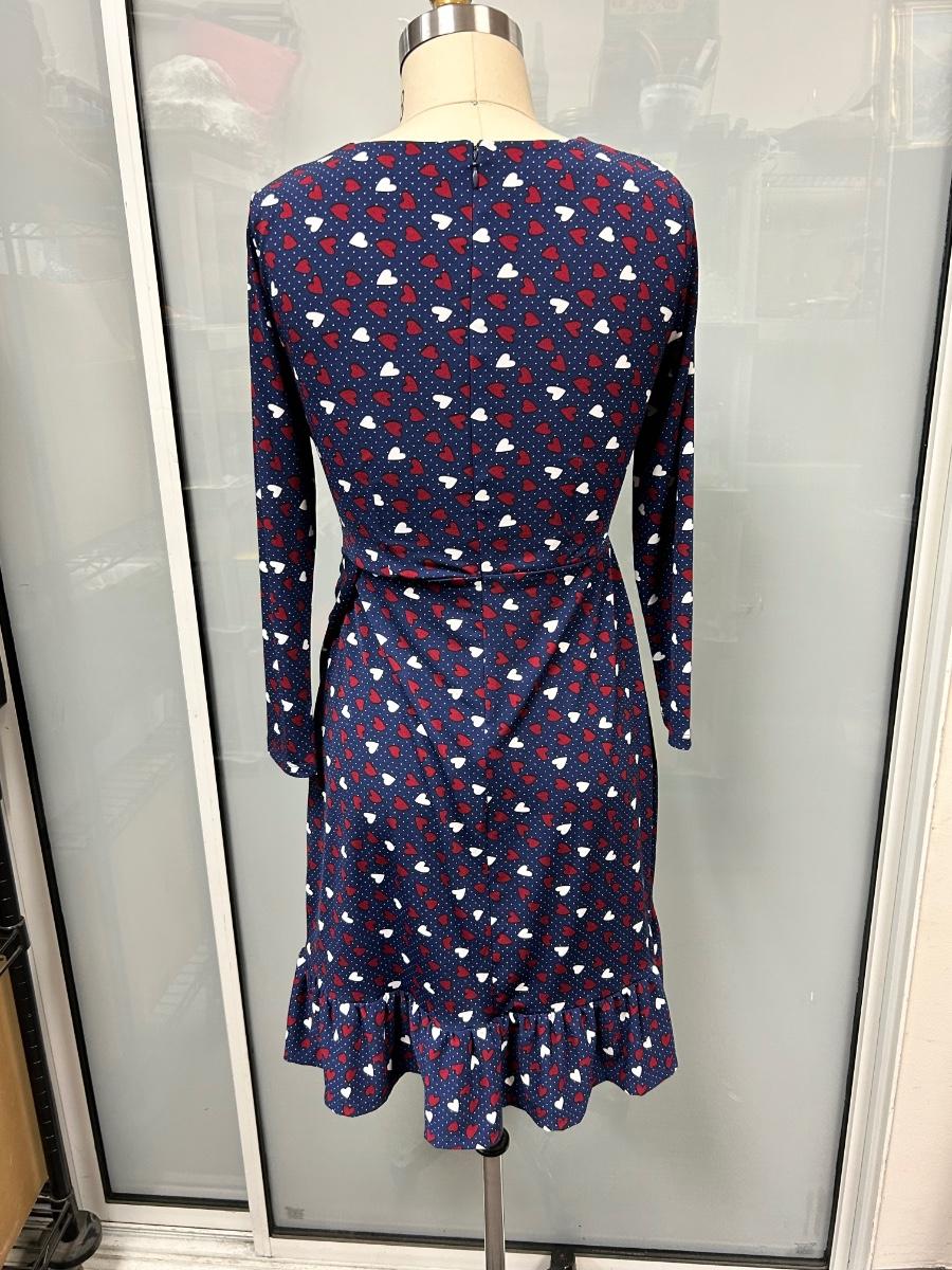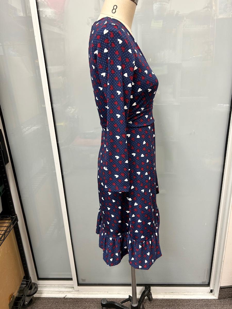 Flirty Talbots Petite Size 2 Navy Blue with Red Hearts Ruffled Edge Dress. Super cute. Stretchy material. In good condition.