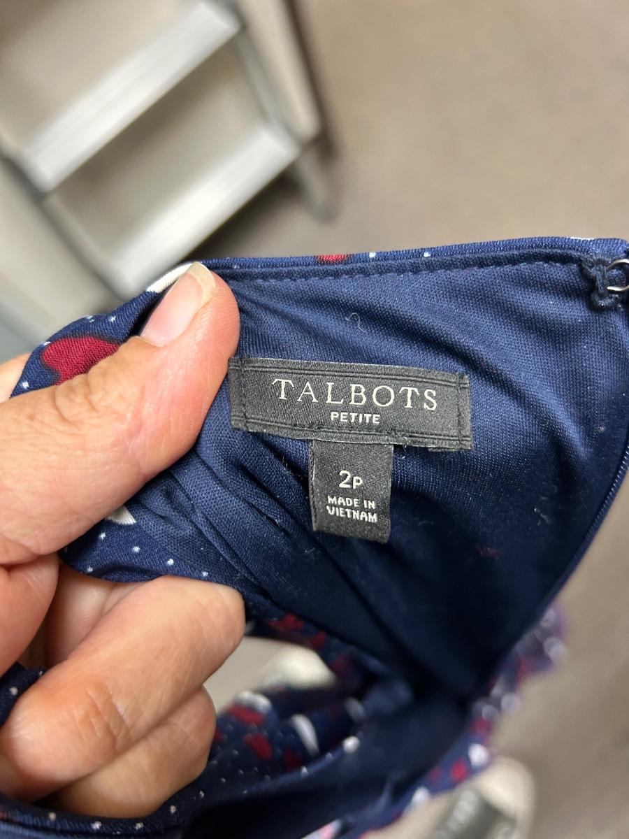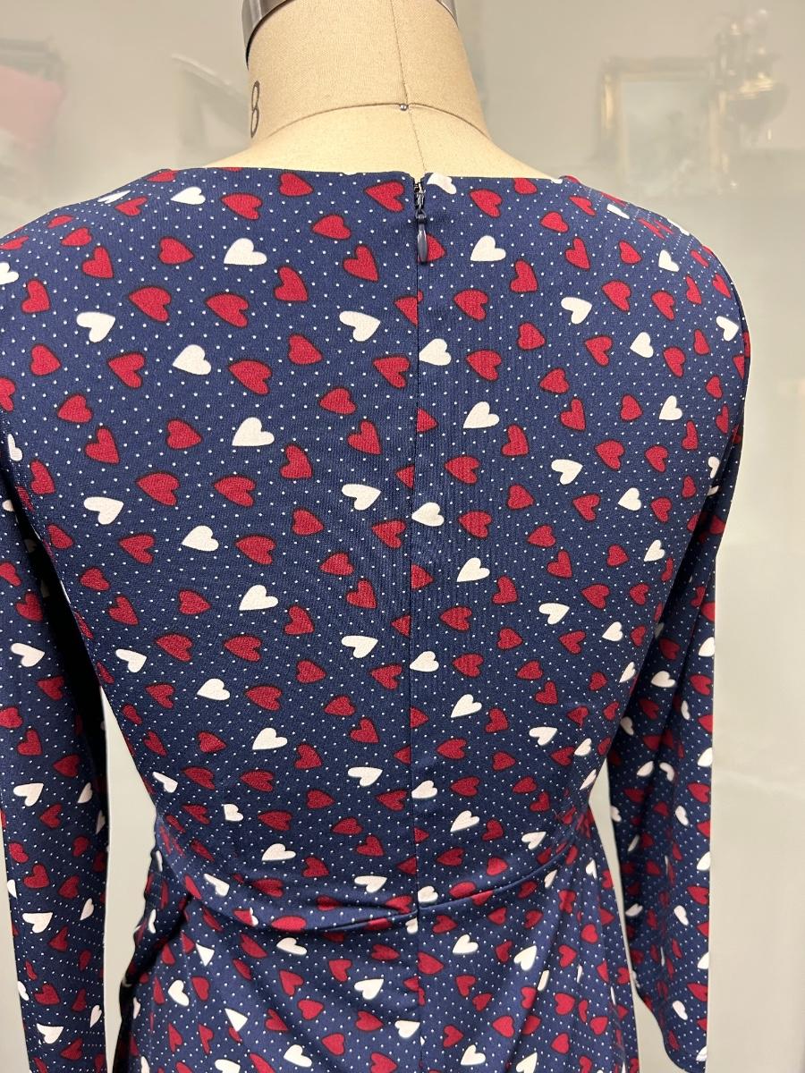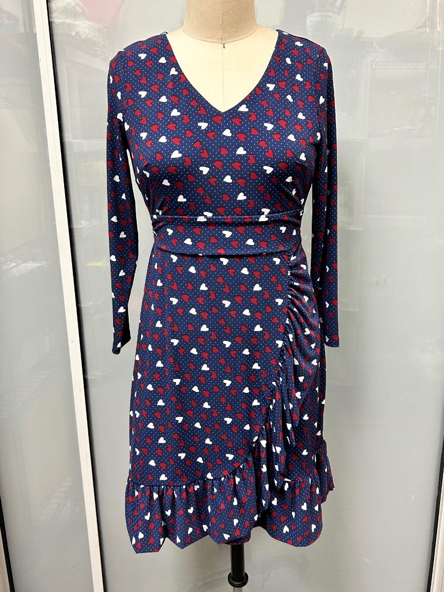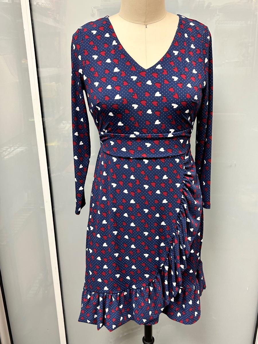 Flirty Talbots Petite Size 2 Navy Blue with Red Hearts Ruffled Edge Dress. Super cute. Stretchy material. In good condition.