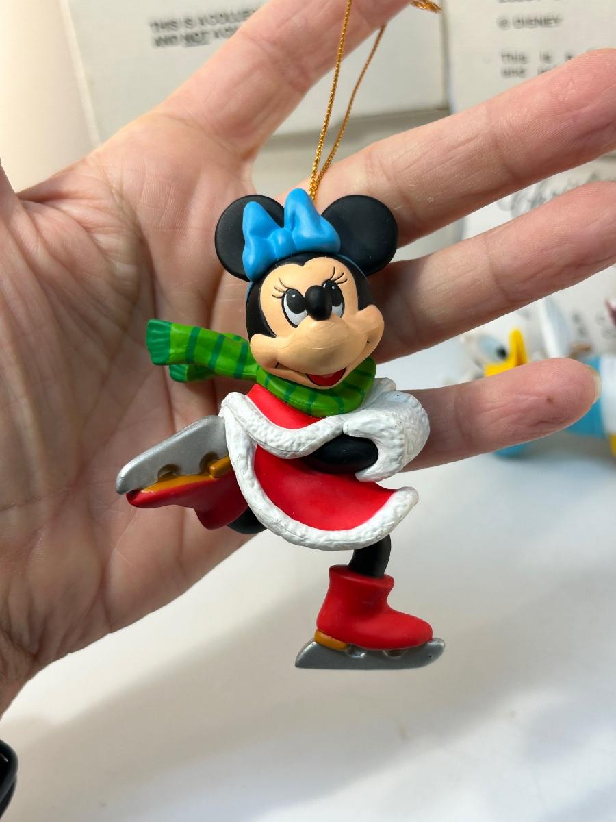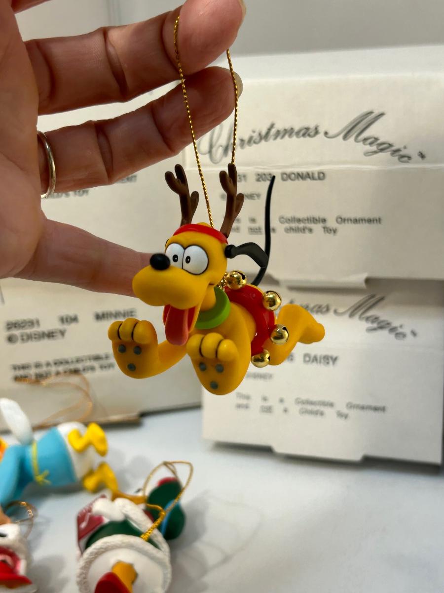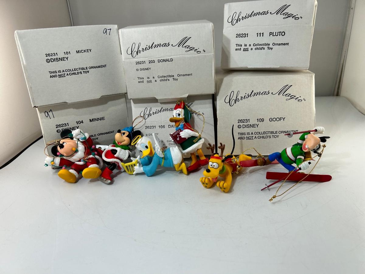 Classic Walt Disney Character Christmas Magic Holiday Tree Ornaments Mickey Minnie Donald Daisy Pluto Goofy. All are in good condition. Each with their own box. Made from a hard plastic, under 5" size.